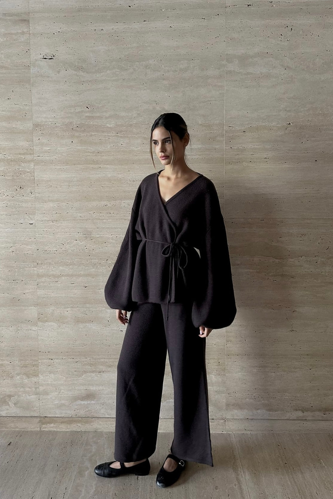 Introducing the Azalia Set in trendy dark aubergine. This set epitomizes minimalist elegance with its smooth, flowing fabric and impeccable tailoring. The wide-sleeved, v-neck top offers a modern twist on classic comfort, cinched at the waist by a delicate tie to enhance the silhouette. The ensemble is completed with sleek, wide-leg trousers that promise both comfort and style.