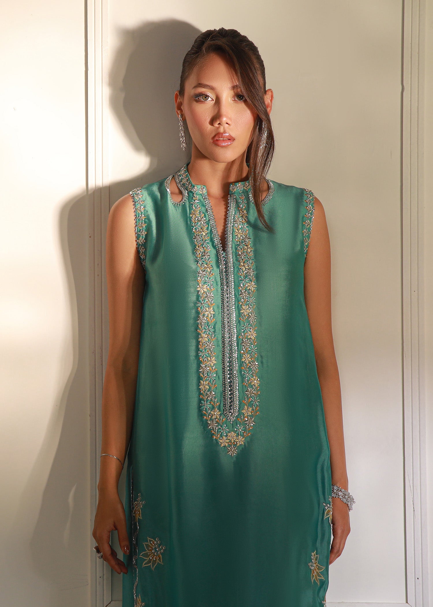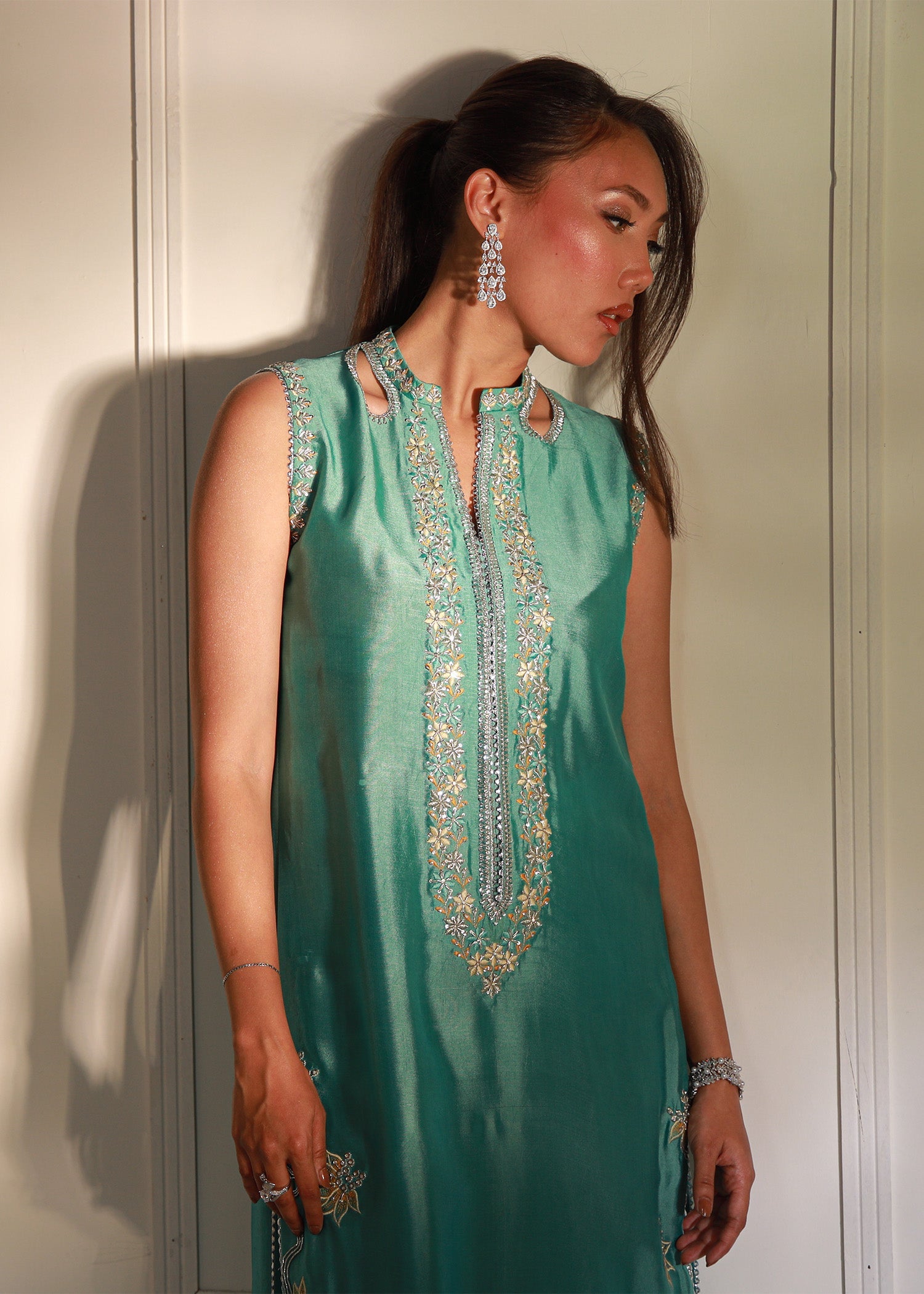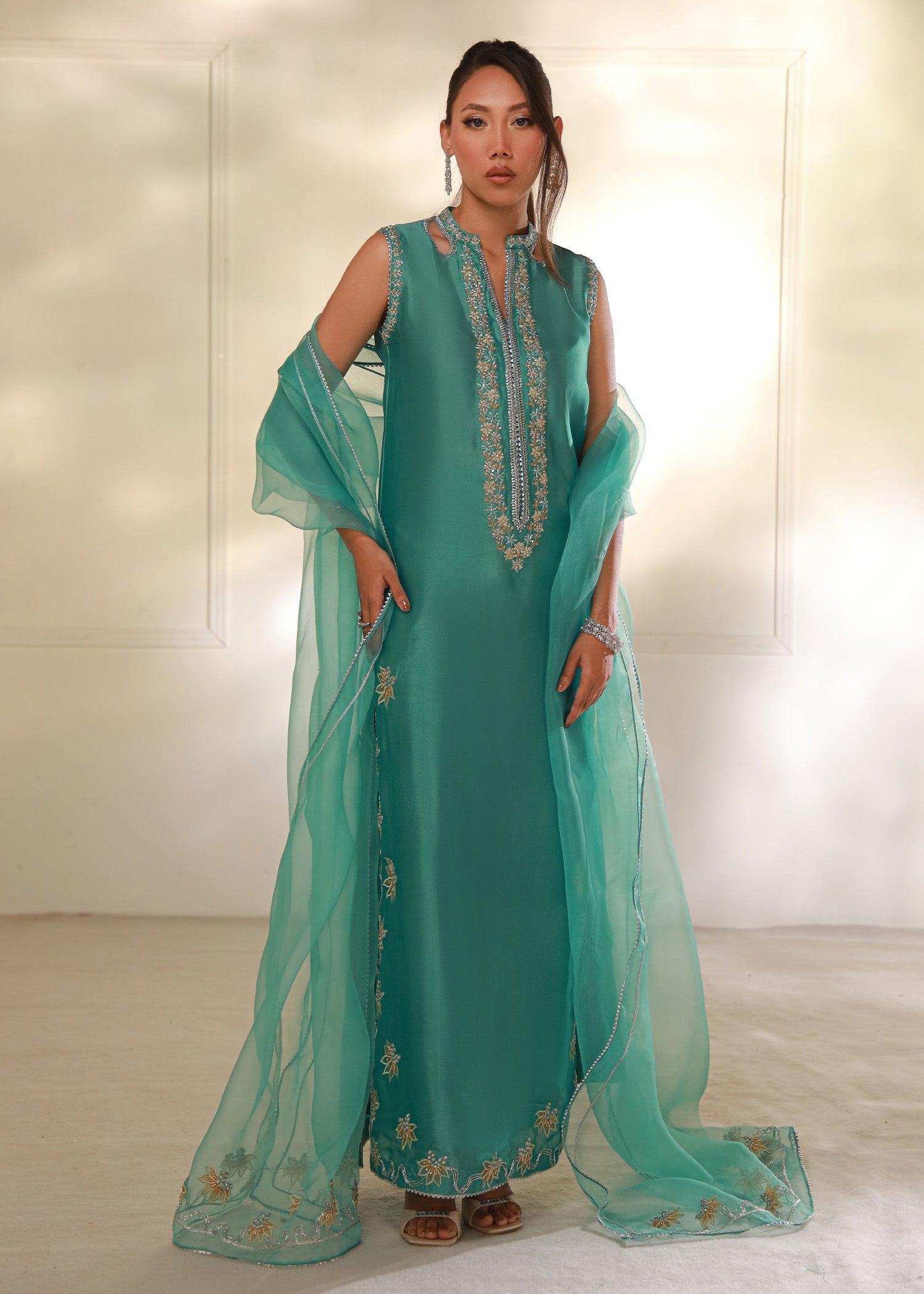 Immerse yourself in timeless sophistication with this turquoise outfit, exquisitely crafted from pure Shisha silk. The sleek silhouette is adorned with delicate embellishment work, adding a refined charm to the ensemble. Side slits and intricate detailing enhance its graceful movement, while the ethereal pure organza dupatta, featuring subtle embellishments, adds a dreamy finish. Perfect for festive occasions or evening soirées, this ensemble strikes the perfect balance between luxury and effortless elegance.