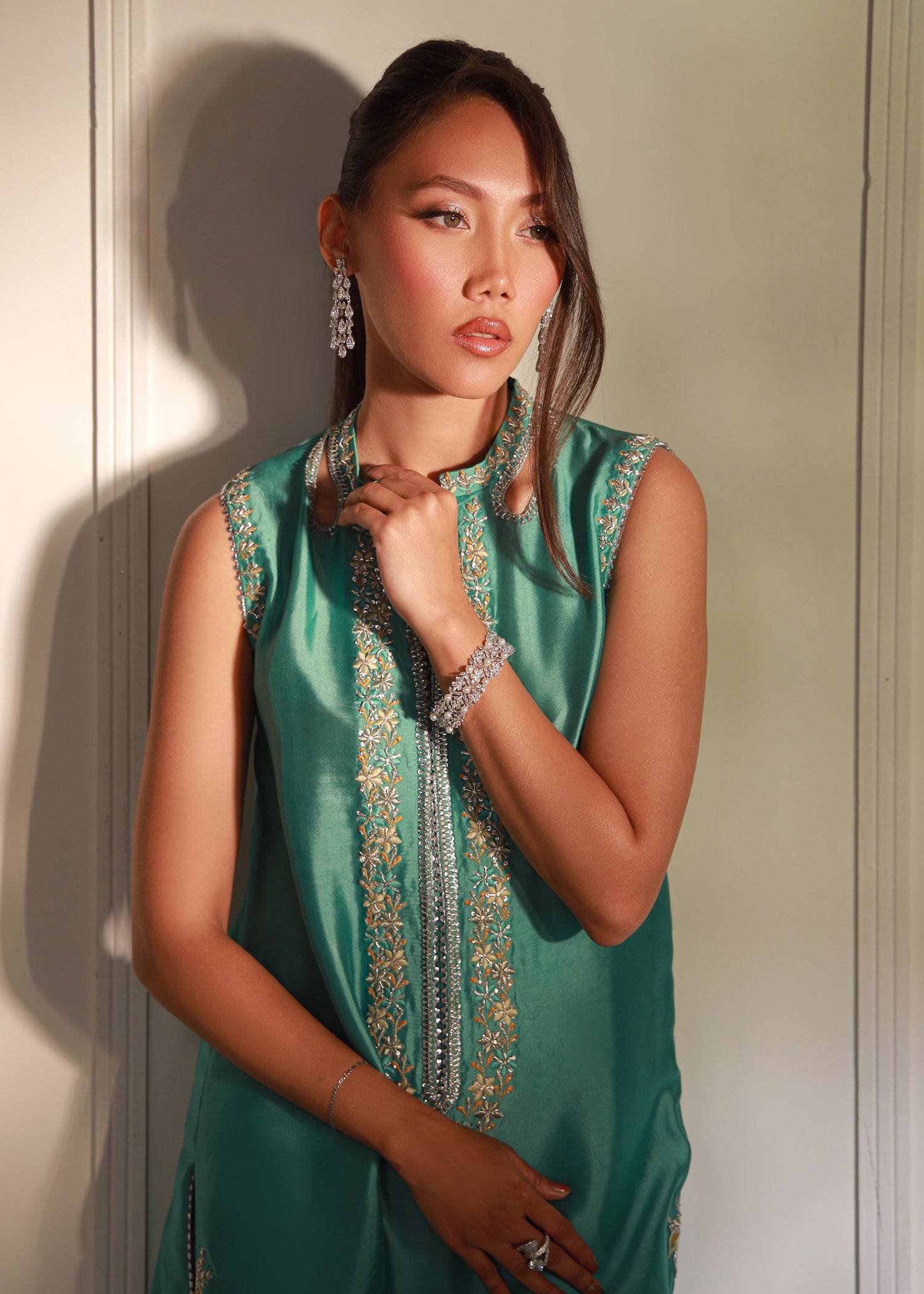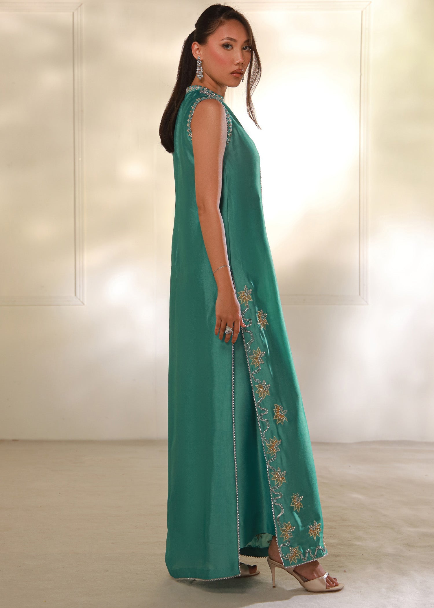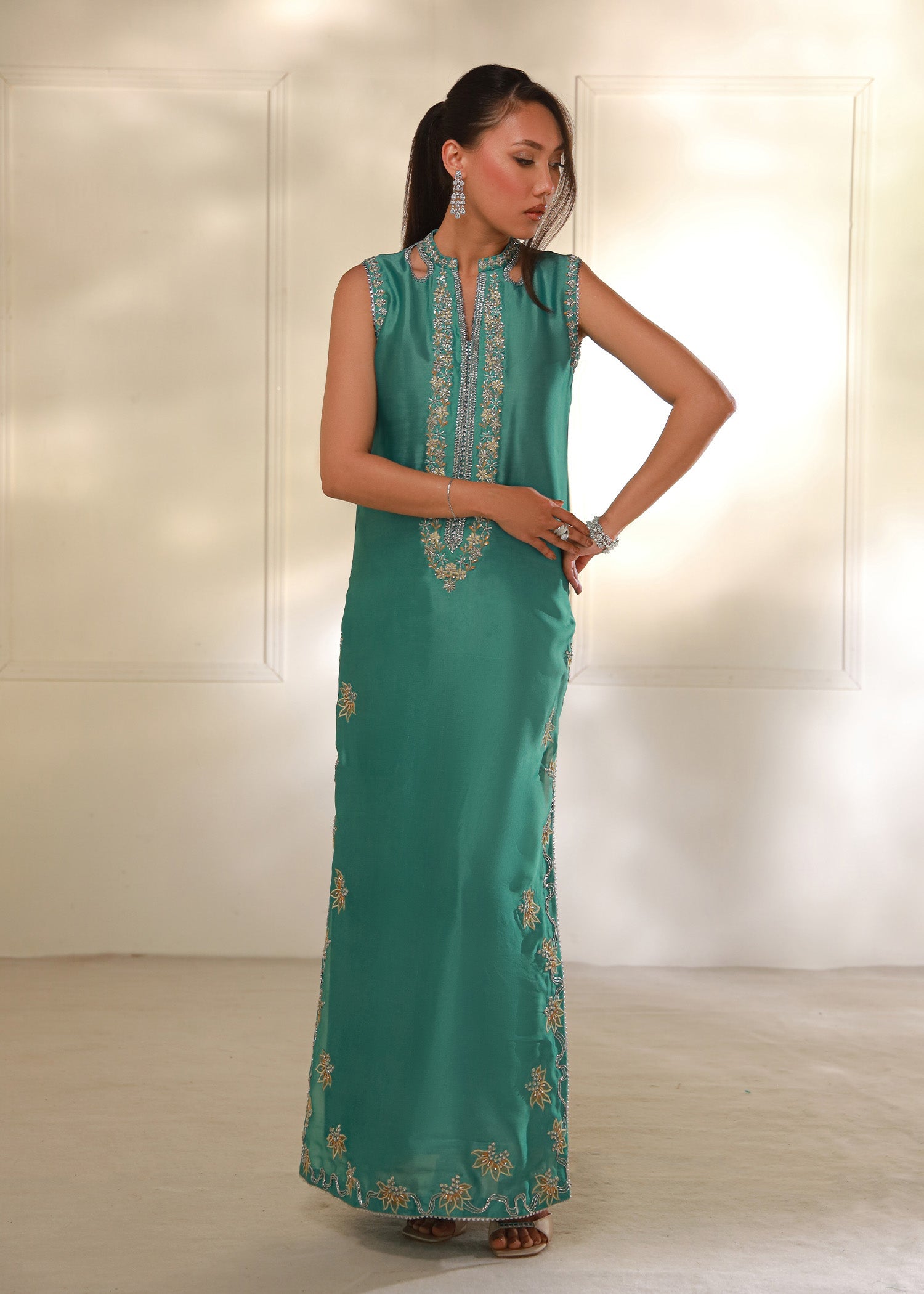 Immerse yourself in timeless sophistication with this turquoise outfit, exquisitely crafted from pure Shisha silk. The sleek silhouette is adorned with delicate embellishment work, adding a refined charm to the ensemble. Side slits and intricate detailing enhance its graceful movement, while the ethereal pure organza dupatta, featuring subtle embellishments, adds a dreamy finish. Perfect for festive occasions or evening soirées, this ensemble strikes the perfect balance between luxury and effortless elegance.