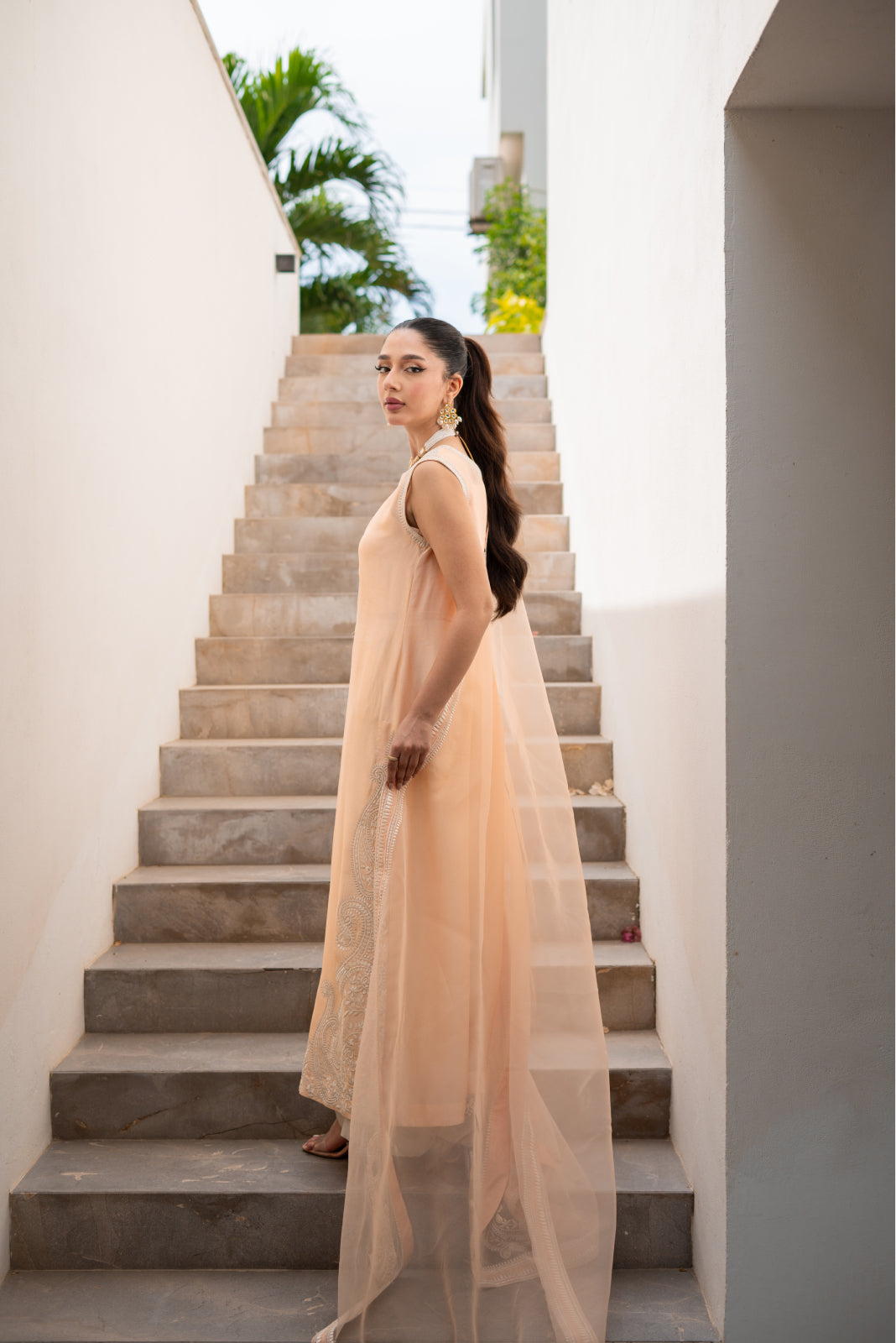 Imprégnée de raffinement, la collection Ahsaas réinvente le luxe sur mesure. Cet ensemble en soie sheesha couleur pêche clair se compose d'une chemise classique richement brodée, pièce maîtresse de la tenue. Associé à un pantalon large et à un dupatta brodé orné d'une délicate dentelle, ce chef-d'œuvre est une ode céleste à l'élégance, qui vous transporte avec grâce dans l'univers des contes classiques.
