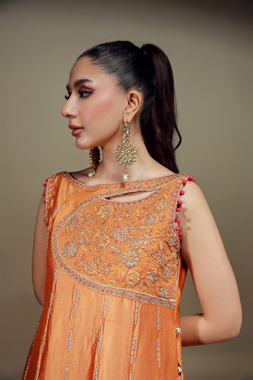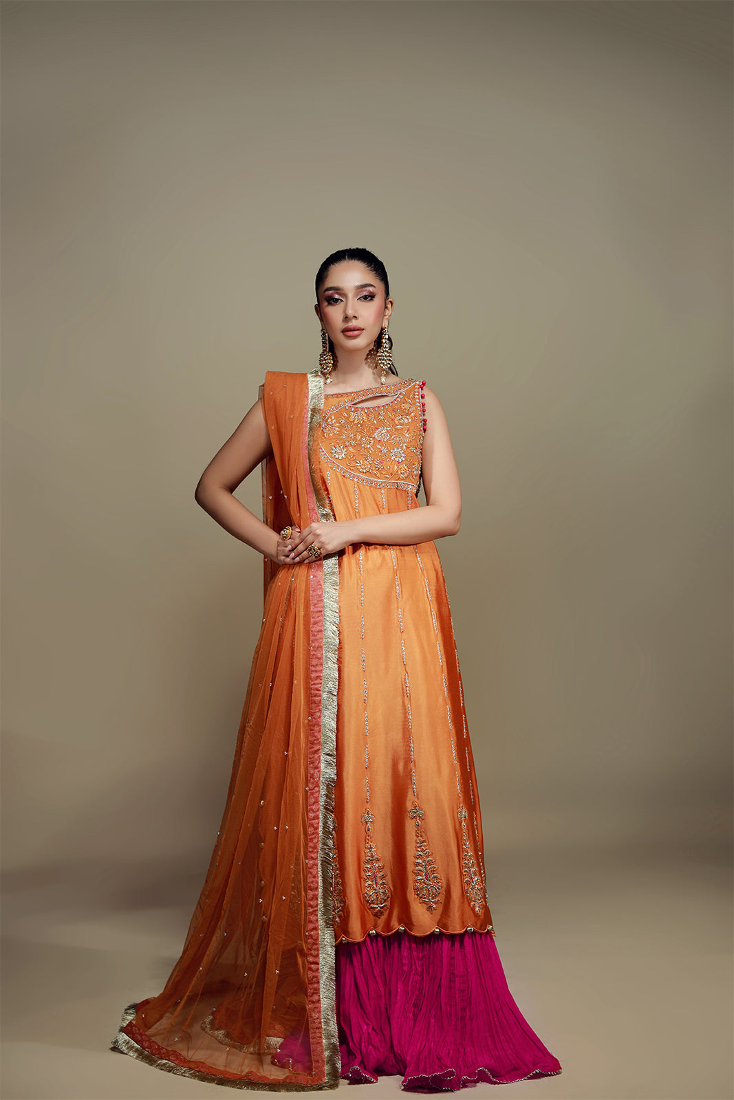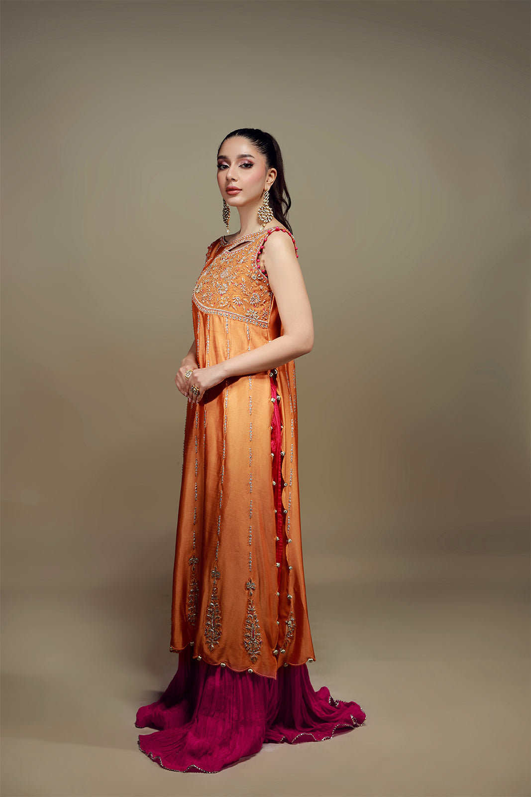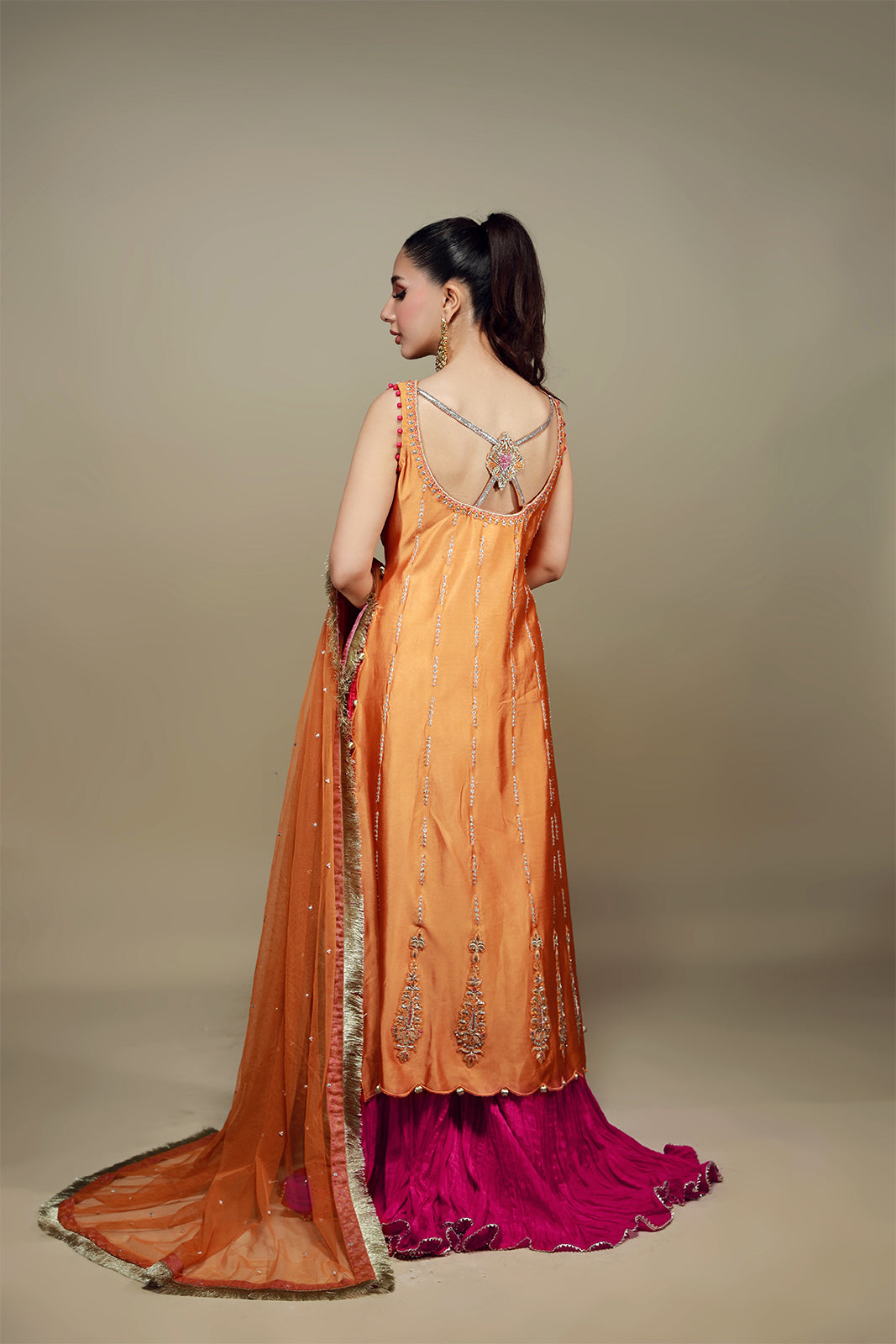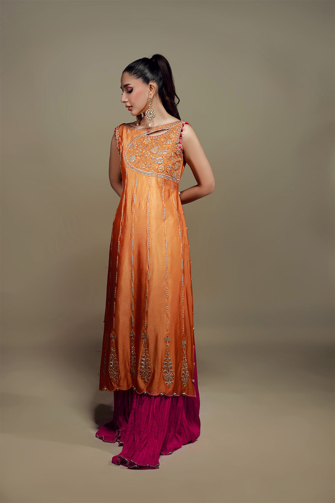 Cette chemise en soie mandarine audacieuse allie avec brio tradition et modernité. De délicates nuances de fuchsia, d'orange et d'or sont tissées avec finesse en de captivants motifs de vigne, ornés de broderies zardozi, gota et de sequins. Ces ornements embellissent l'encolure et l'ourlet festonné, tandis que le dos présente des détails exquis. Portée avec un pantalon izhaar fuchsia, cette tenue respire l'élégance et l'avant-garde.