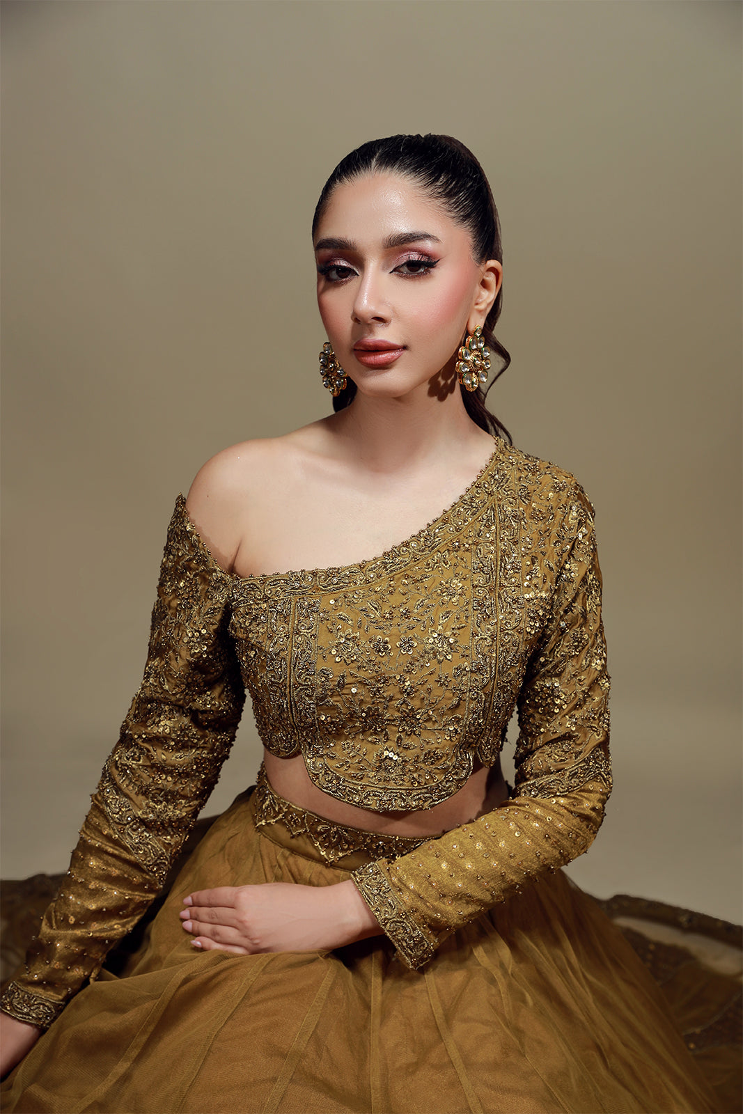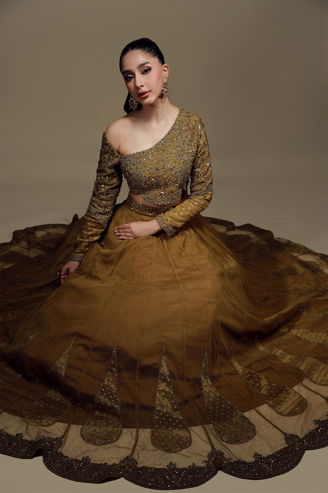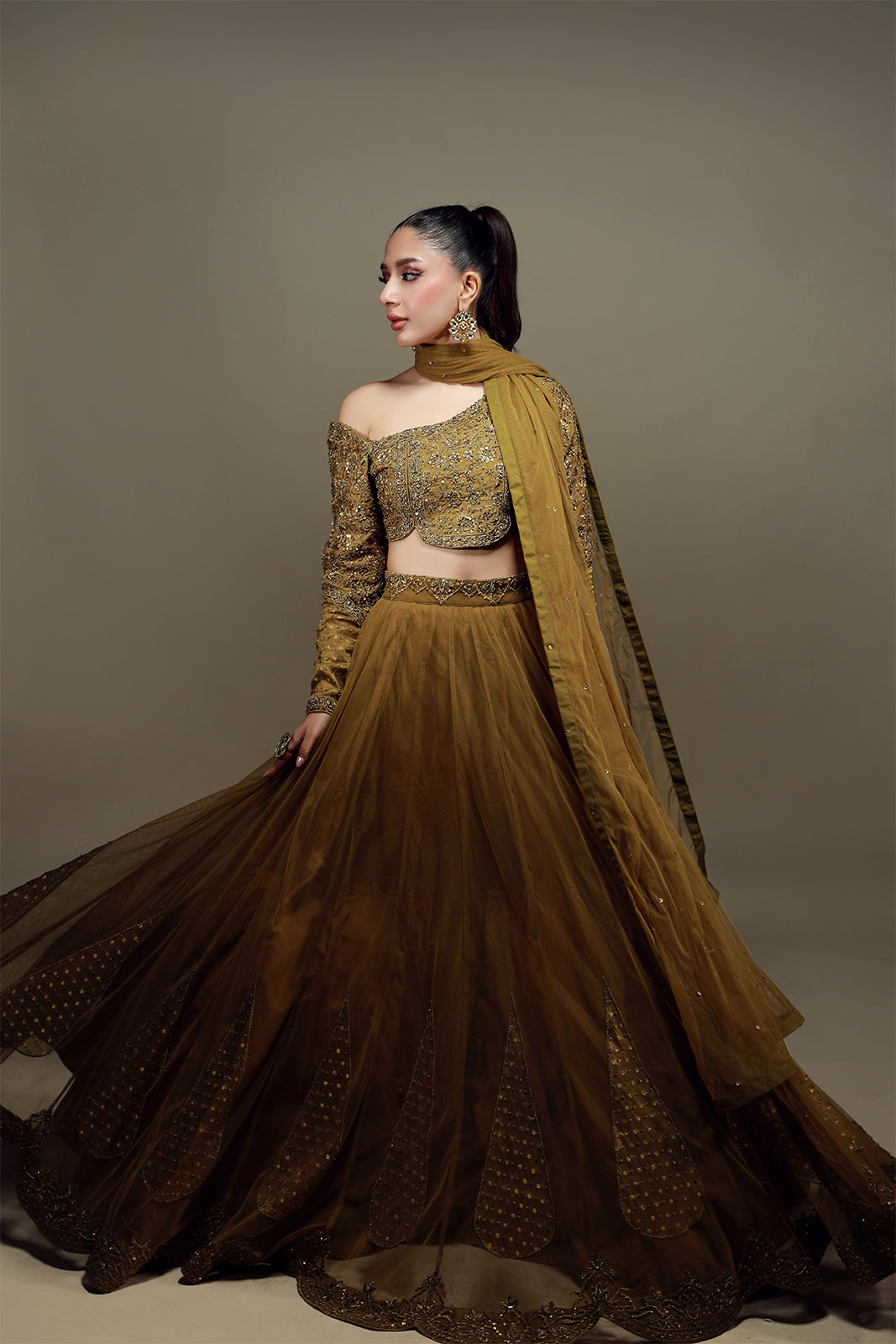 Ce choli classique, orné d'une encolure travaillée et élégamment travaillée, rehaussée de délicates broderies zardozi, s'accorde avec un dupatta en tulle français, orné de pompons raffinés. Sublimez votre tenue avec notre lehenga en tulle français, dont la bordure festonnée, minutieusement travaillée, incarne le raffinement et la grâce.