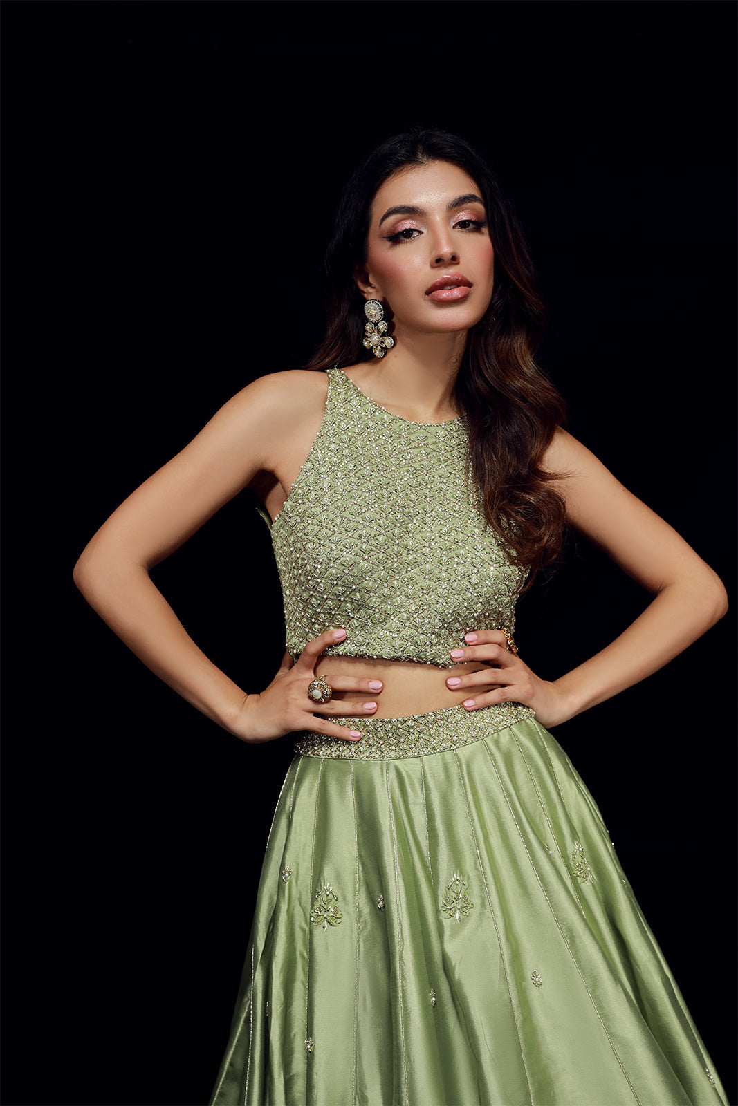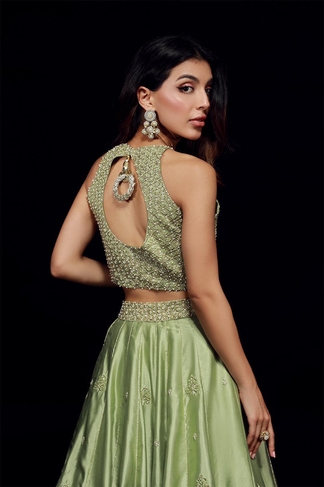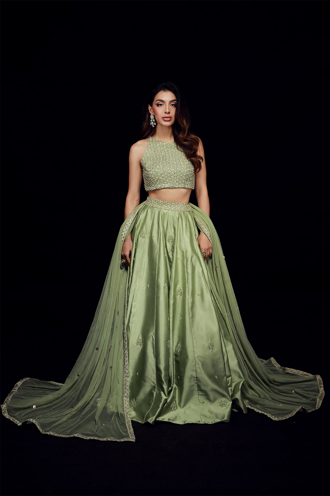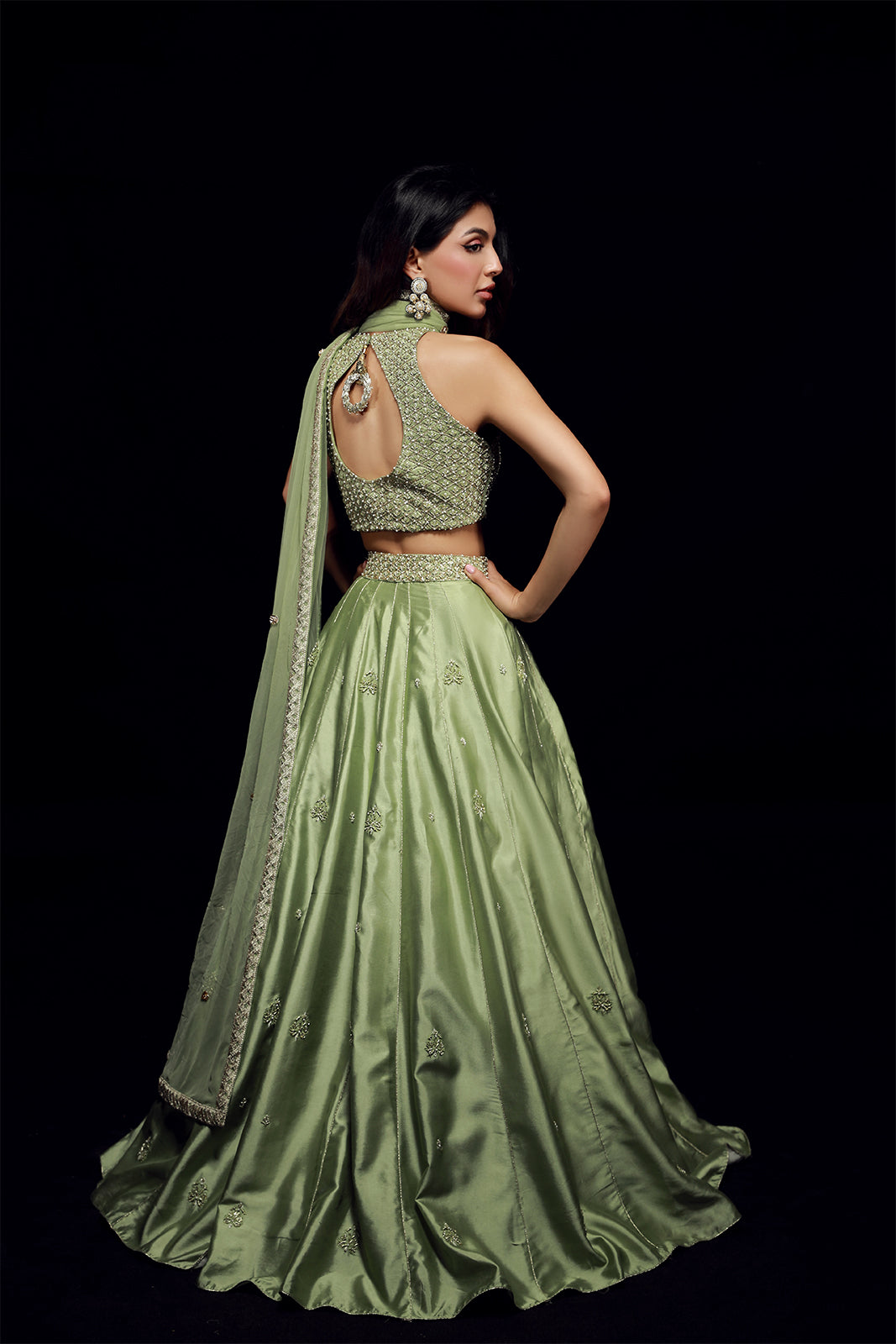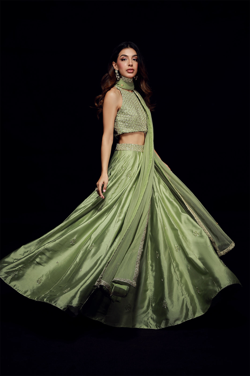 Un lehenga en pure soie sheesha couleur céladon, orné de broderies charma dori sur les panneaux et de motifs booti, est minutieusement détaillé avec des finitions zardoze et resham sur le choli. Un dupatta en tulle français, agrémenté de détails gota épars et de bordures assorties, complète l'ensemble.