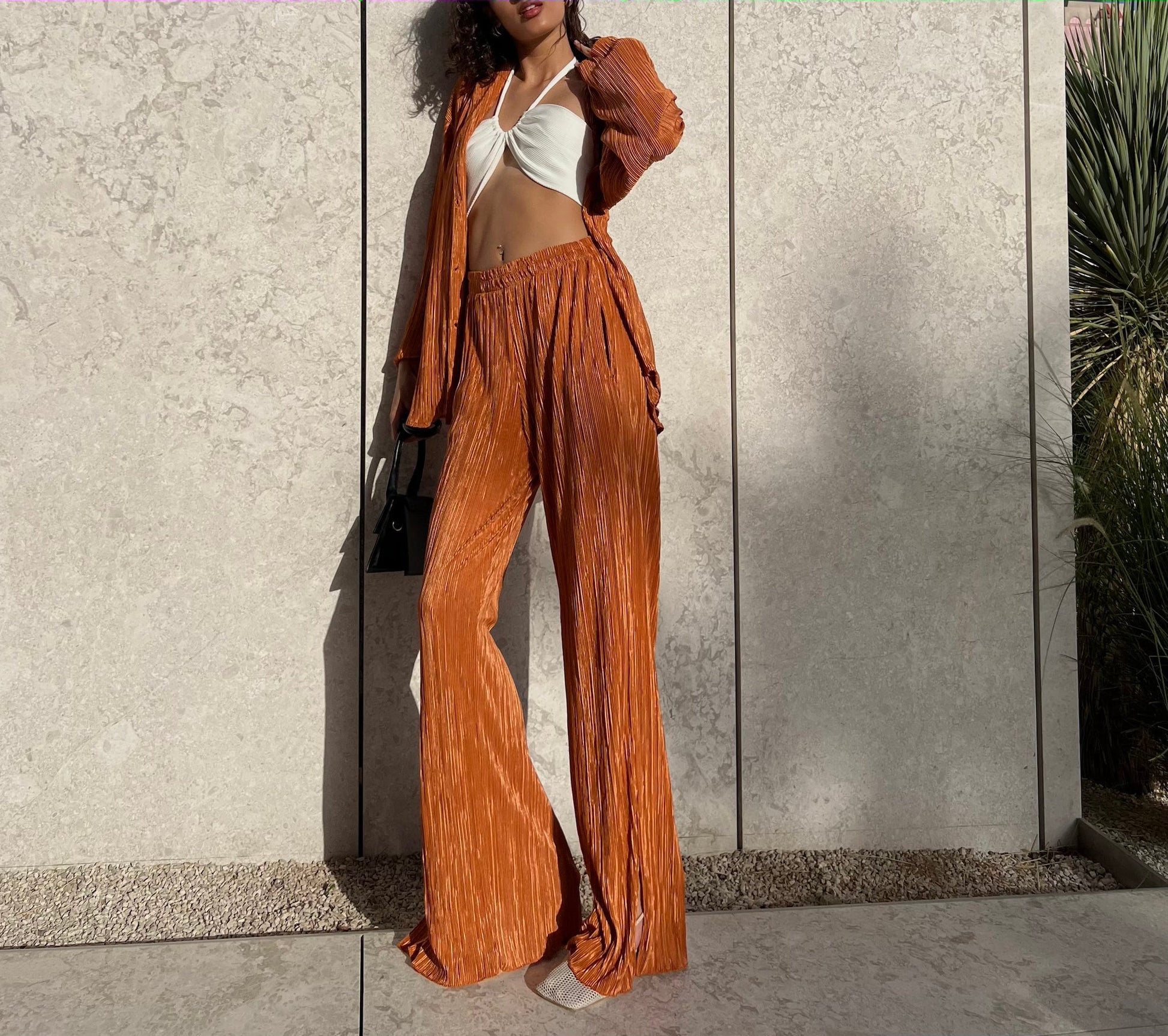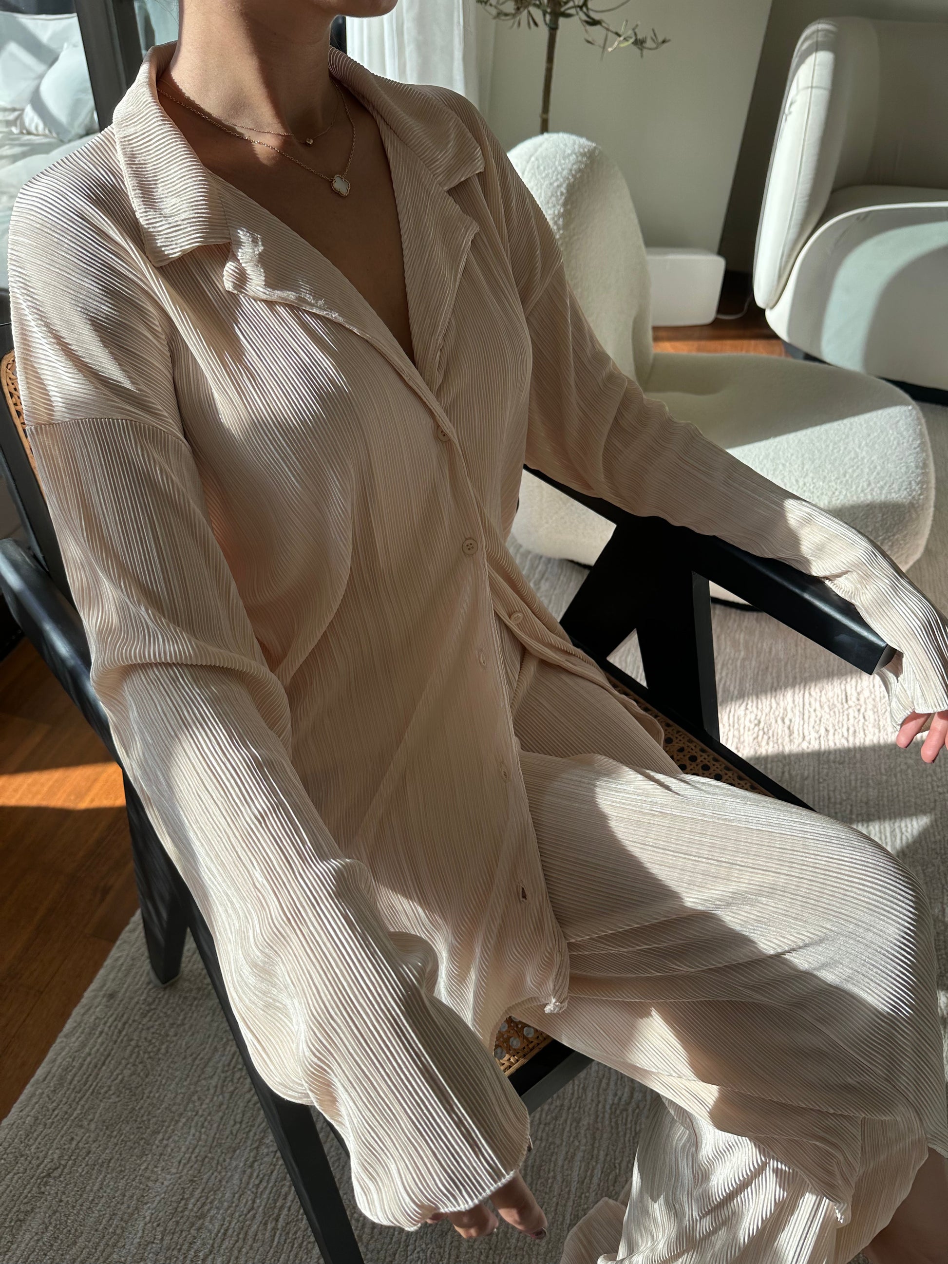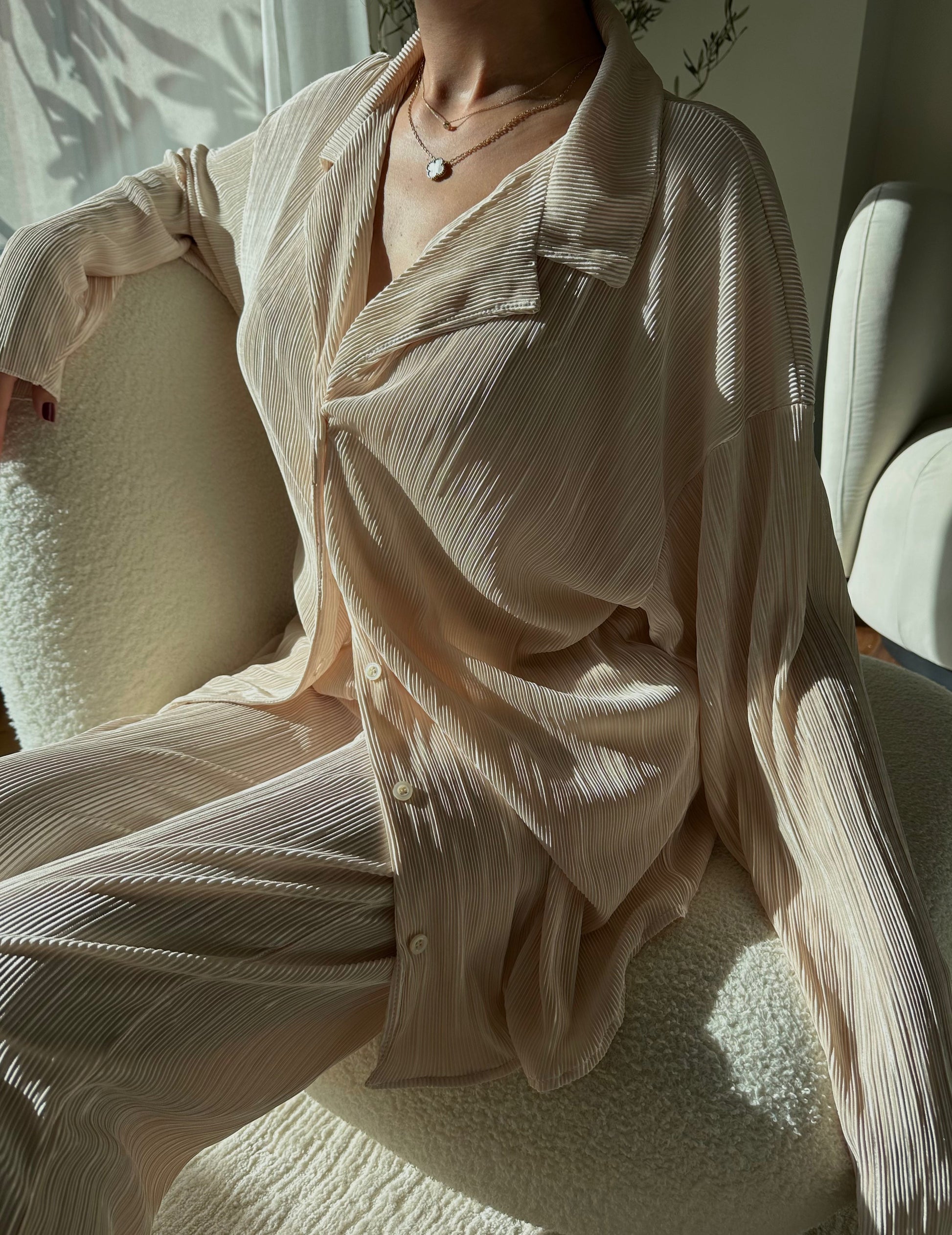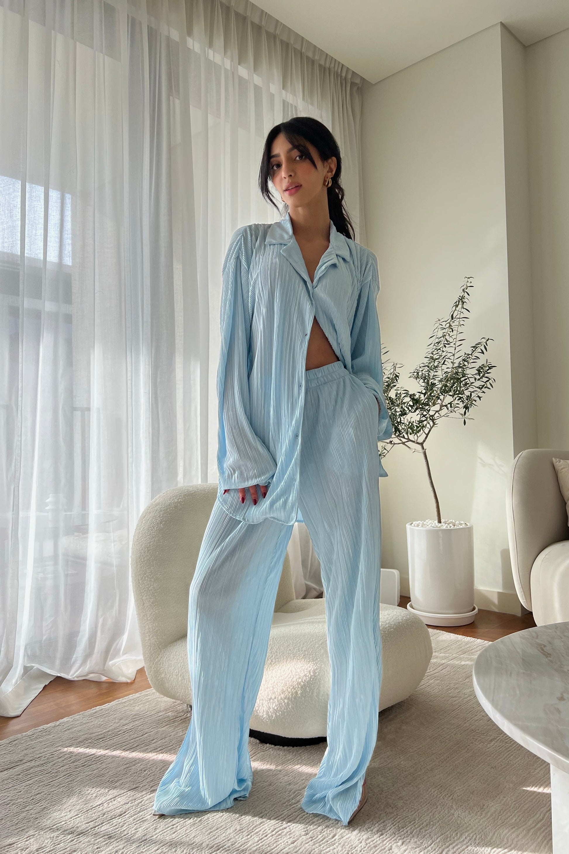 L'ensemble de vos rêves est arrivé ! Ajoutez ce magnifique ensemble de détente à votre tenue du week-end grâce à son tissu plissé de haute qualité. Chemise ample en matière é, boutonnée sur le devant. À porter avec un pantalon assorti et des mules à talons pour un look digne d'une blogueuse.