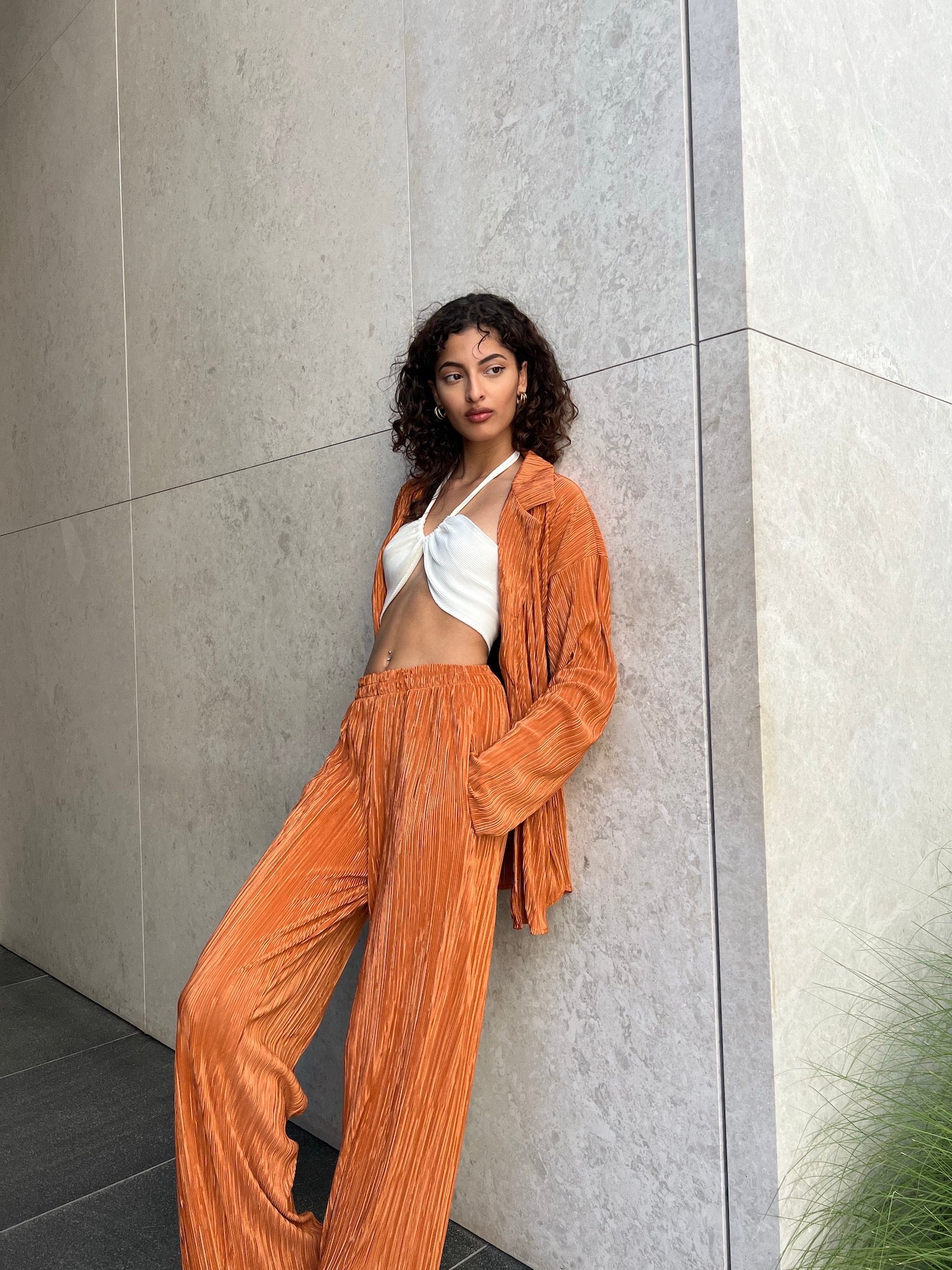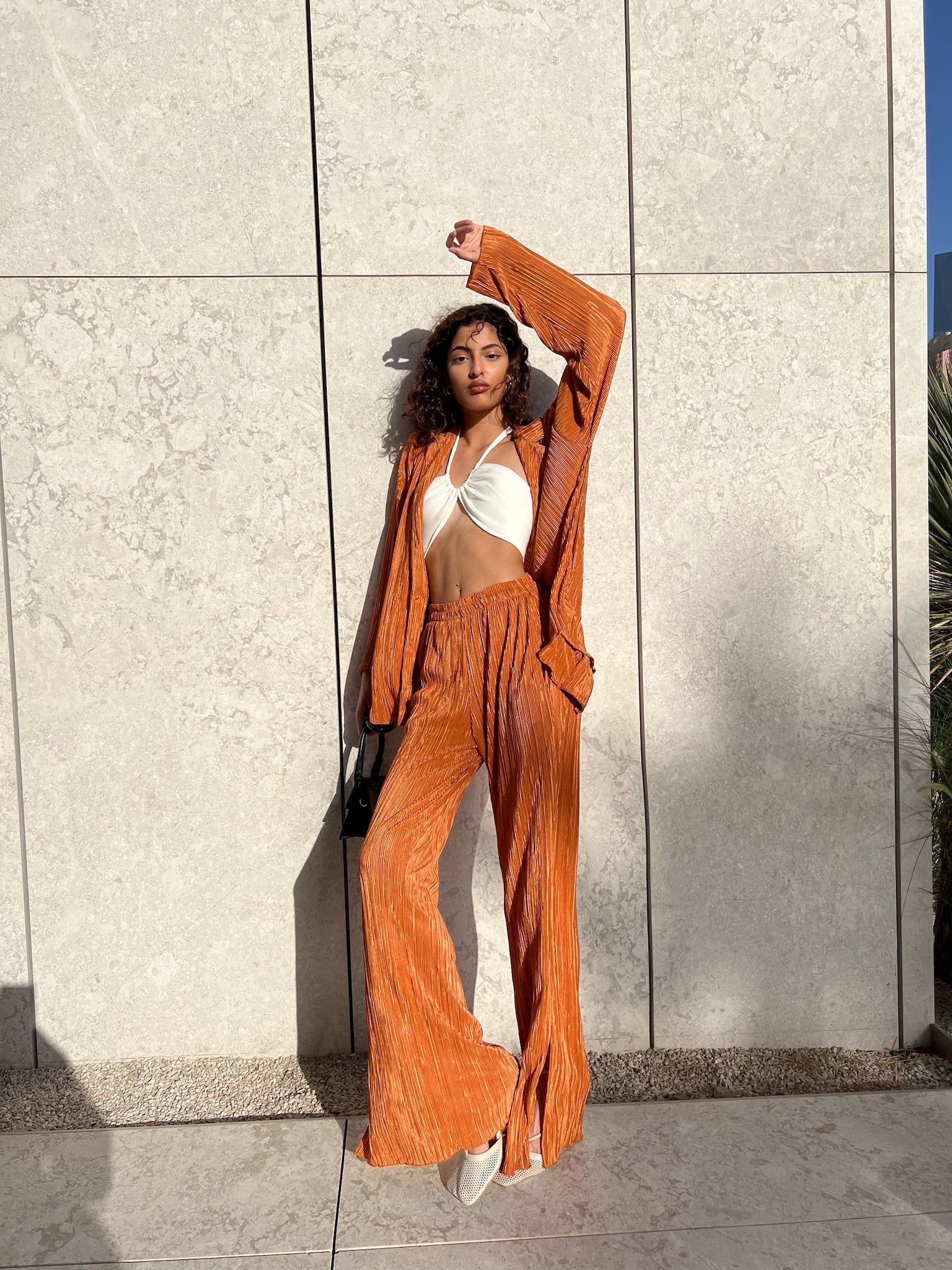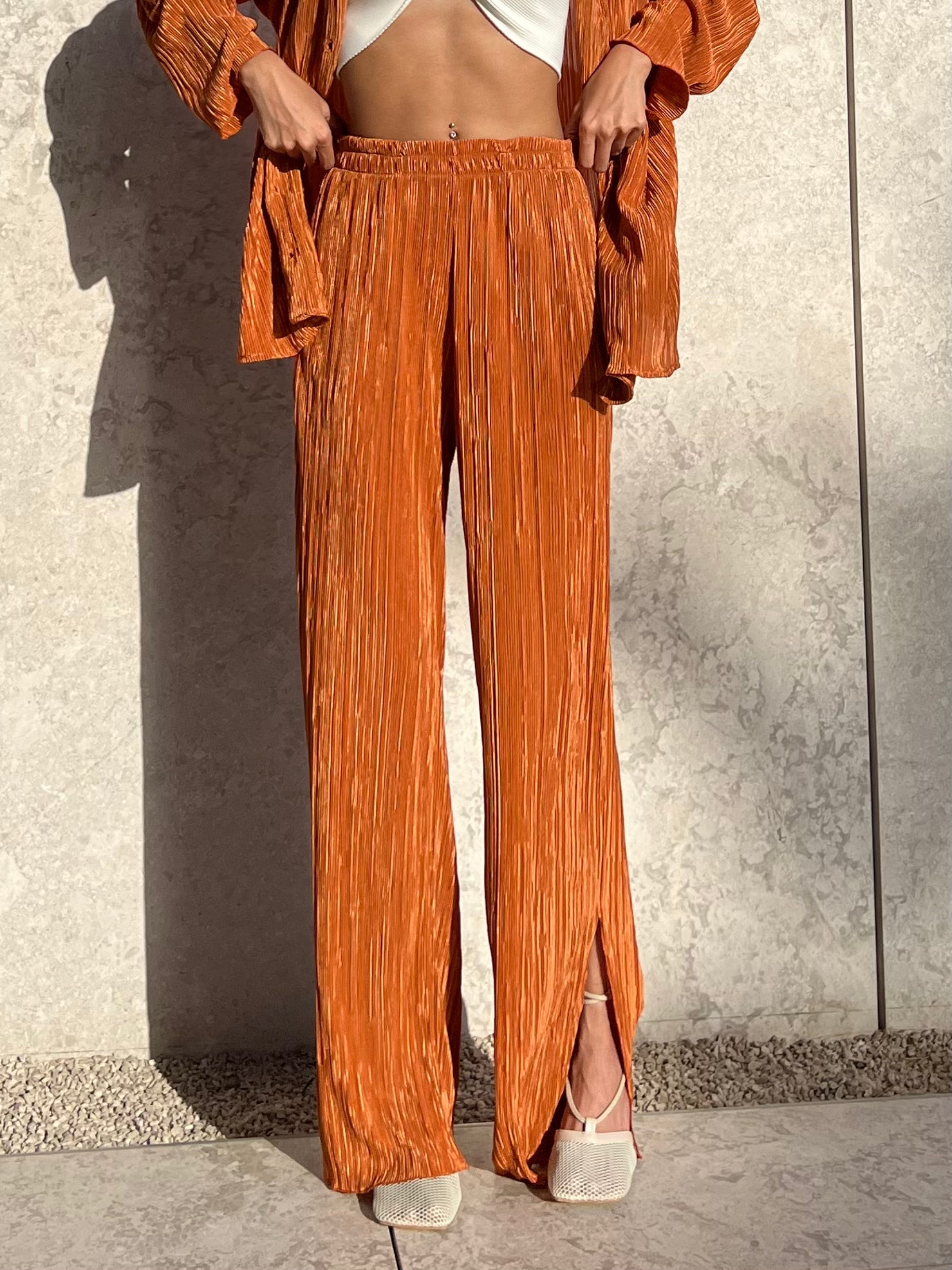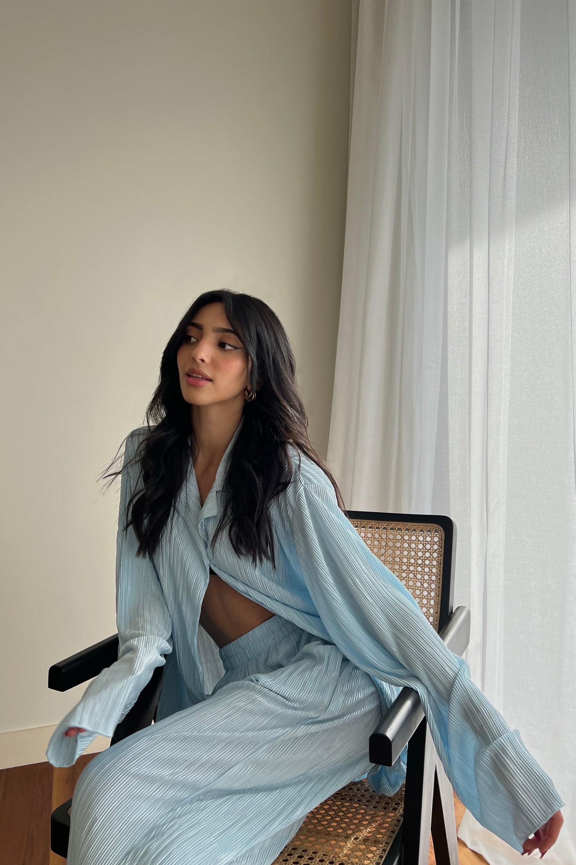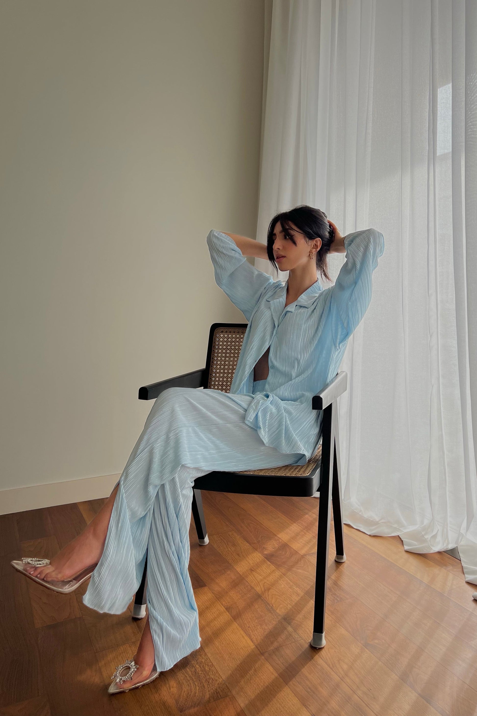 L'ensemble de vos rêves est arrivé ! Ajoutez ce magnifique ensemble de détente à votre tenue du week-end grâce à son tissu plissé de haute qualité. Chemise ample en matière é, boutonnée sur le devant. À porter avec un pantalon assorti et des mules à talons pour un look digne d'une blogueuse.
