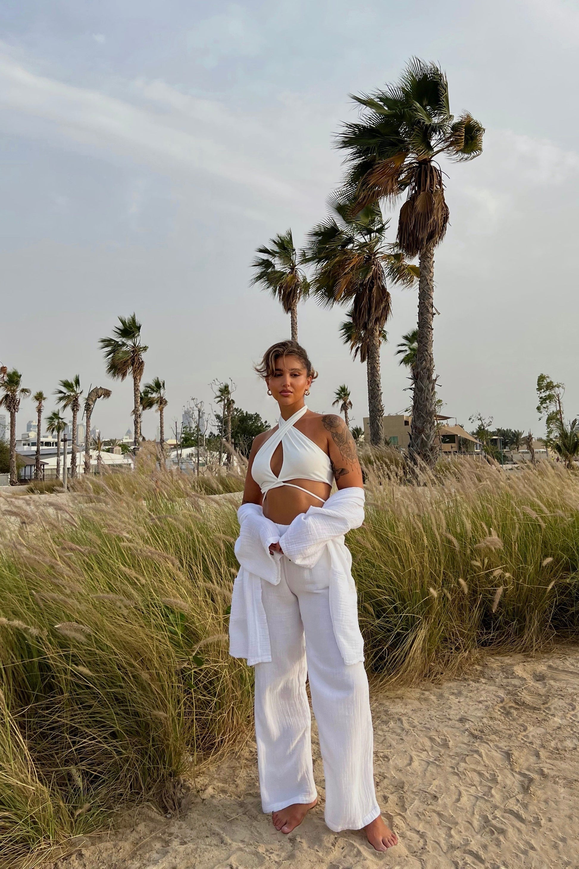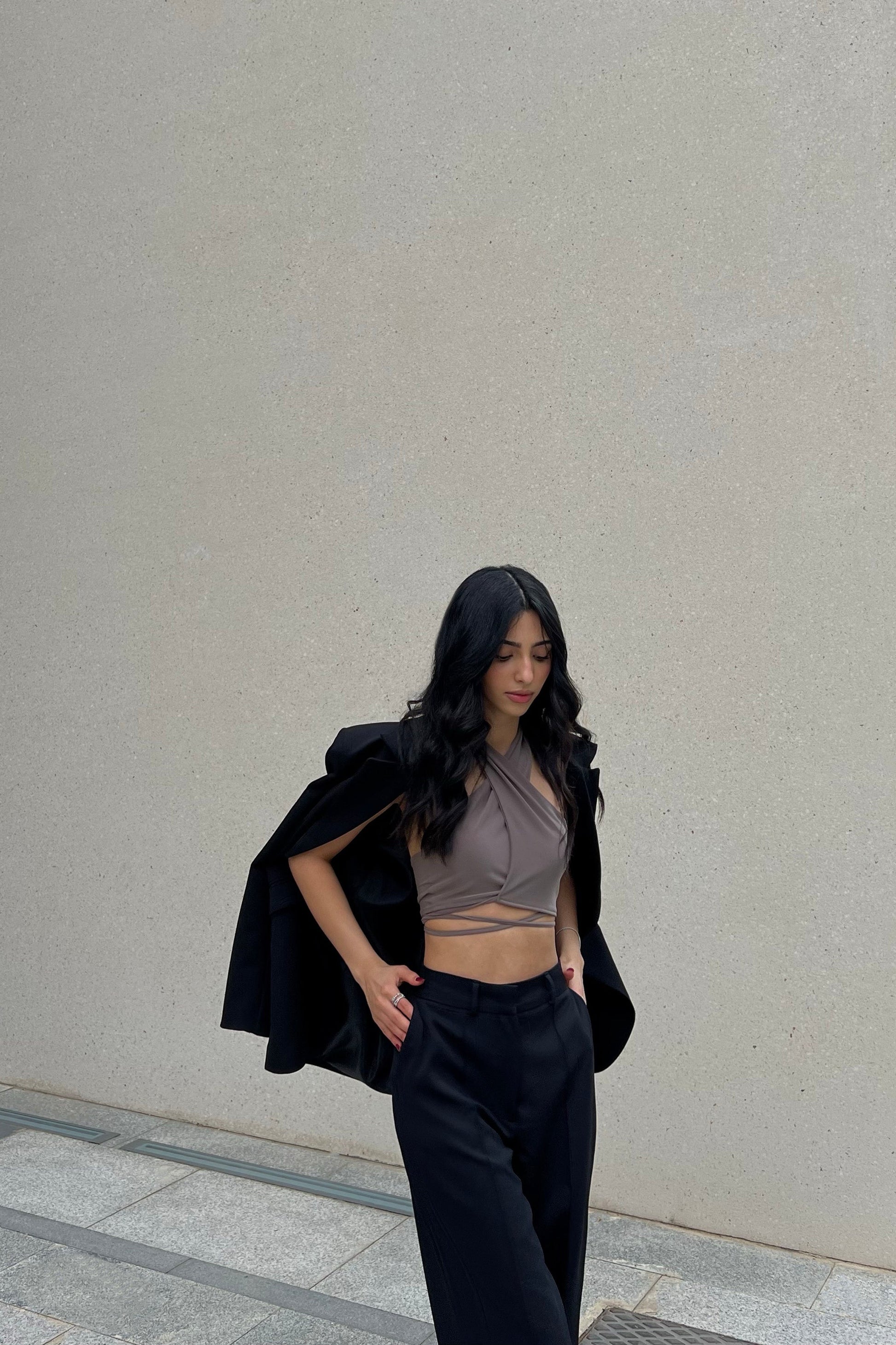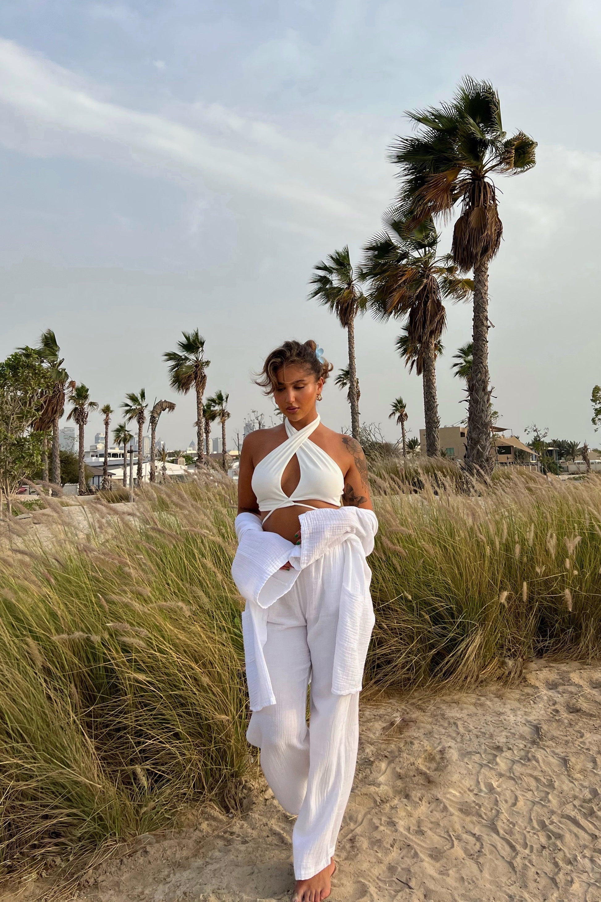 Ce haut s'accorde parfaitement avec notre ensemble kimono, chic et élégant pour les journées à la plage. Il peut aussi se porter avec un jean ou un tailleur, comme sur le mannequin.