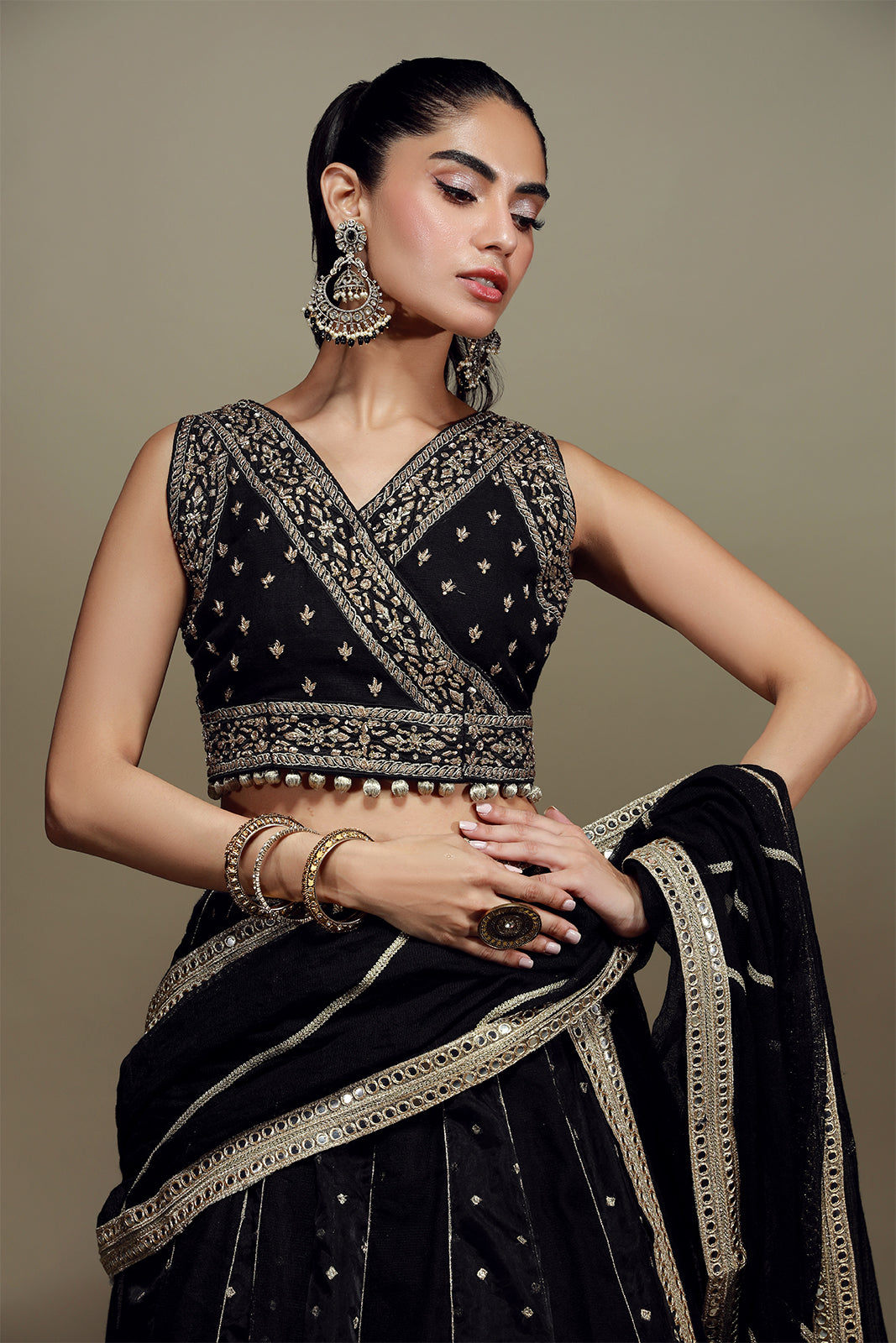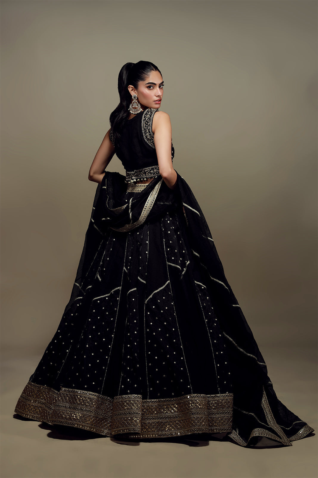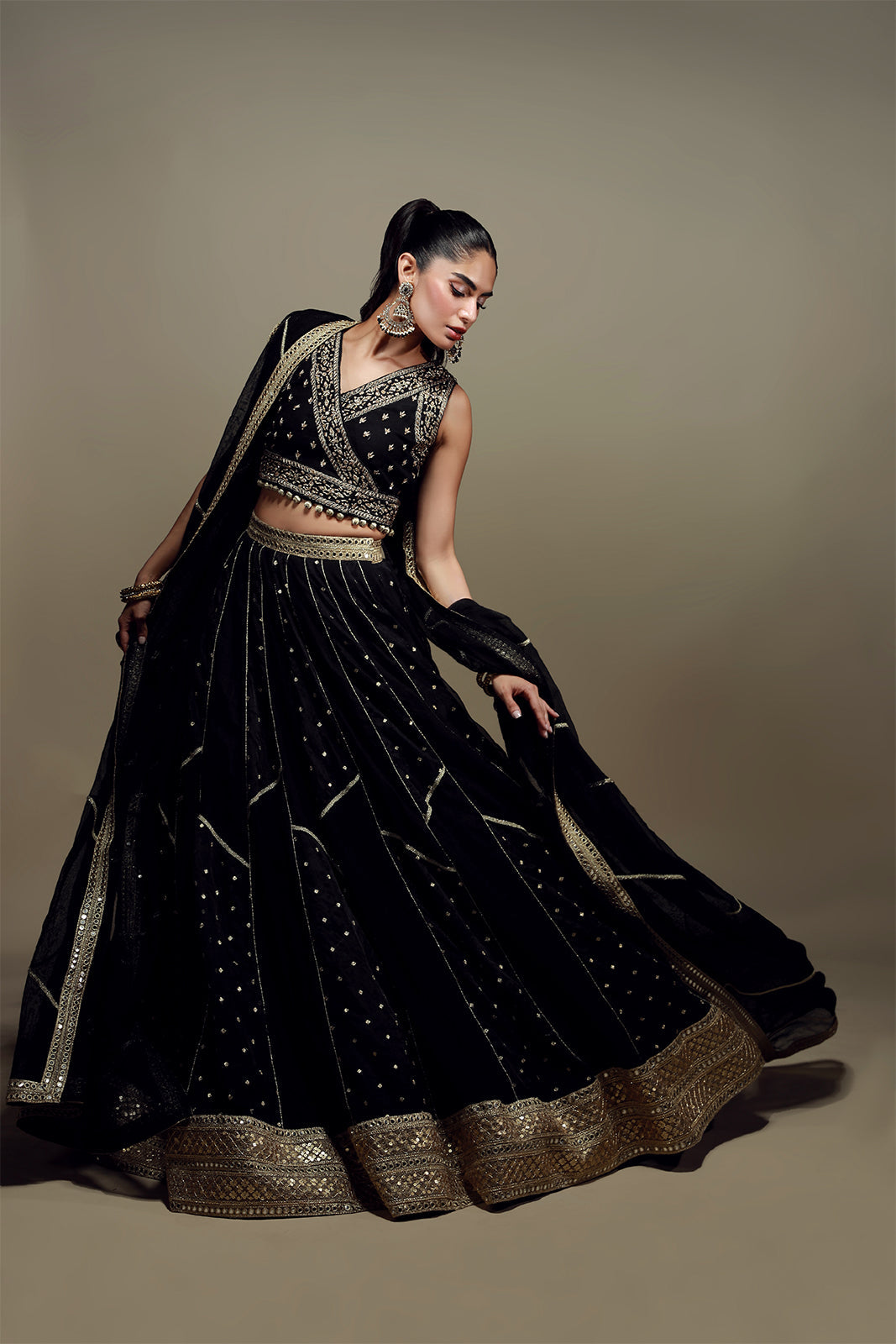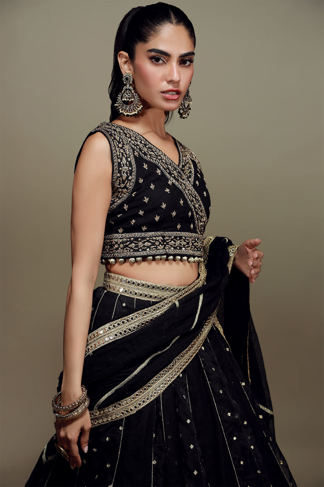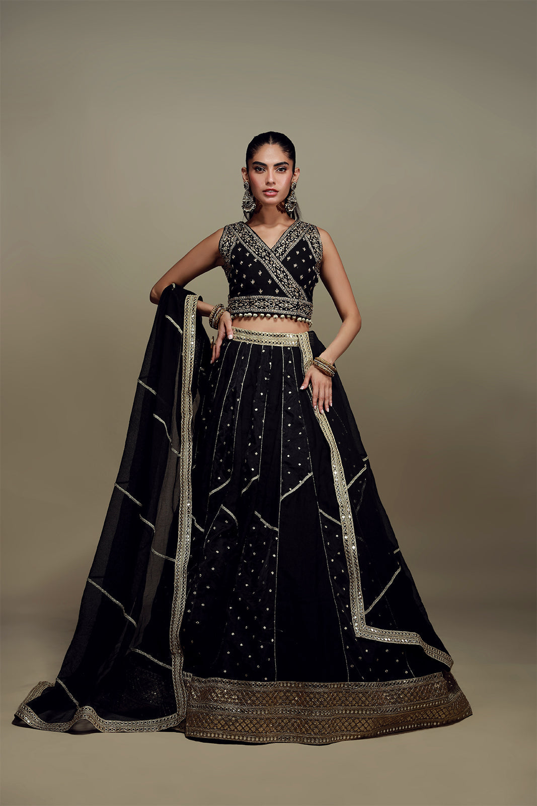 Un choli noir profond est orné de délicates broderies à la main en or antique, assorti à un lehenga asymétrique témoignant d'un savoir-faire exceptionnel en matière de travail du tissu. La pièce maîtresse de cet ensemble est le dupatta en résille khadi, finement brodé de gota, qui lui confère une élégance intemporelle.
