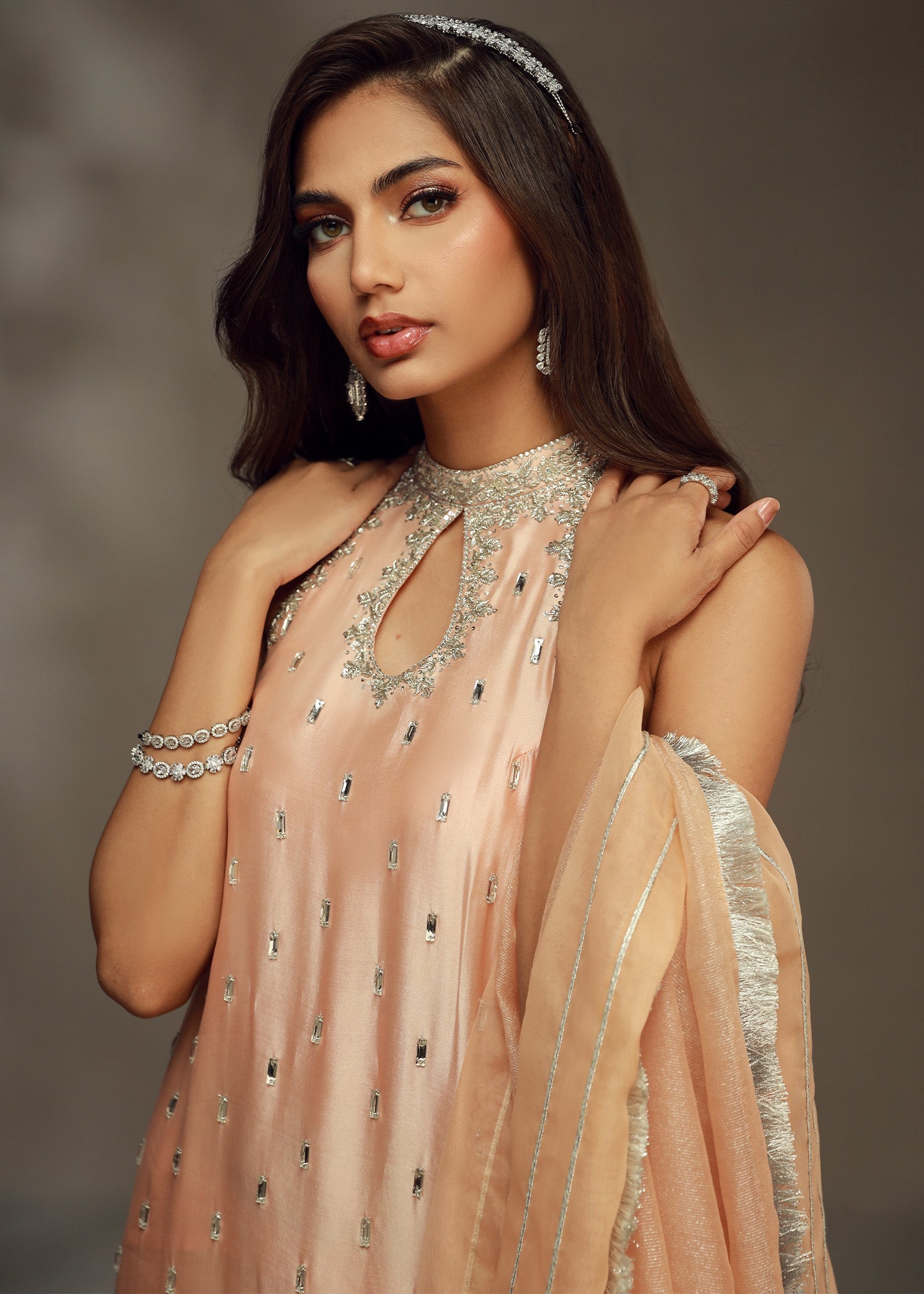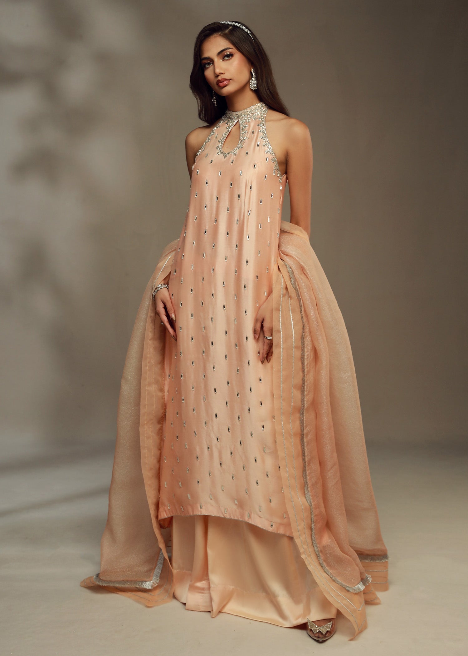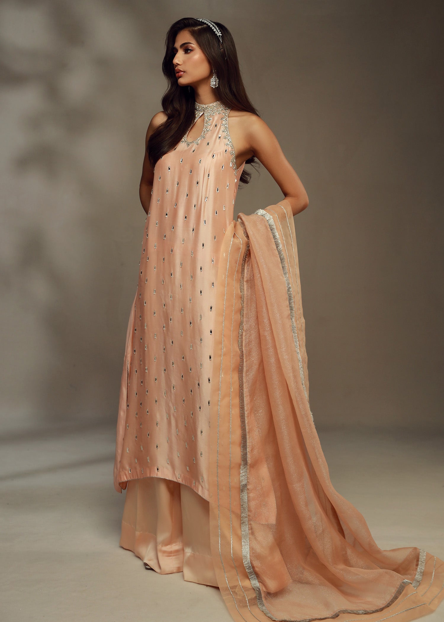 Cette tenue enchanteresse se compose d'une chemise en pure soie rose pêche, élégamment assortie à un pantalon azaar et à une magnifique dupatta Shabnum en zari qui apporte une texture riche à l'ensemble. La chemise présente un décolleté dos nu orné d'une découpe en forme de goutte, entièrement brodé à la main pour sublimer son charme, tandis qu'une délicate guirlande lumineuse ajoute une touche unique et captivante.