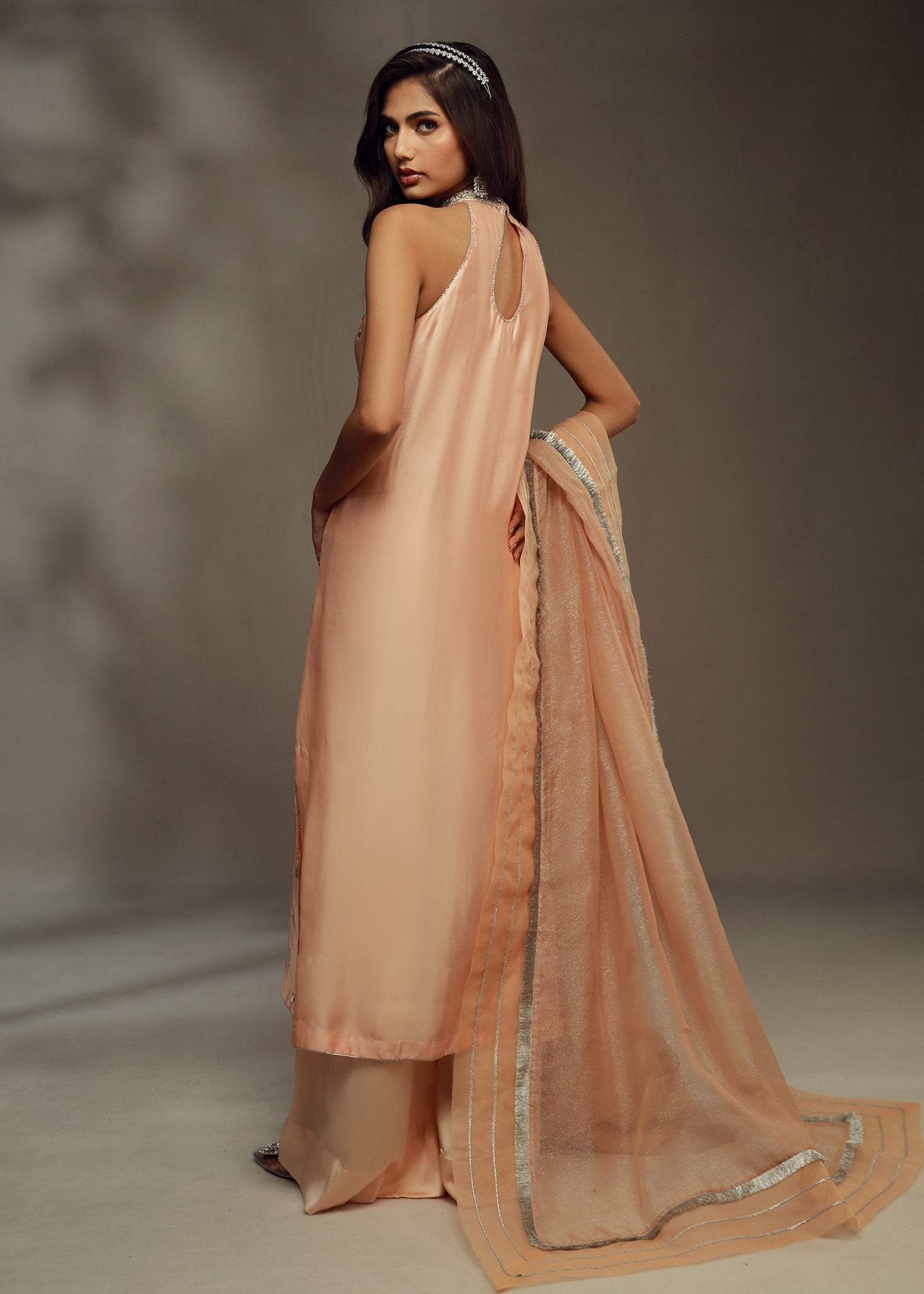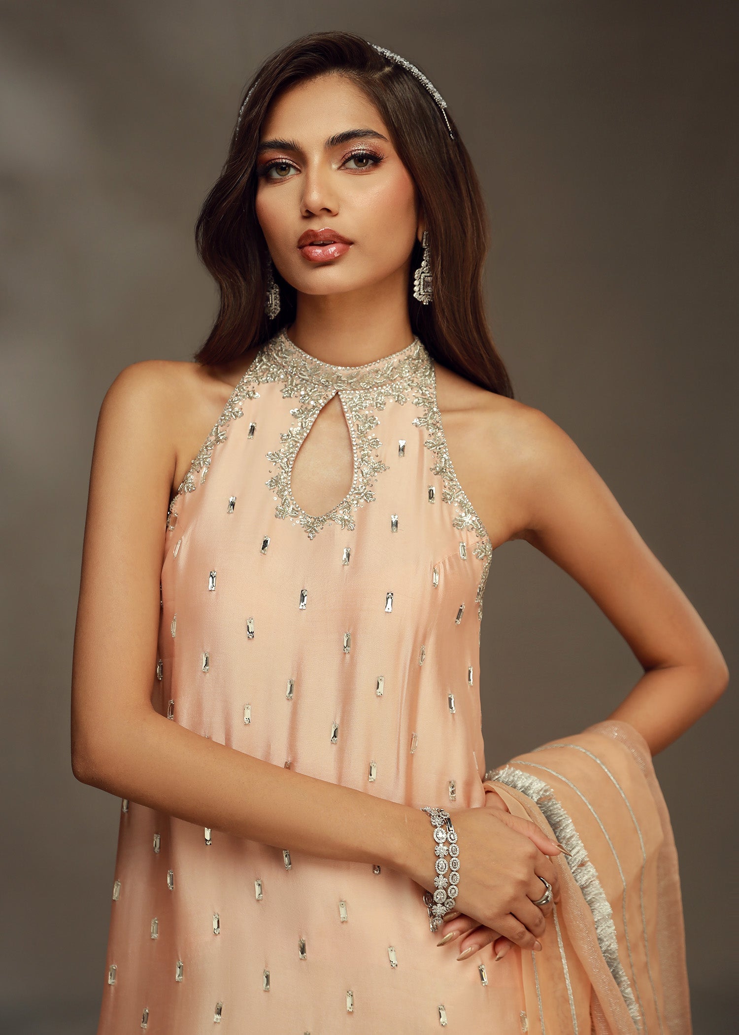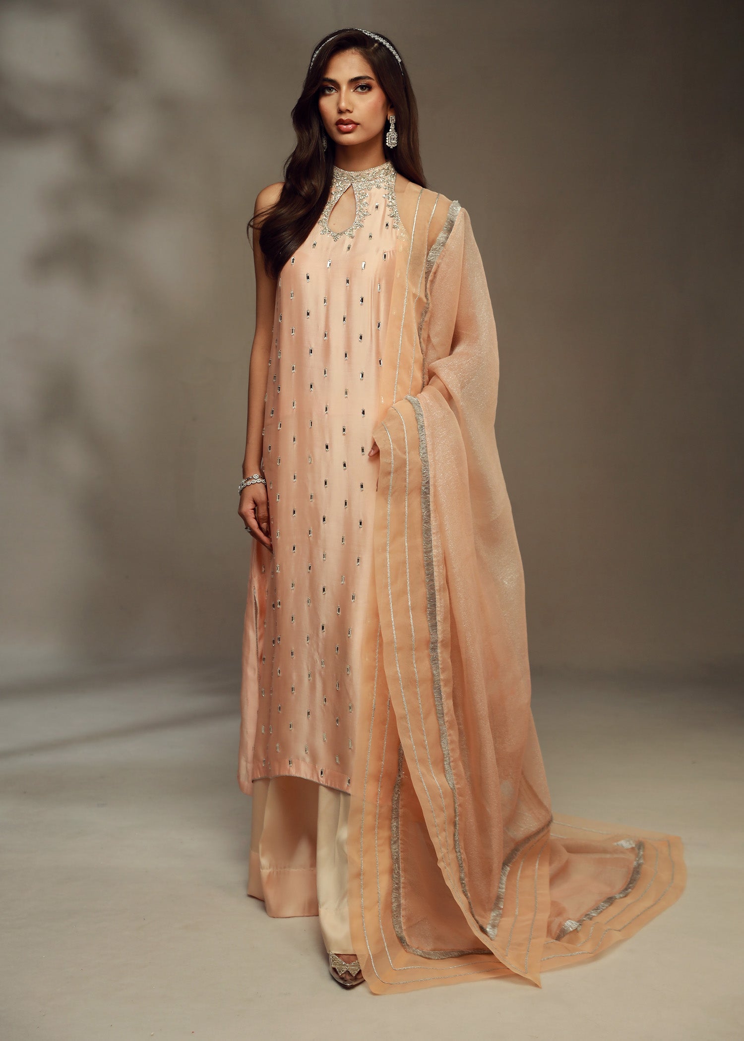 Cette tenue enchanteresse se compose d'une chemise en pure soie rose pêche, élégamment assortie à un pantalon azaar et à une magnifique dupatta Shabnum en zari qui apporte une texture riche à l'ensemble. La chemise présente un décolleté dos nu orné d'une découpe en forme de goutte, entièrement brodé à la main pour sublimer son charme, tandis qu'une délicate guirlande lumineuse ajoute une touche unique et captivante.