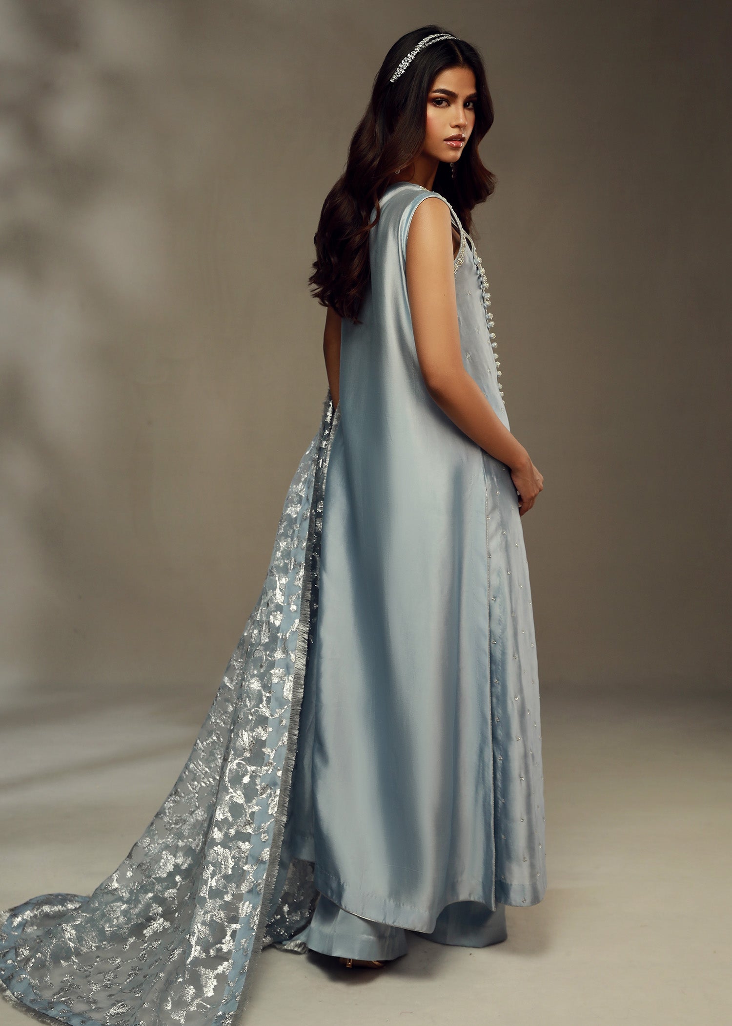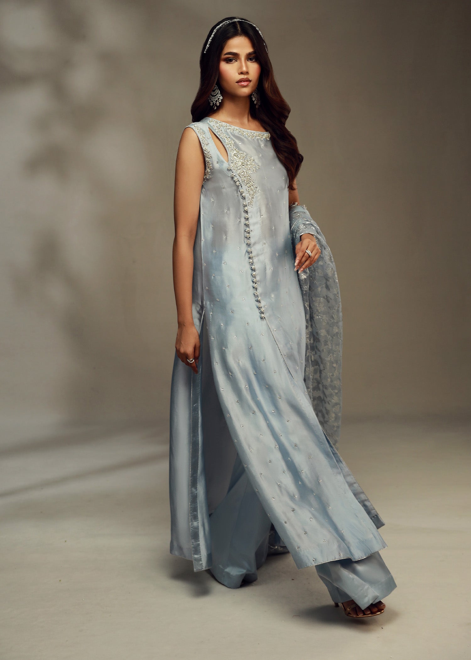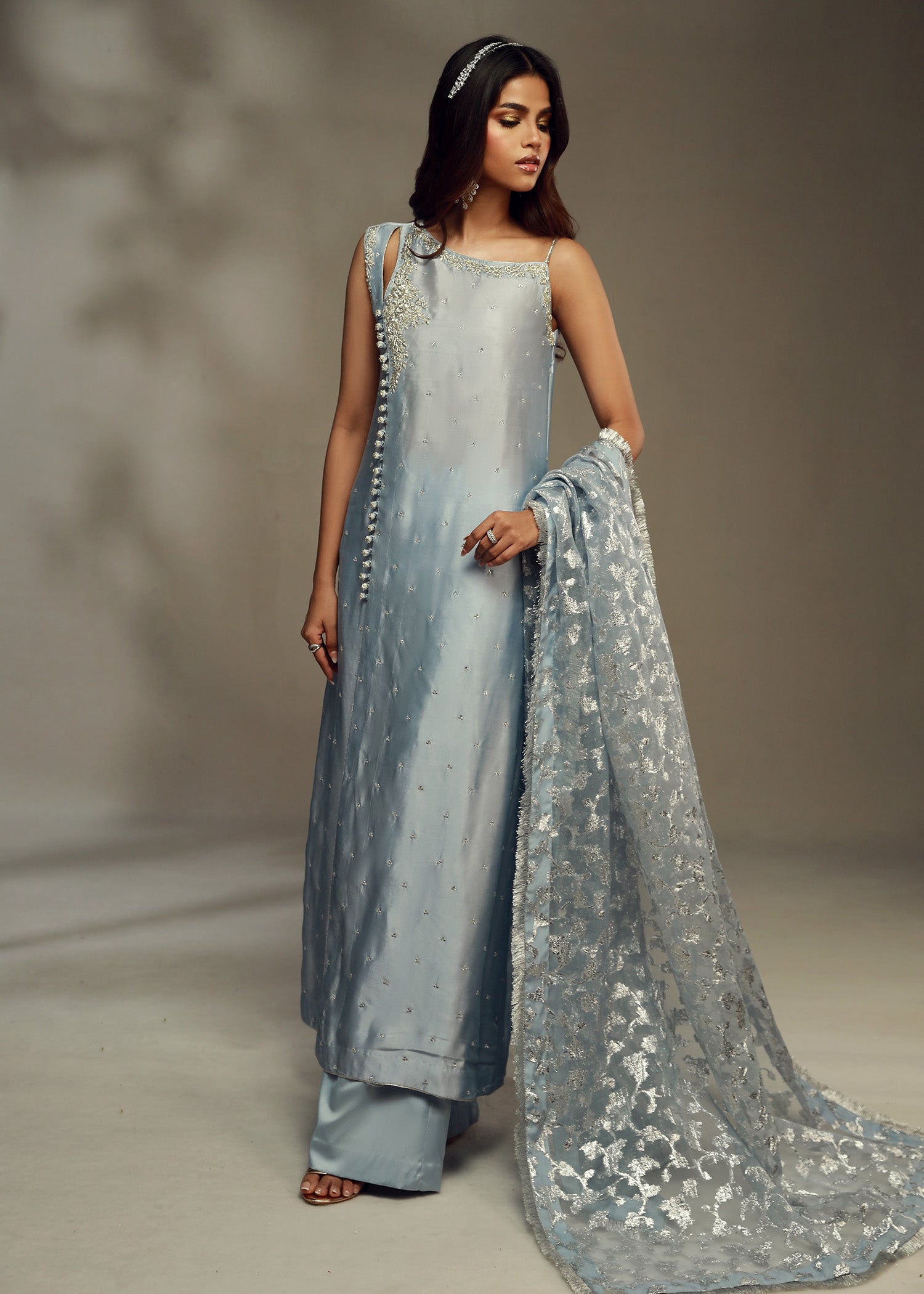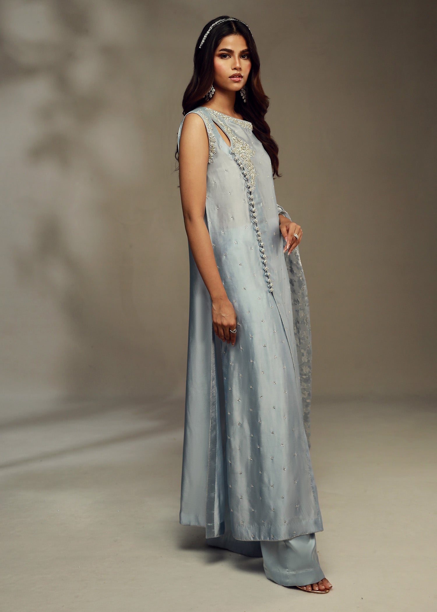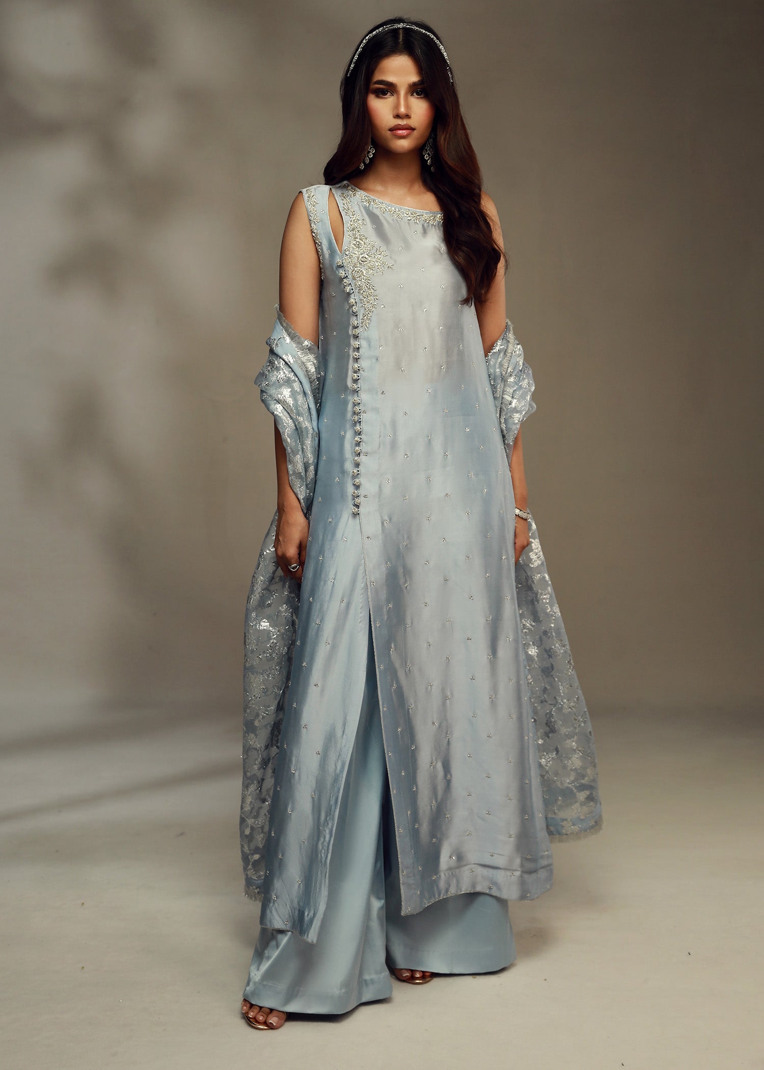 Cette tenue élégante se compose d'une chemise en pure soie bleu glacier, ornée d'un décolleté entièrement brodé à la main et d'une coupe raffinée, rehaussée de boutons finement travaillés sur le devant pour une touche de sophistication supplémentaire. L'ensemble est complété par un pantalon azaar stylé et un luxueux dupatta en organza lorex jaal, dont les détails délicats et chatoyants subliment l'ensemble. Cette combinaison est idéale pour les événements formels, offrant un mélange harmonieux de savoir-faire traditionnel et de style contemporain qui ne manquera pas de faire sensation.