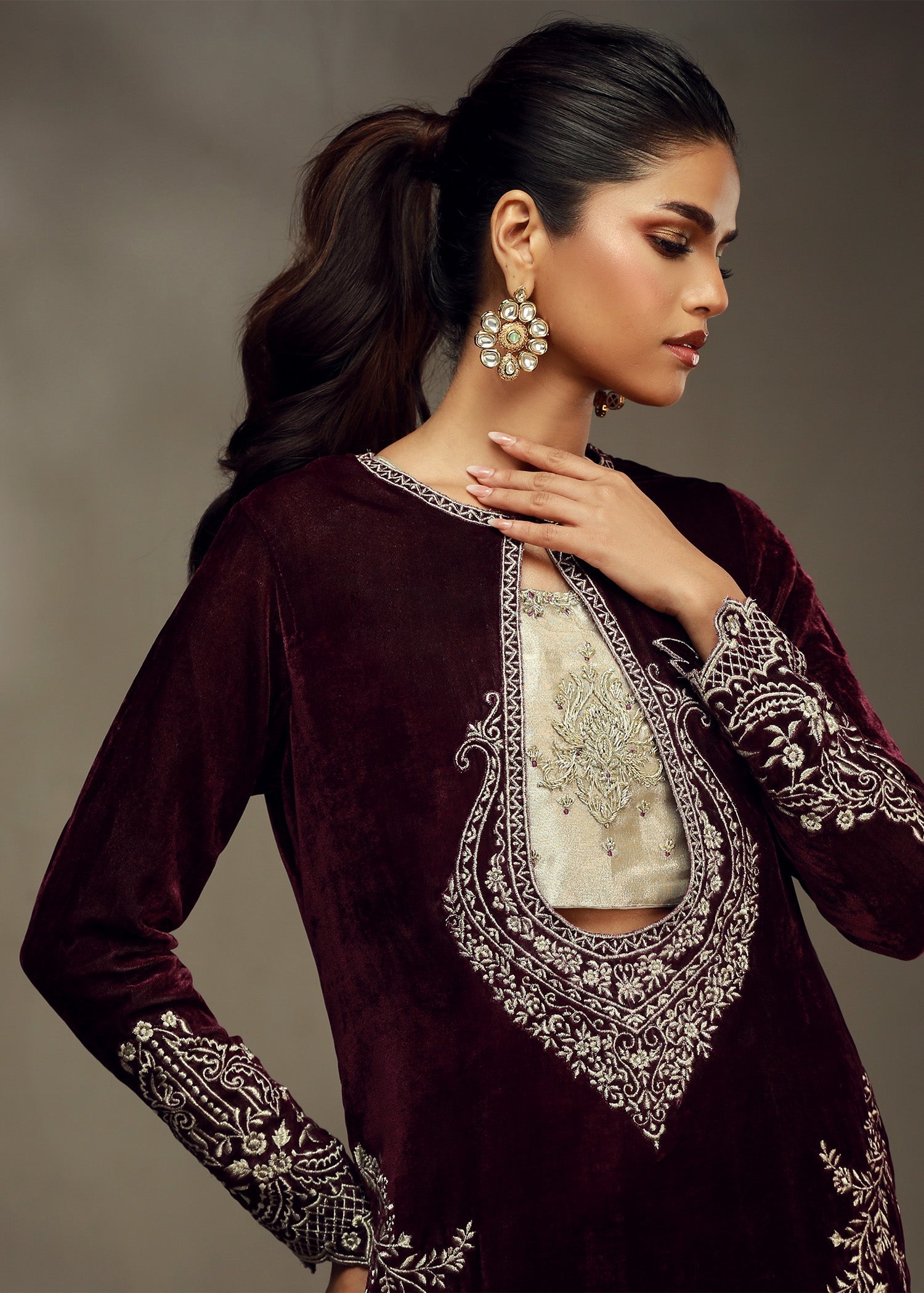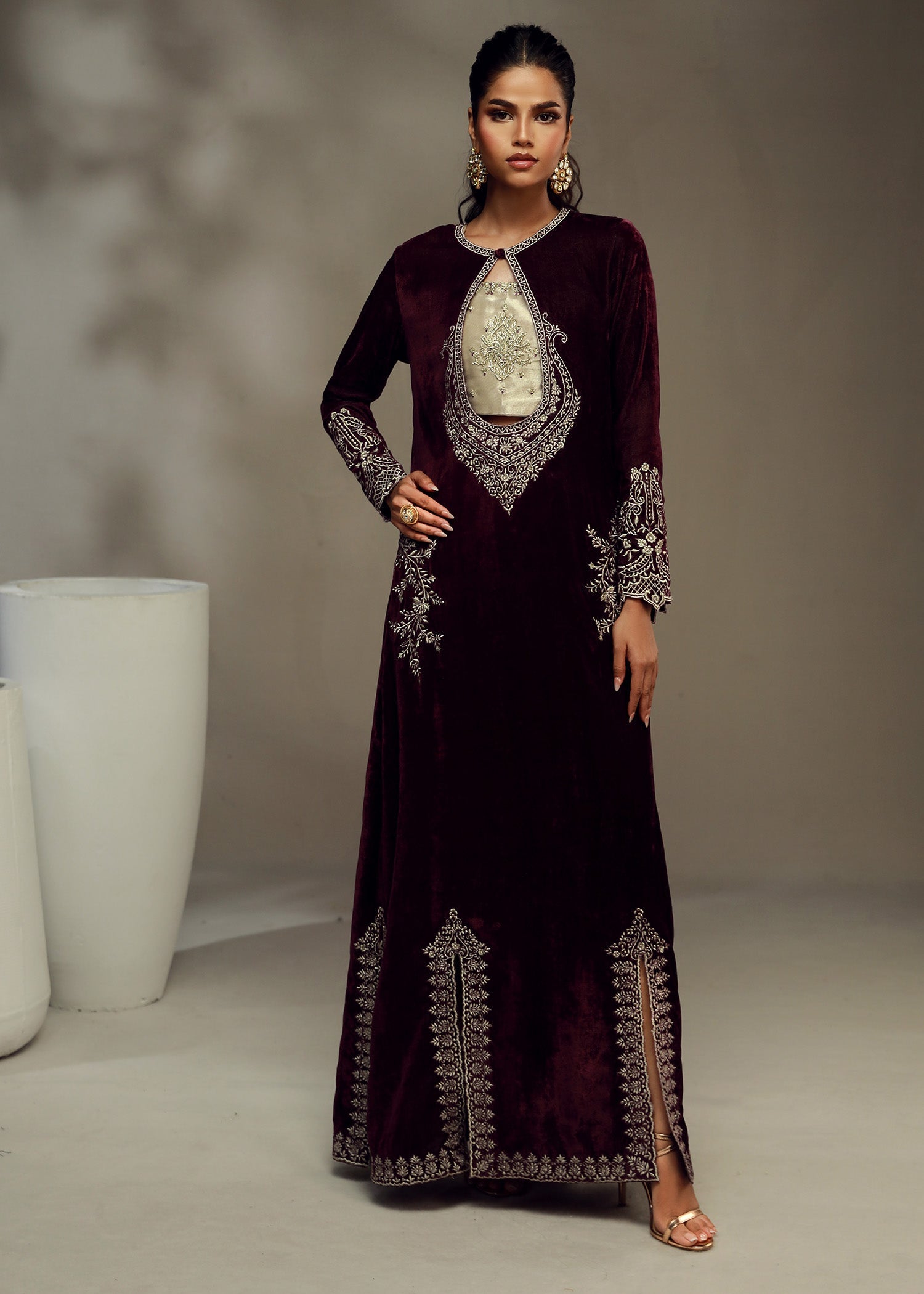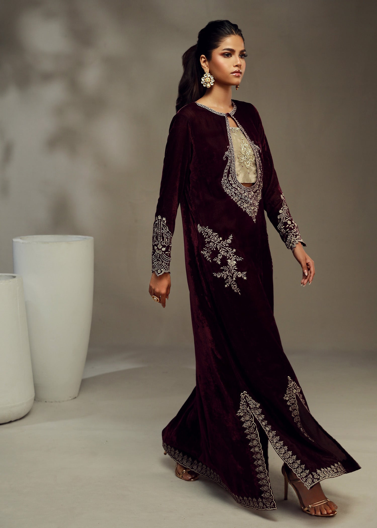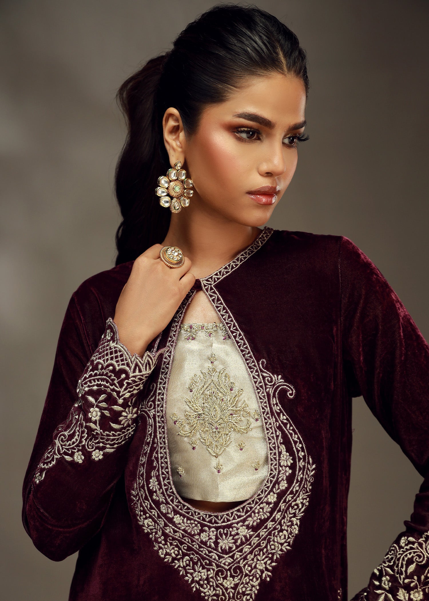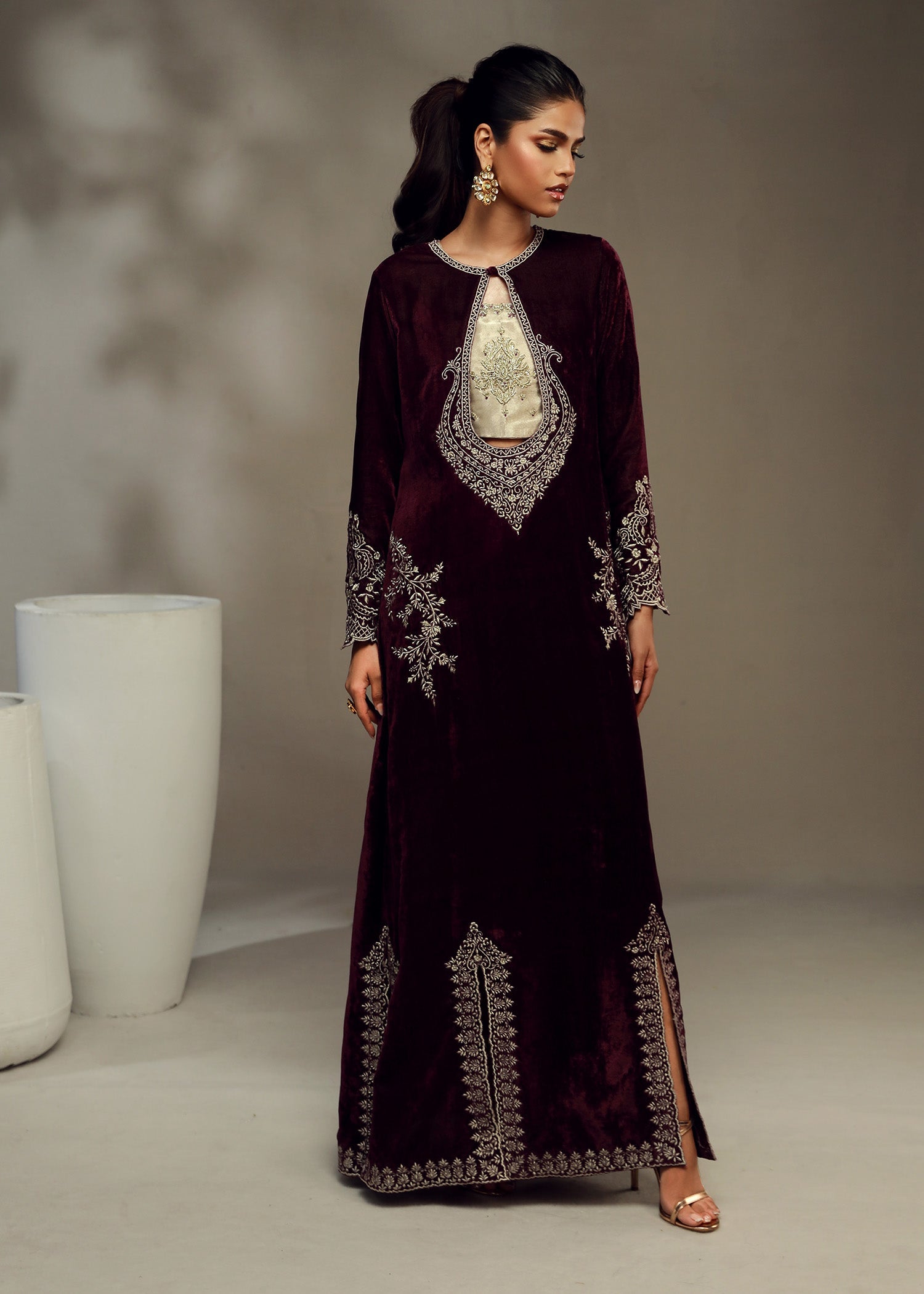 Ce caftan en velours violet aubergine à couper le souffle est une véritable pièce maîtresse, avec son magnifique bustier qui respire le glamour et la sophistication. Les broderies réalisées à la main ajoutent une touche d'élégance et de raffinement, témoignant du savoir-faire et du souci du détail de l'artisan. Le bustier, entièrement orné à la main, est une œuvre d'art, avec ses motifs complexes qui scintillent et brillent sous la lumière. Ce caftan exquis est parfait pour une entrée remarquée lors d'événements formels, grâce à son tissu riche et luxueux et à ses ornements somptueux qui ne manqueront pas d'attirer tous les regards.