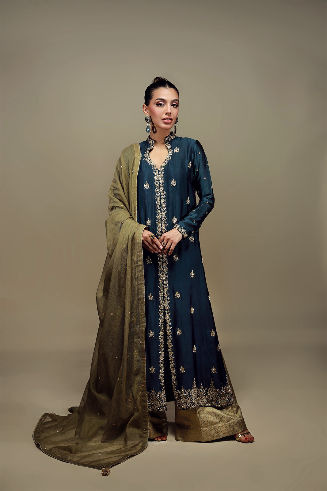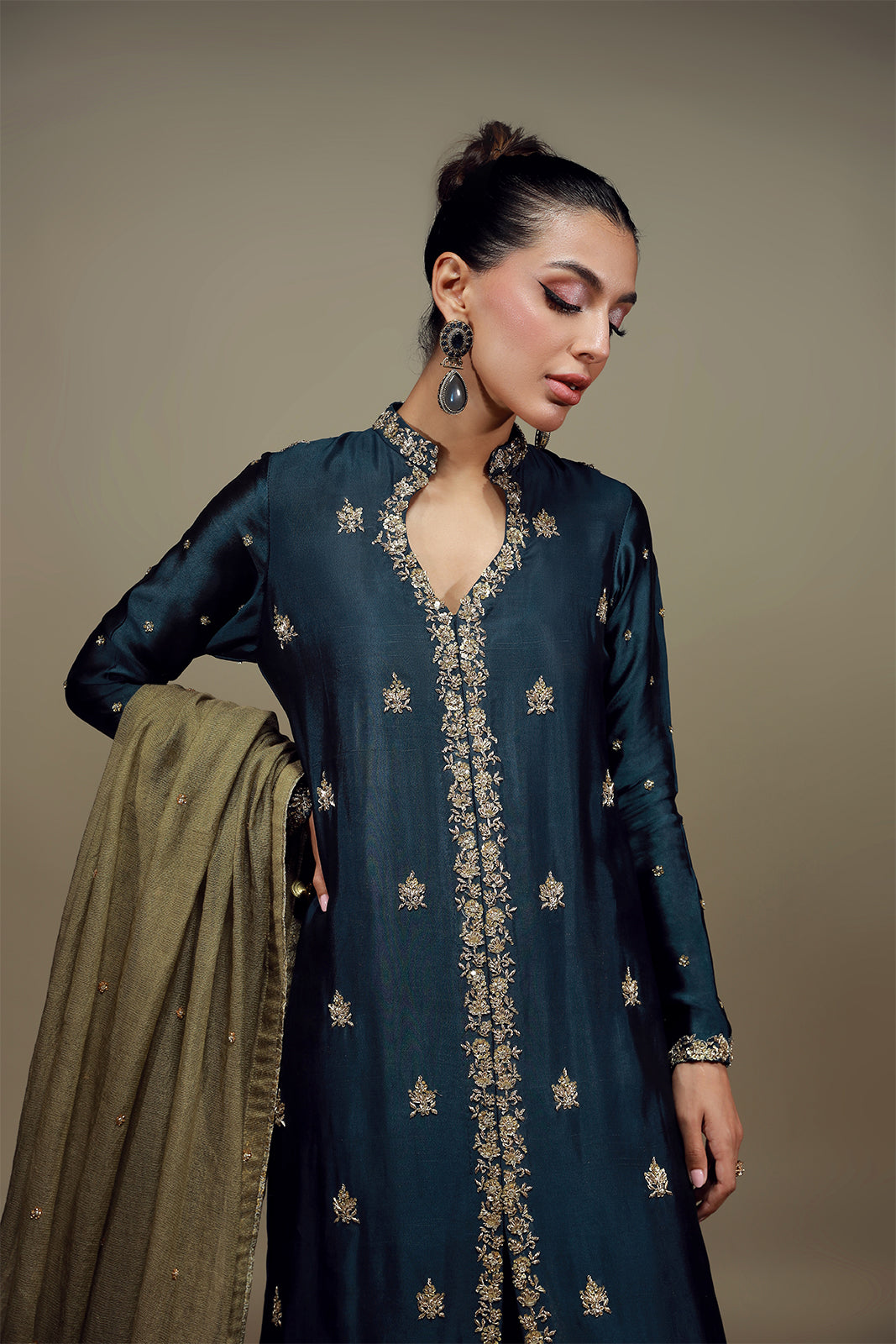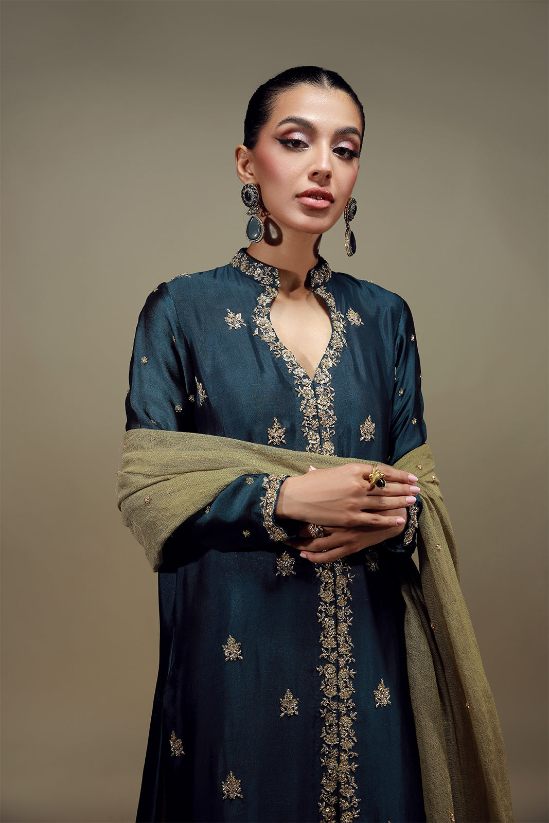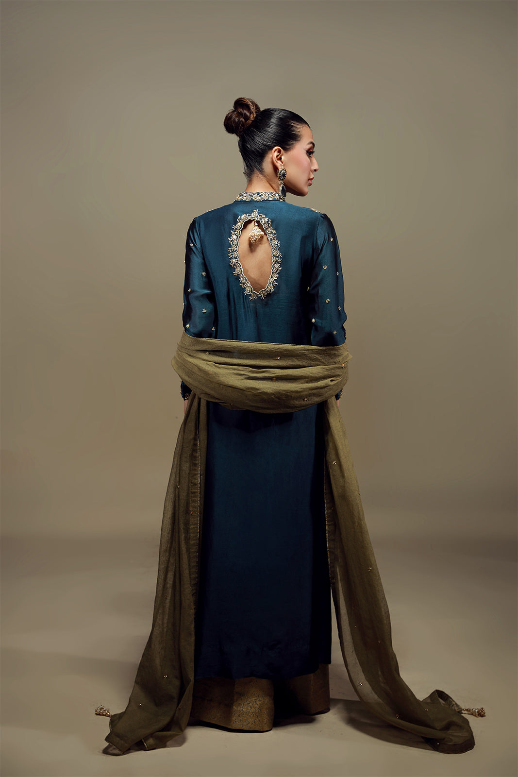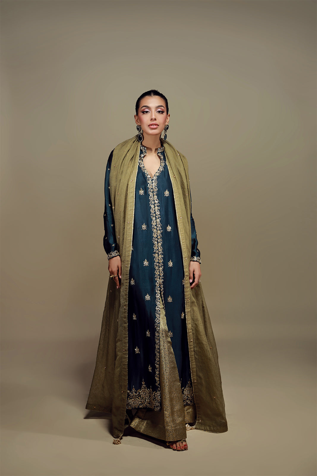 Cette somptueuse chemise longue en pure soie sheesha turquoise, à ouverture frontale, est idéale pour les soirées festives. Ornée de délicates broderies à la main sur les ouvertures en forme de goutte d'eau à l'avant et à l'arrière, elle apporte une touche d'élégance et de raffinement. Elle se porte avec une culotte droite et un dupatta en résille khaddi aux teintes vibrantes à motifs médaillons, créant ainsi un ensemble harmonieux et saisissant. L'alliance de tissus luxueux et d'une confection méticuleuse garantit une allure remarquable lors de toute célébration.