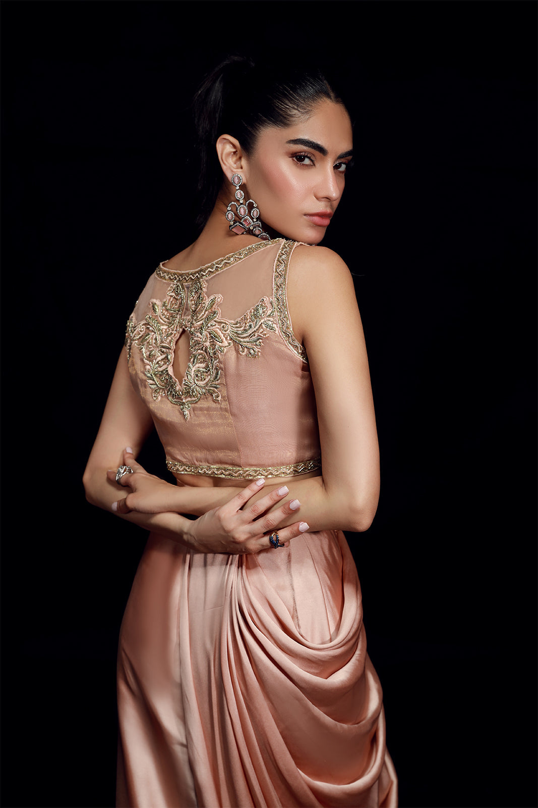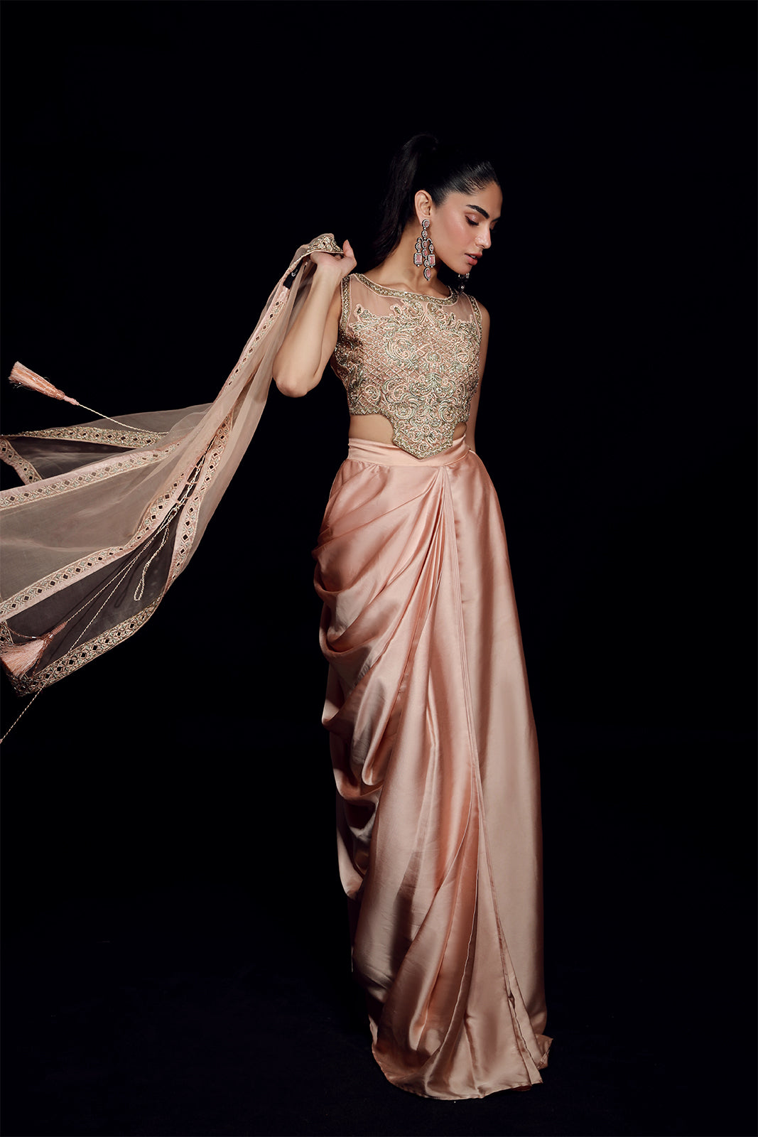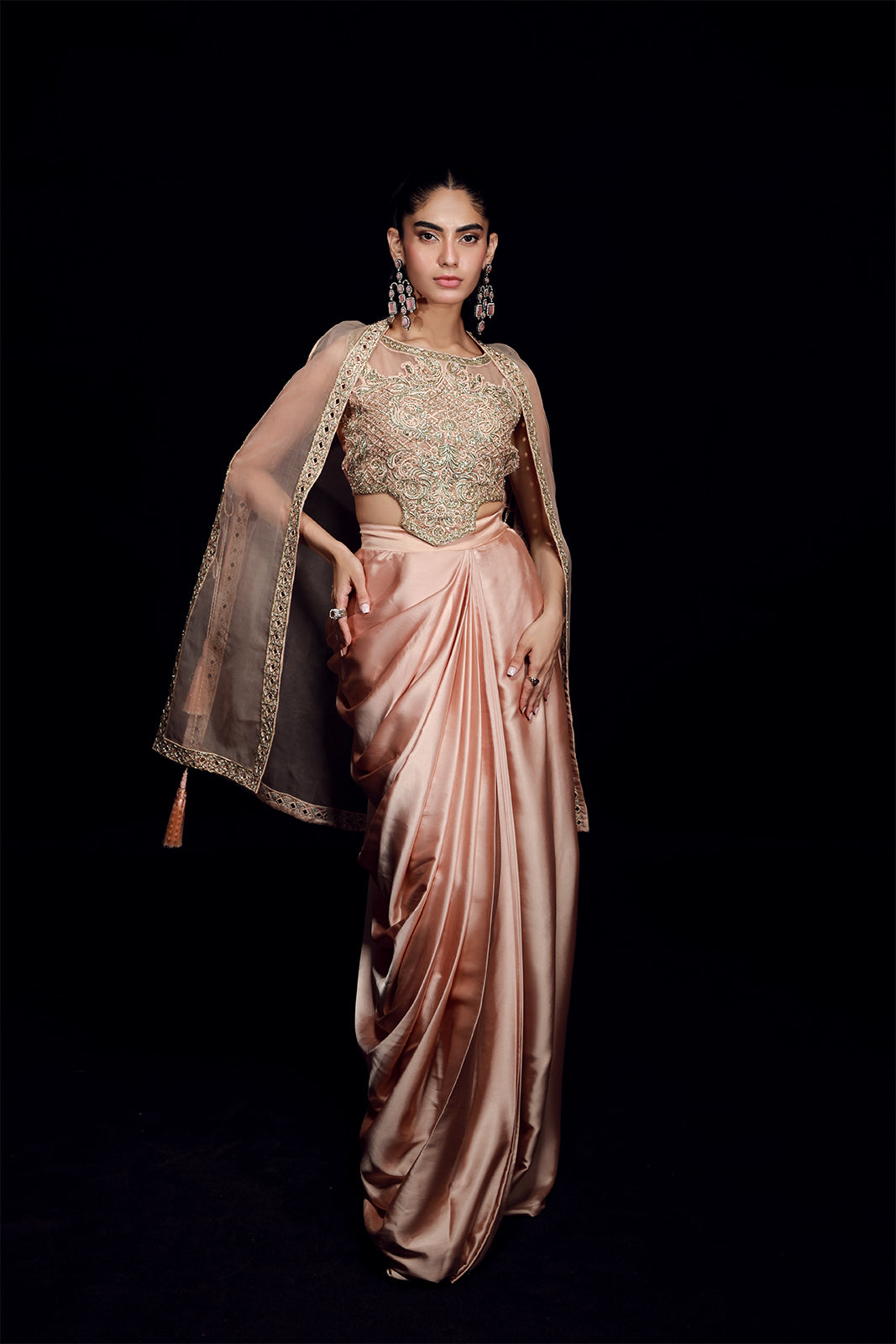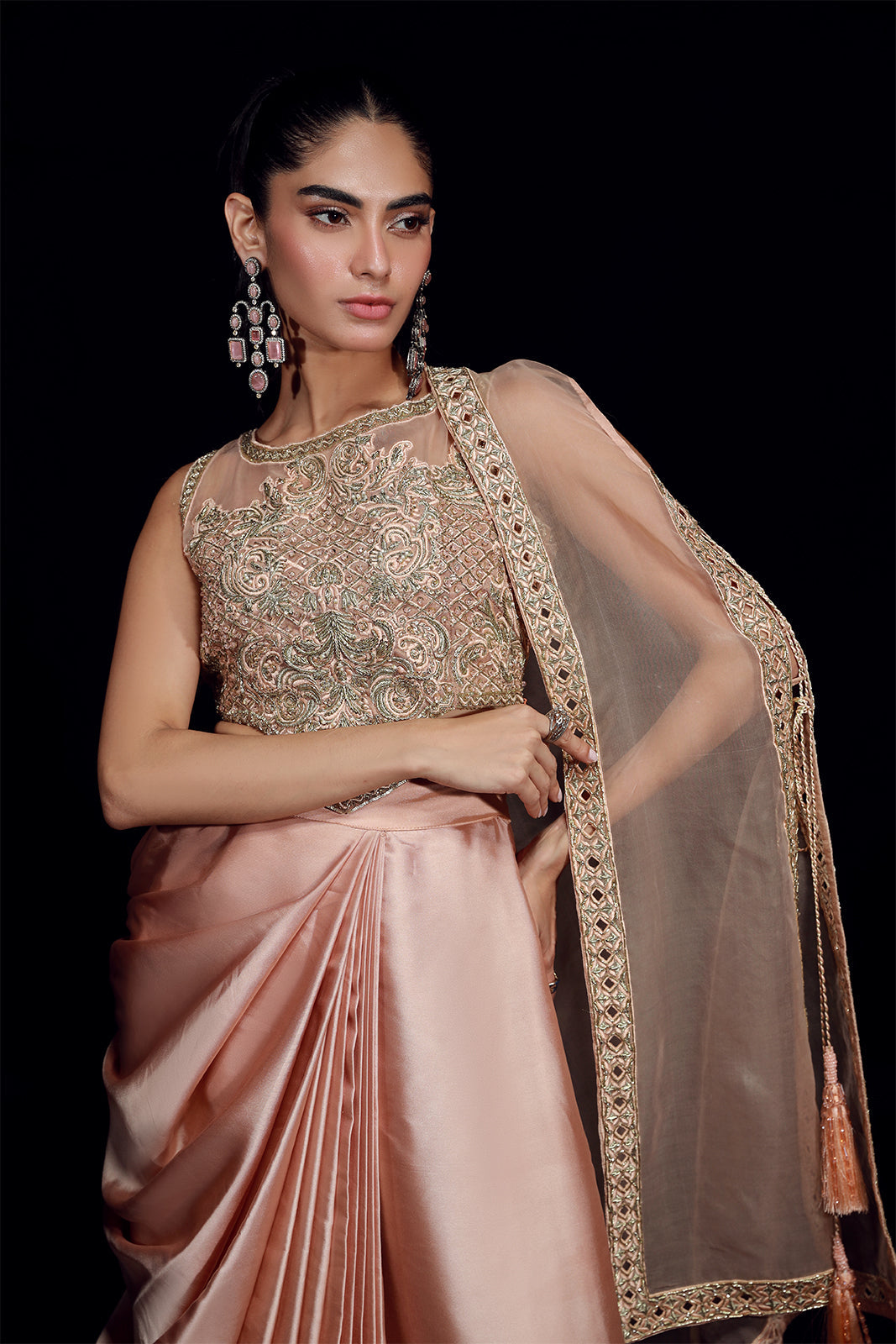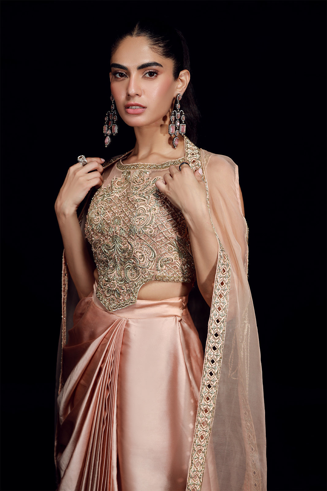 Cette veste en organza rose poudré, d'une élégance naturelle, présente une ouverture sur le devant et est ornée de notre broderie dorée signature et de finitions réalisées à la main. Elle est assortie à une jupe drapée en pure soie sheesha. L'ensemble comprend également un choli classique, richement orné de festons et de broderies somptueuses, agrémenté de pompons décoratifs.