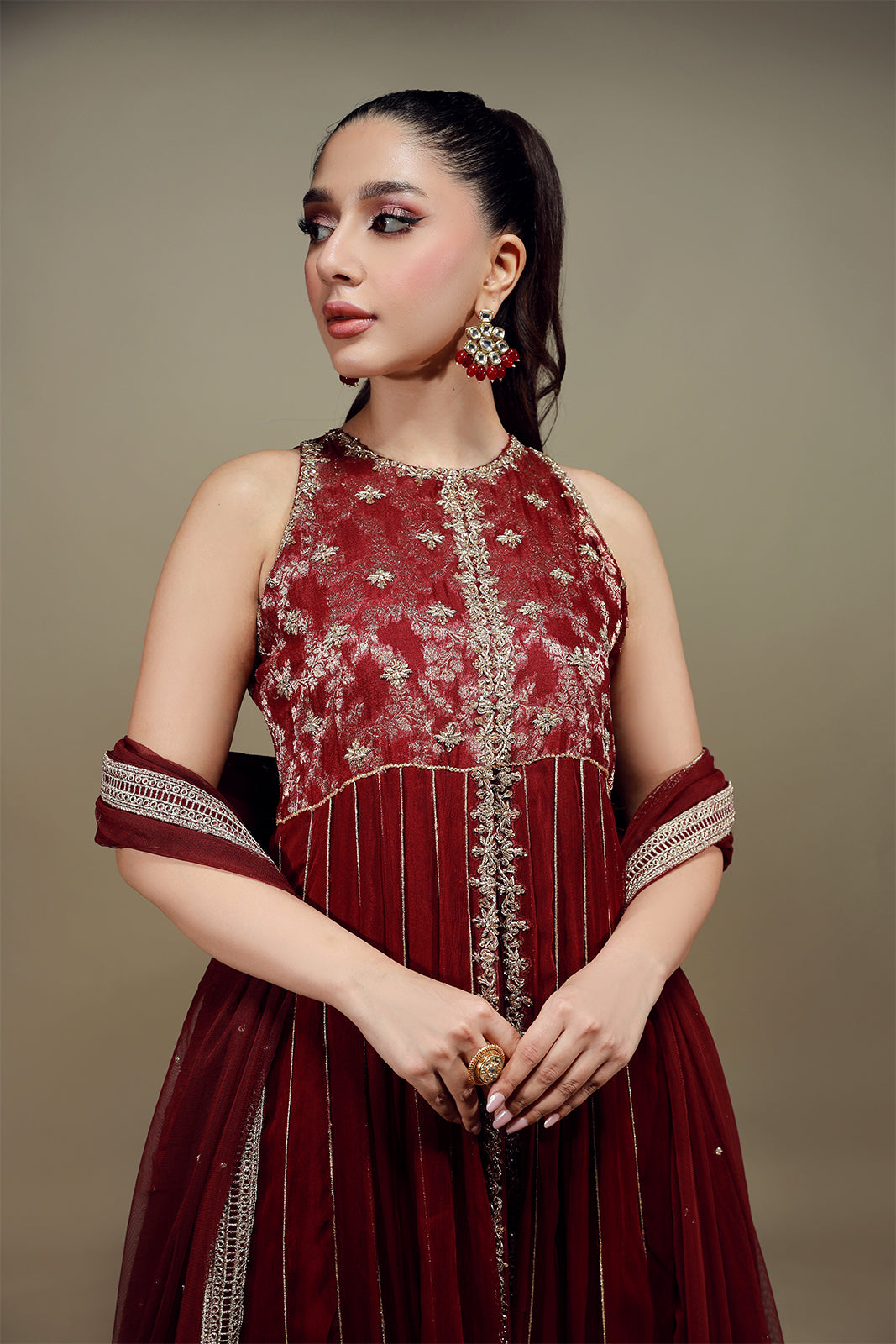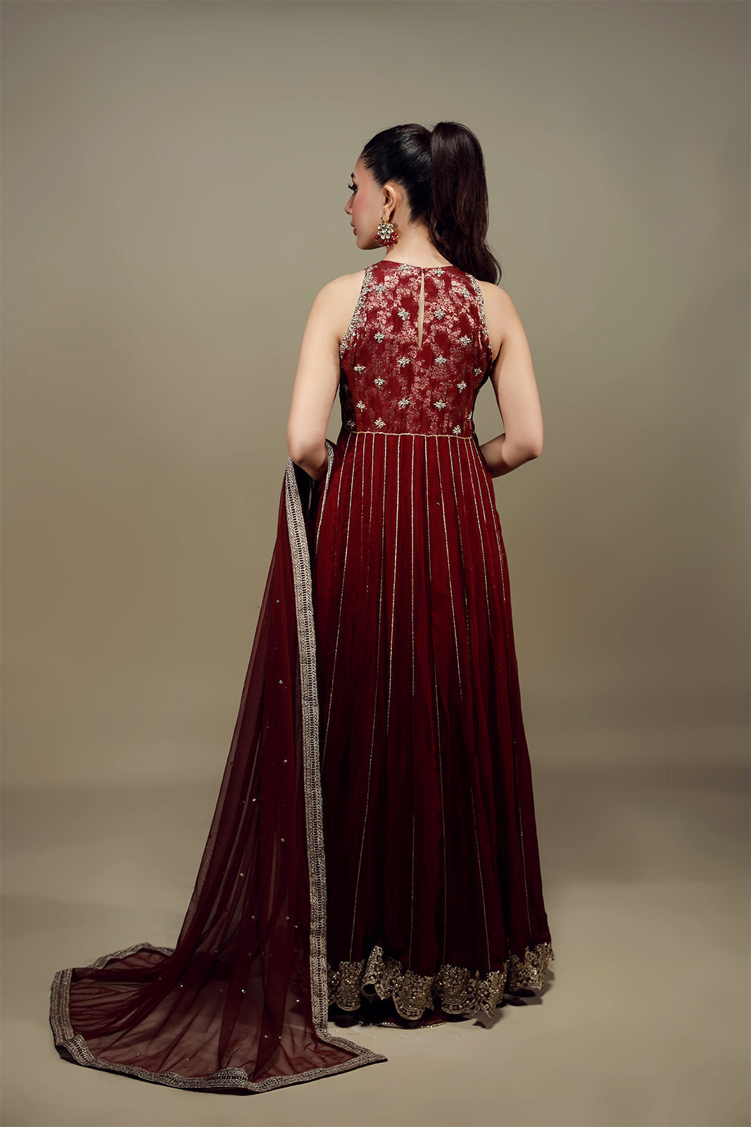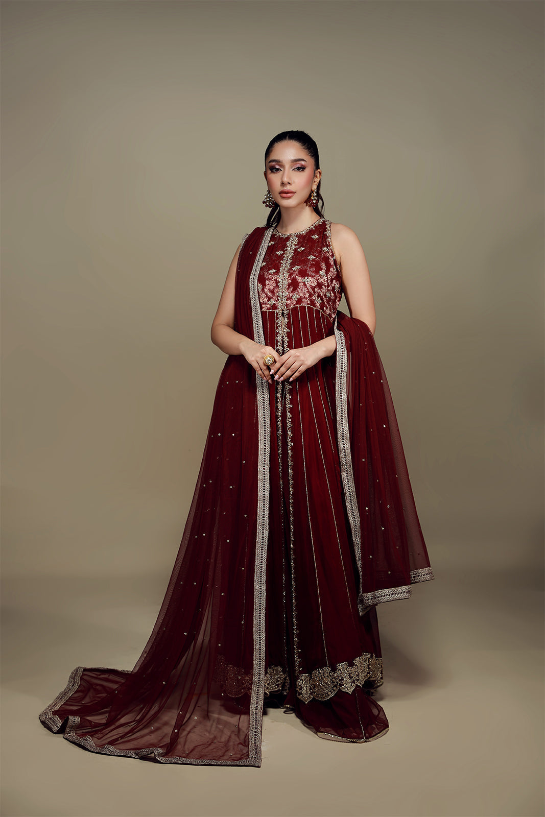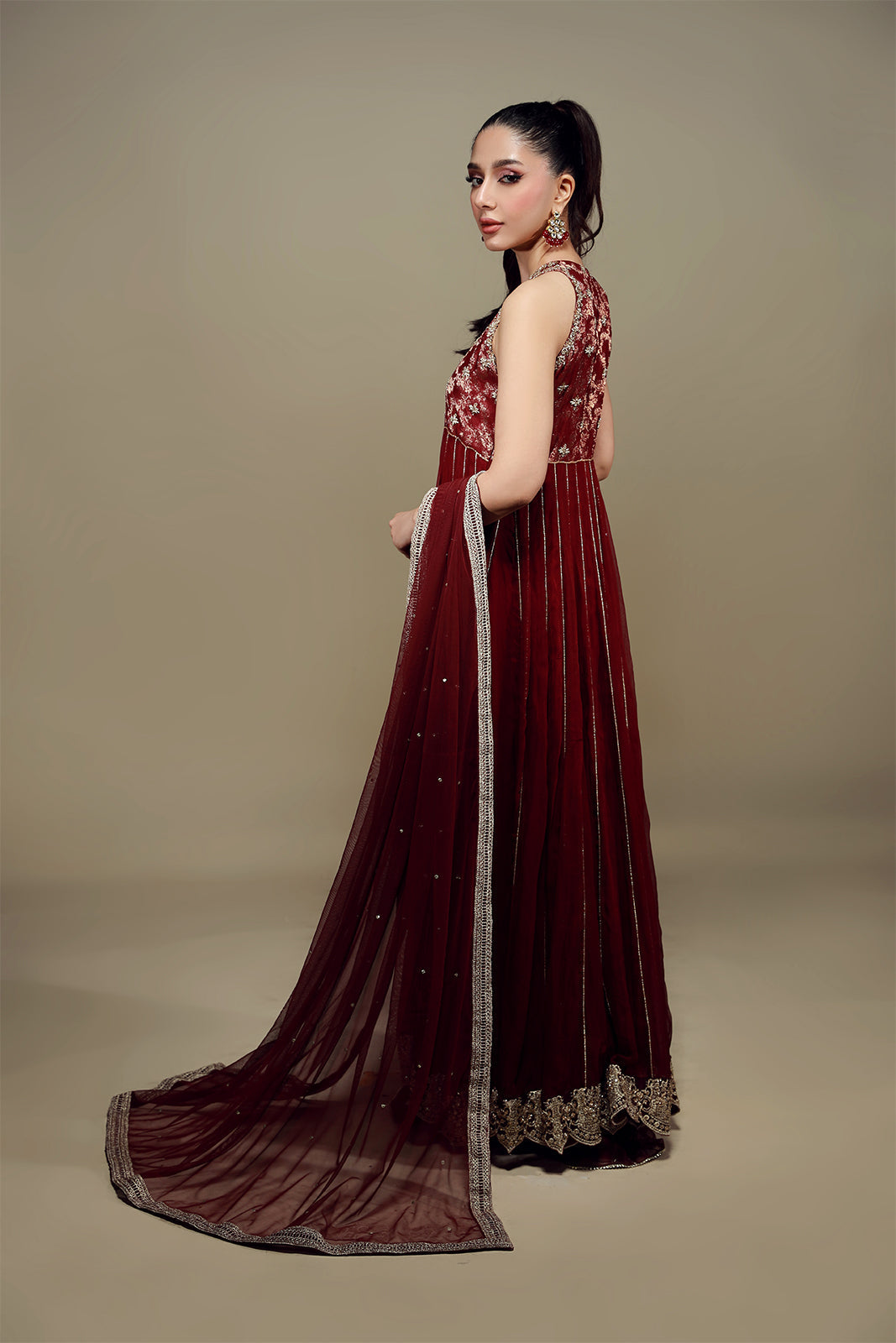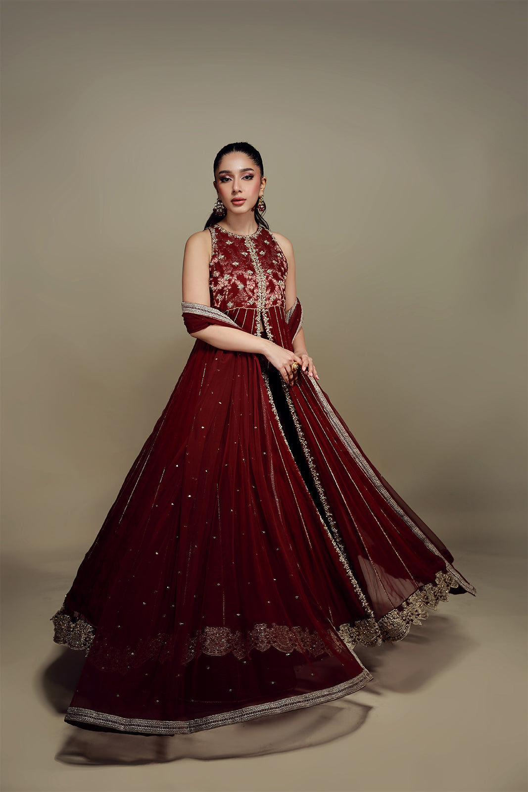 Ce peshwa rouge carmin en mousseline à col halter, orné de délicates broderies zardozi, respire l'opulence ! Associé à un azaar en tulle français assorti et à un magnifique dupatta en tulle français rehaussé de touches dorées et de larges bordures, ce coloris évoque la royauté !