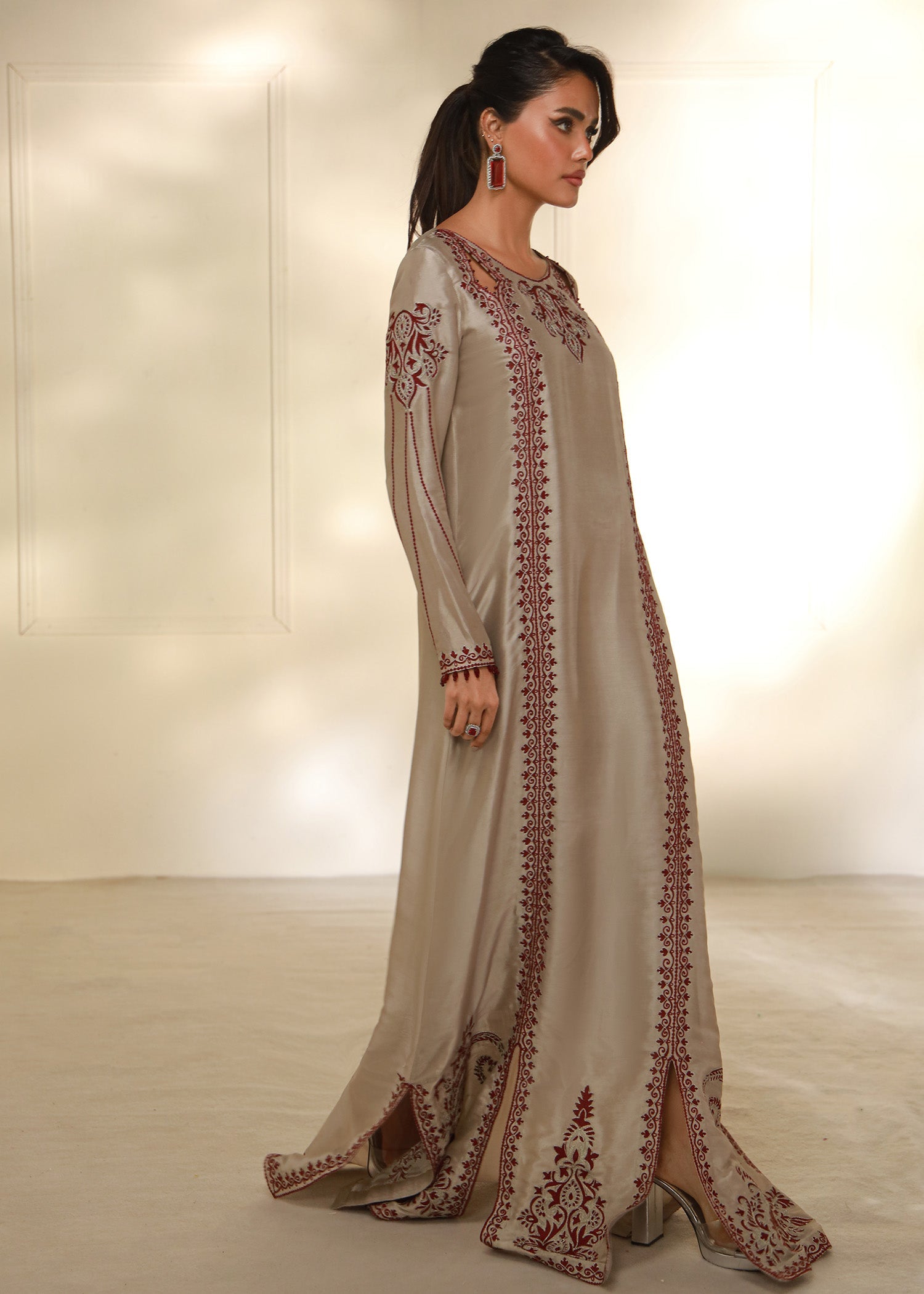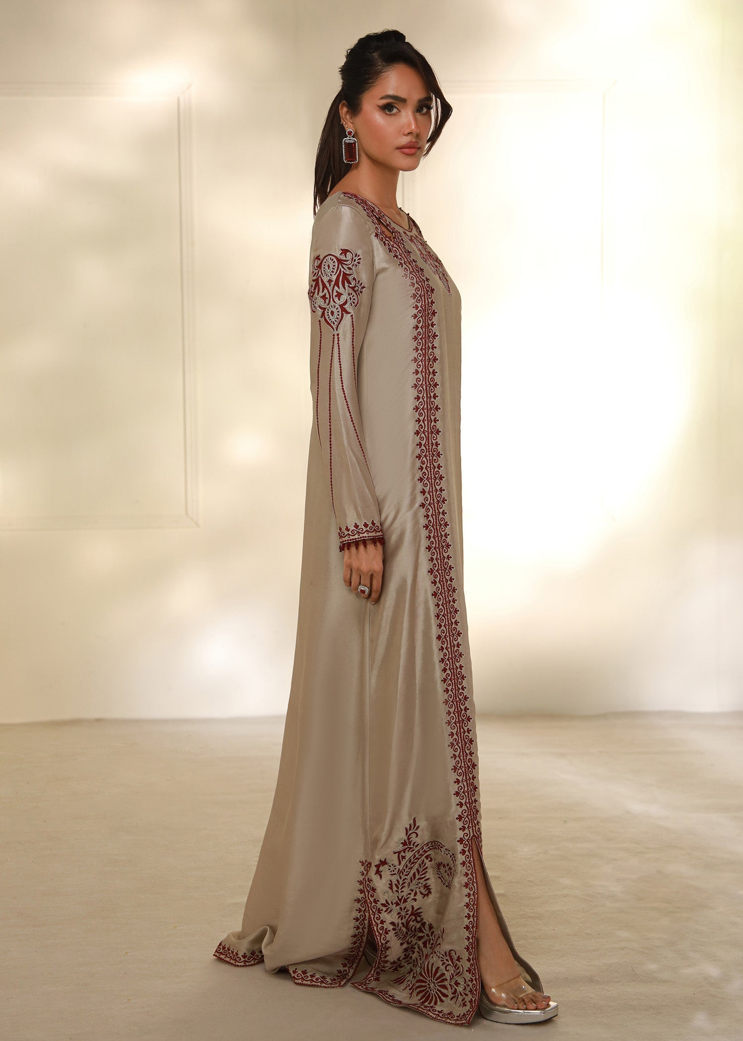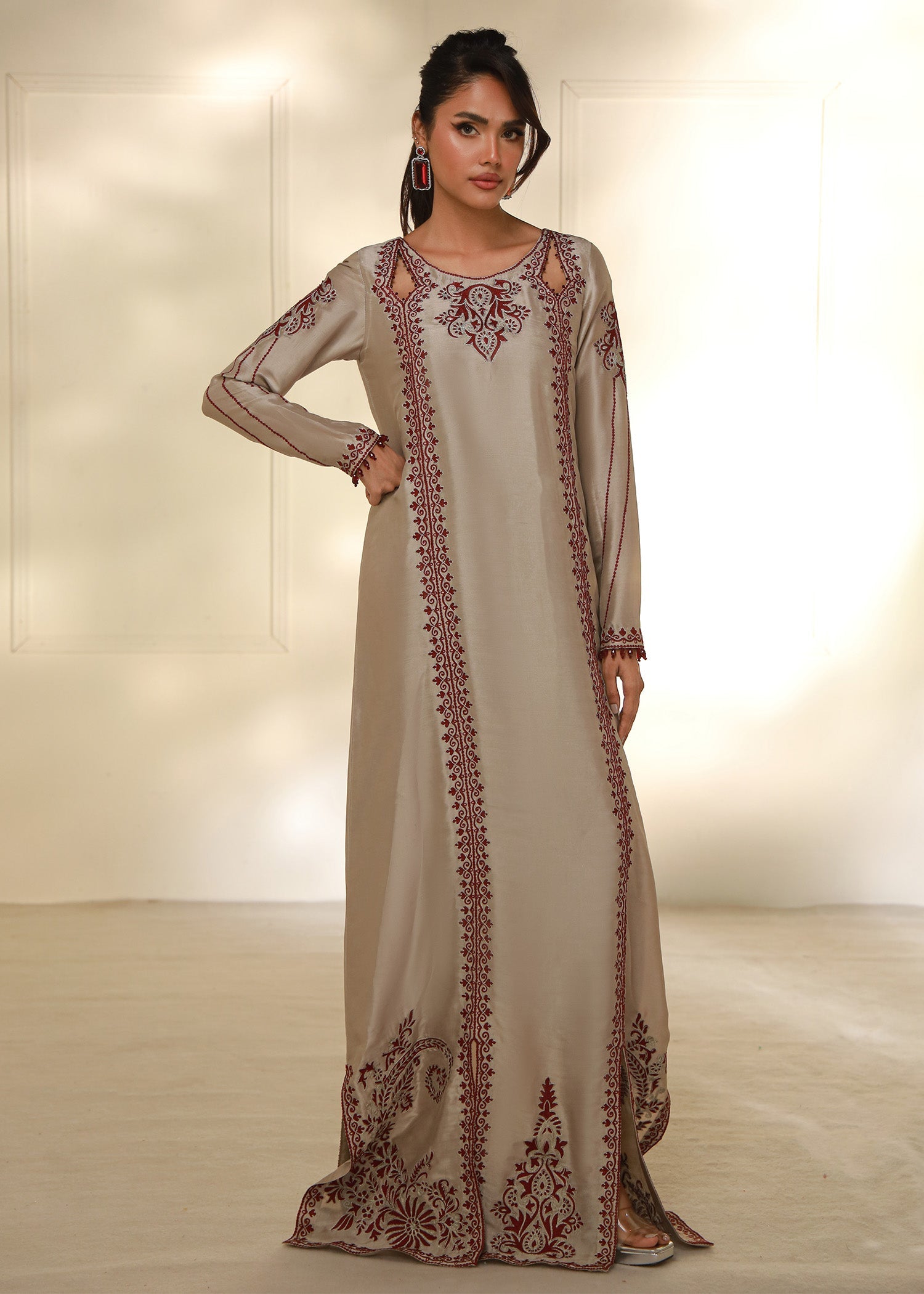Cet élégant caftan beige taupe est confectionné en pure soie Shisha, offrant un toucher doux et luxueux. Orné de délicates broderies Aari bordeaux réalisées à la machine, il présente des motifs raffinés au niveau de l'encolure, des manches et des bordures. Sa silhouette fluide, subtilement découpée, lui confère une touche de sophistication. Parfait pour les fêtes ou les soirées, ce caftan allie confort et style avec élégance.