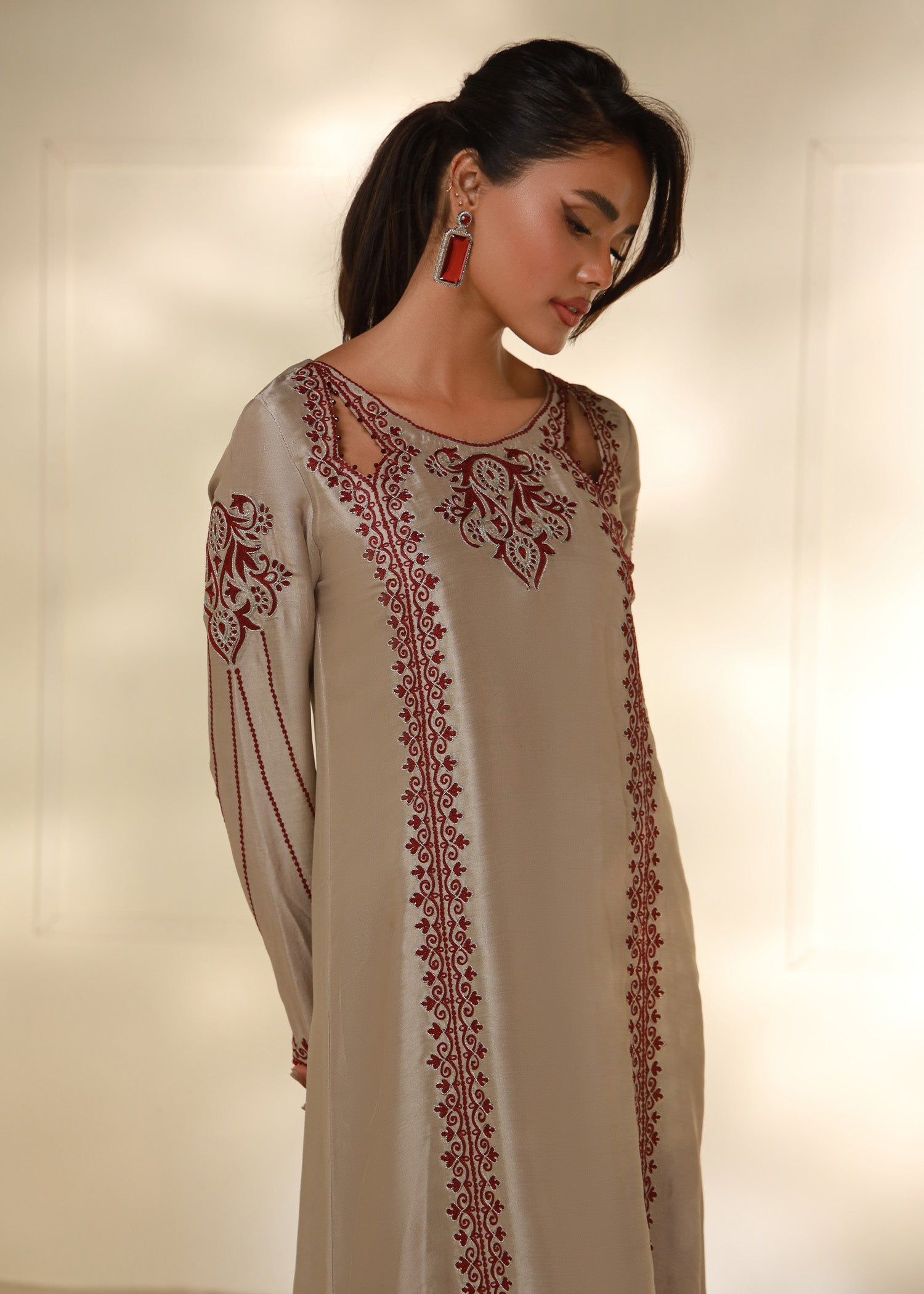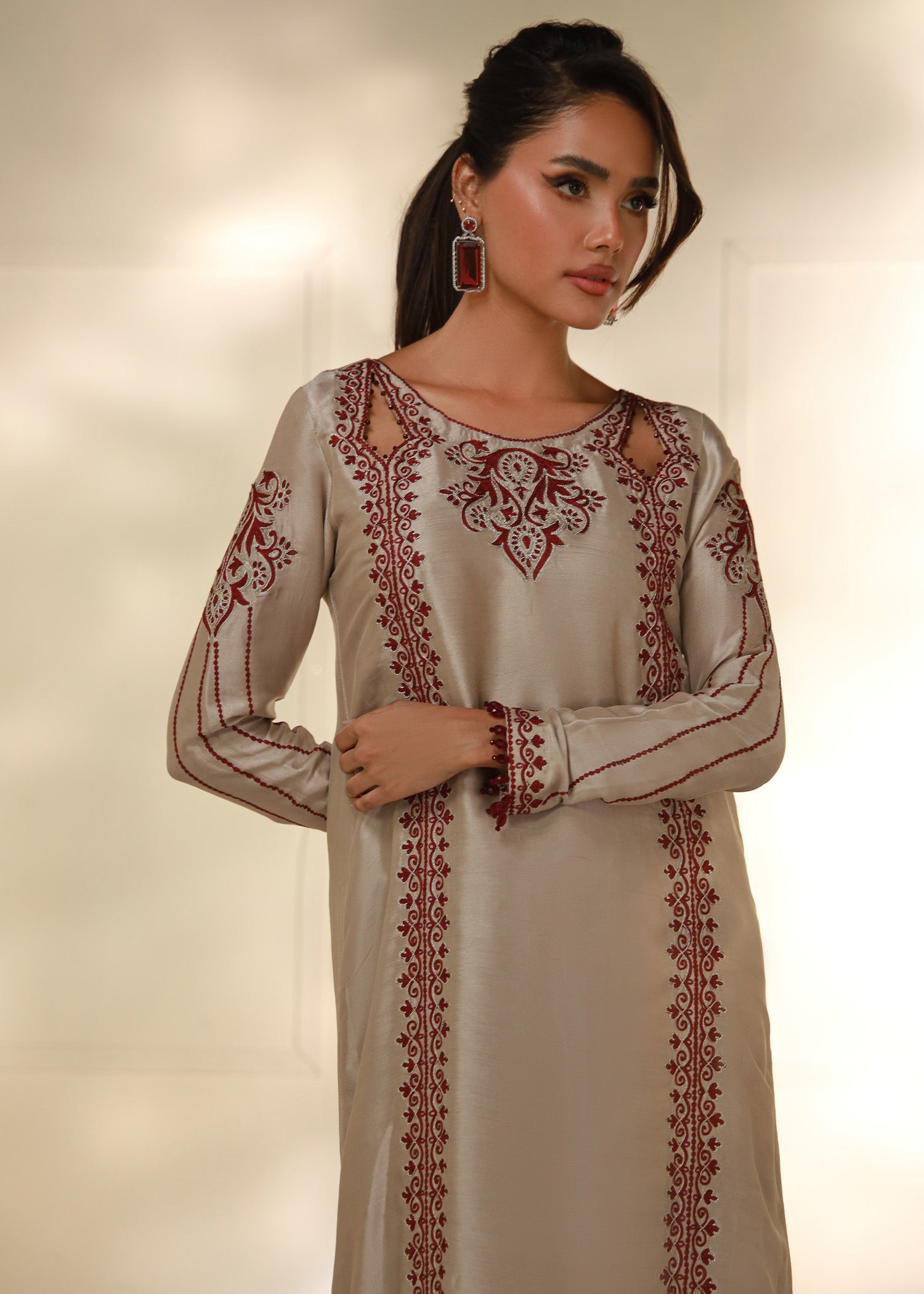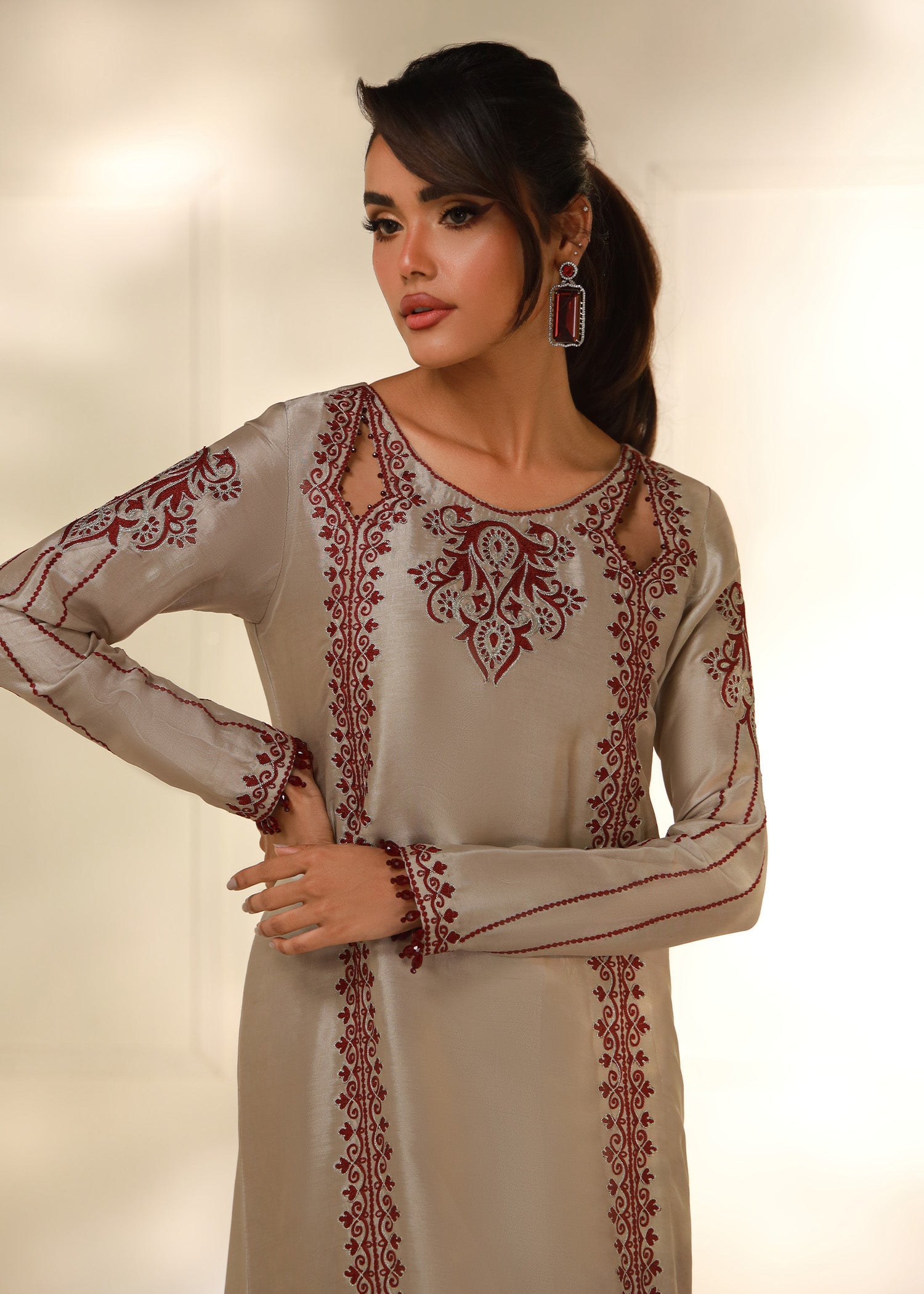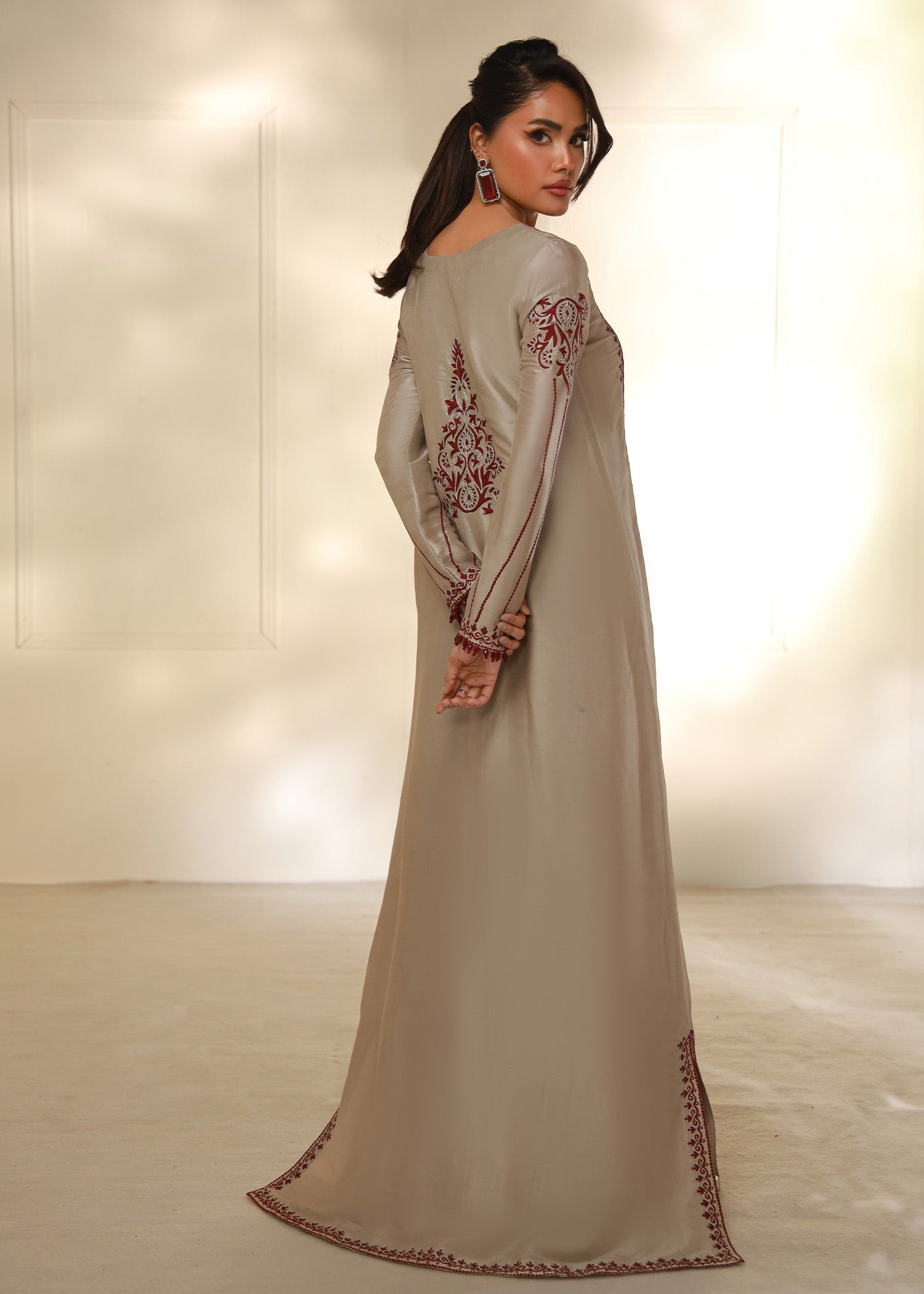 Cet élégant caftan beige taupe est confectionné en pure soie Shisha, offrant un toucher doux et luxueux. Orné de délicates broderies Aari bordeaux réalisées à la machine, il présente des motifs raffinés au niveau de l'encolure, des manches et des bordures. Sa silhouette fluide, subtilement découpée, lui confère une touche de sophistication. Parfait pour les fêtes ou les soirées, ce caftan allie confort et style avec élégance.