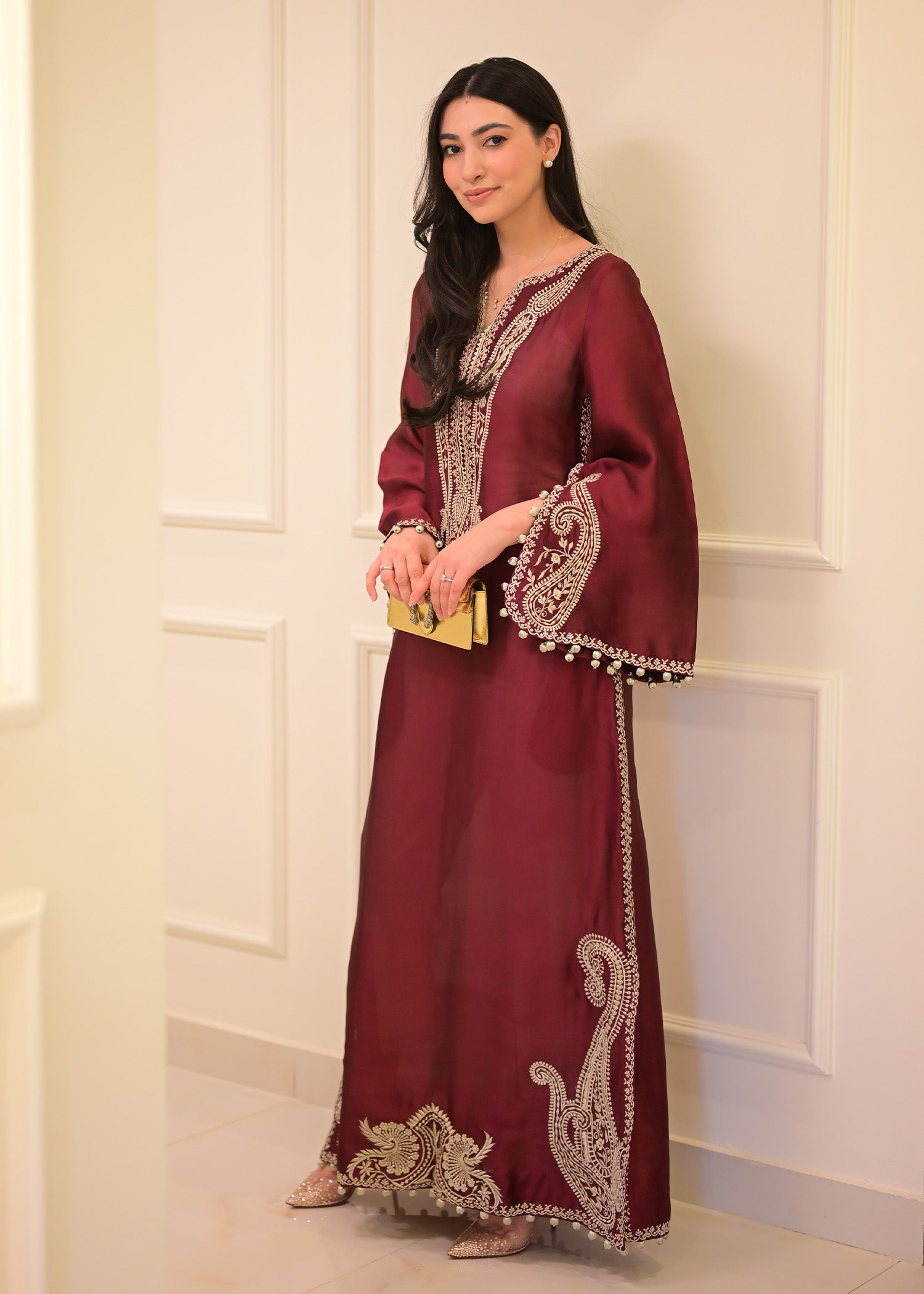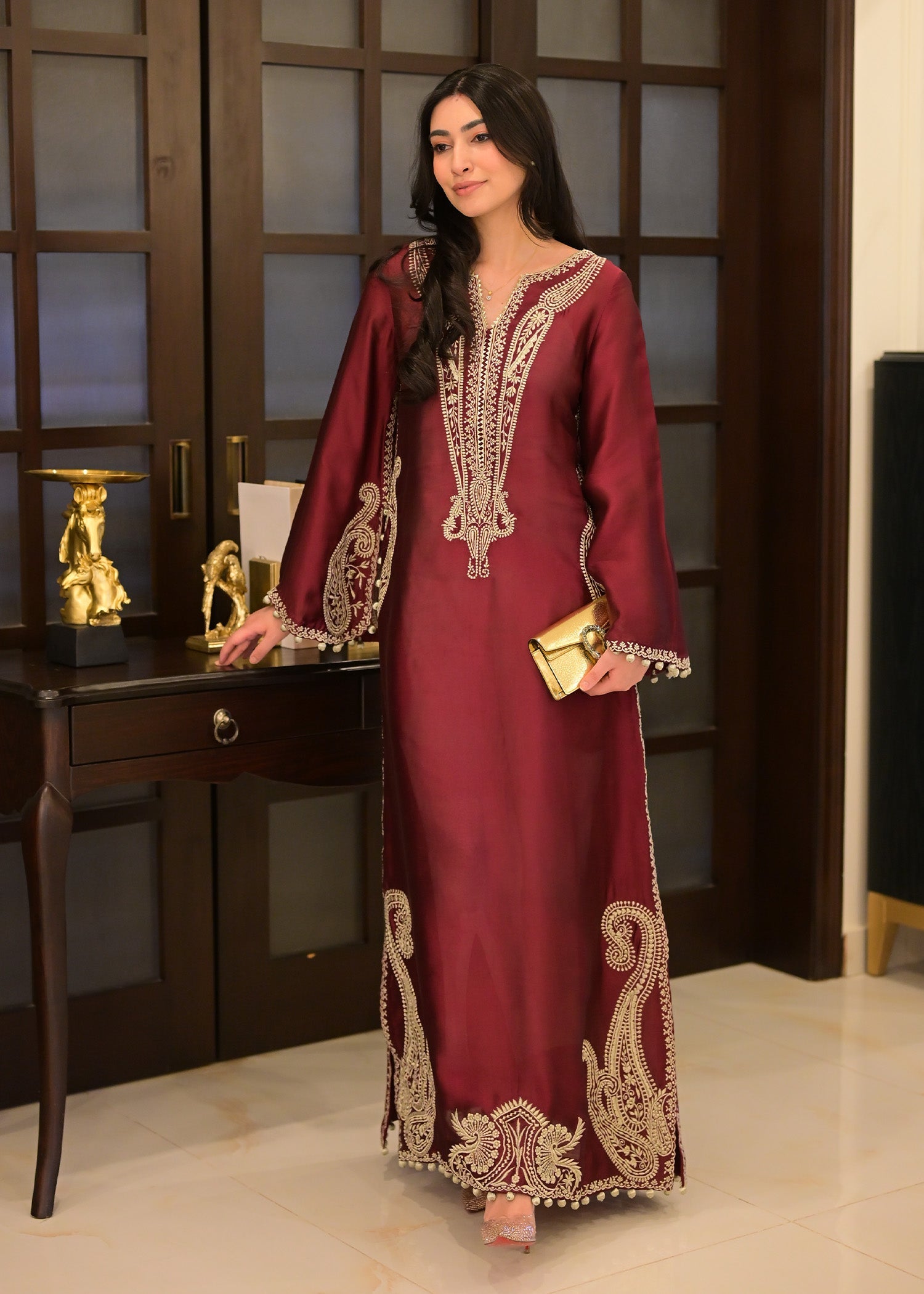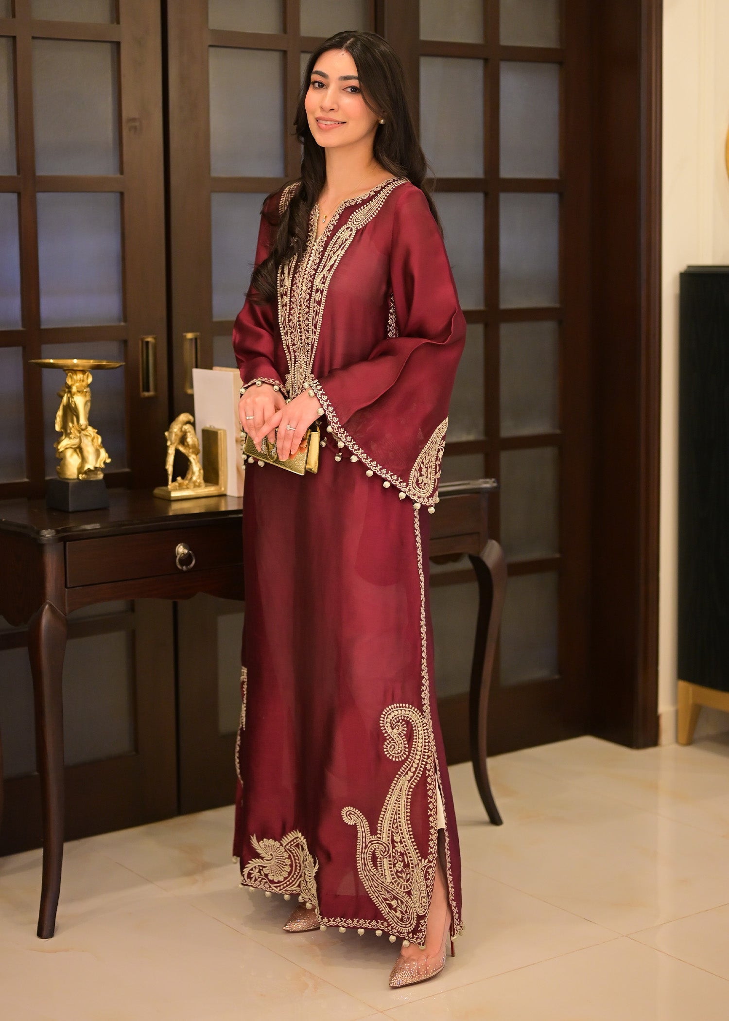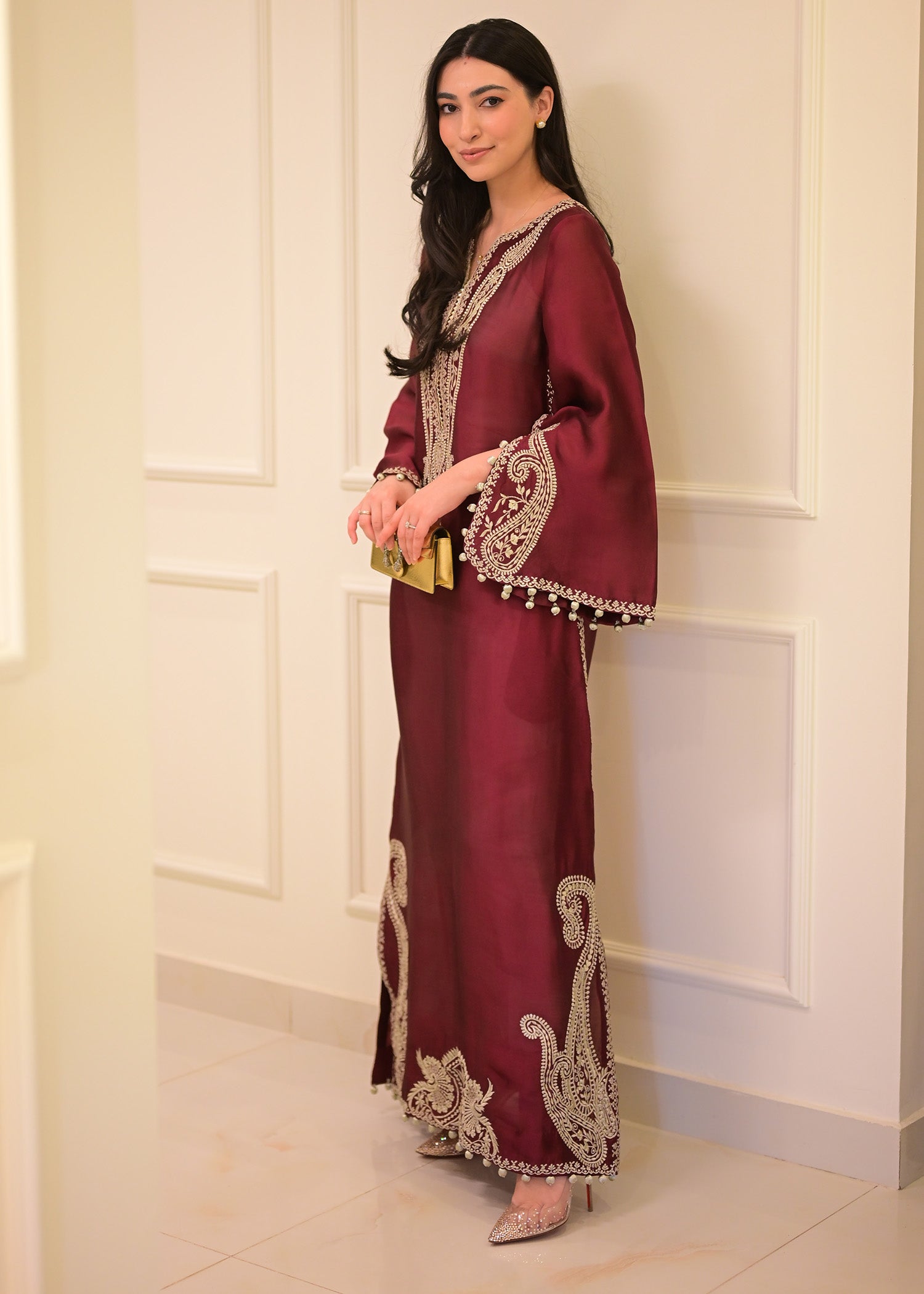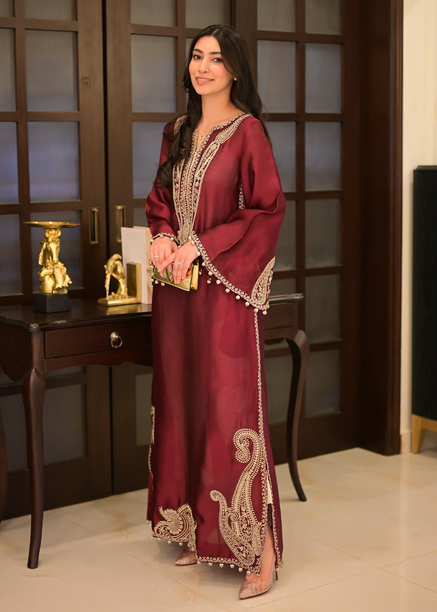 Ce somptueux caftan bordeaux est un chef-d'œuvre d'élégance, confectionné dans la plus fine soie pure. Les broderies réalisées à la main témoignent du savoir-faire et de l'expertise de l'artisan, conférant à l'ensemble une touche de sophistication et de raffinement. La coupe des manches apporte une touche de modernité au caftan traditionnel, créant une silhouette unique et captivante. Les perles de zari, délicatement disposées, ajoutent une note luxueuse et poétique, captant la lumière et scintillant au moindre mouvement.