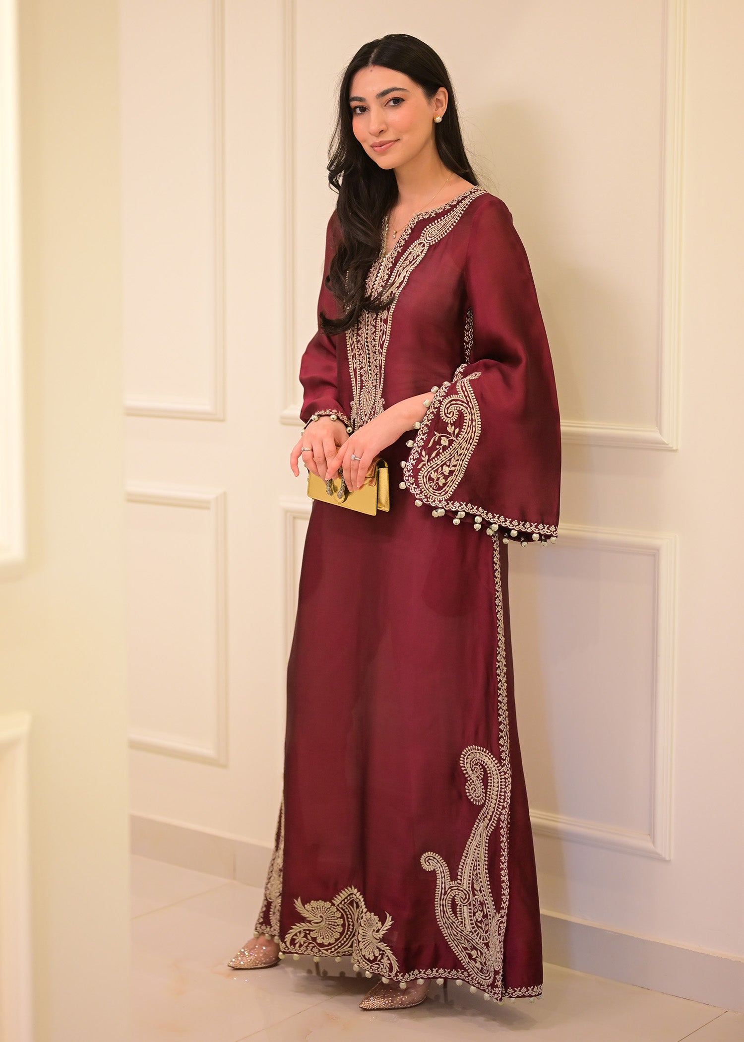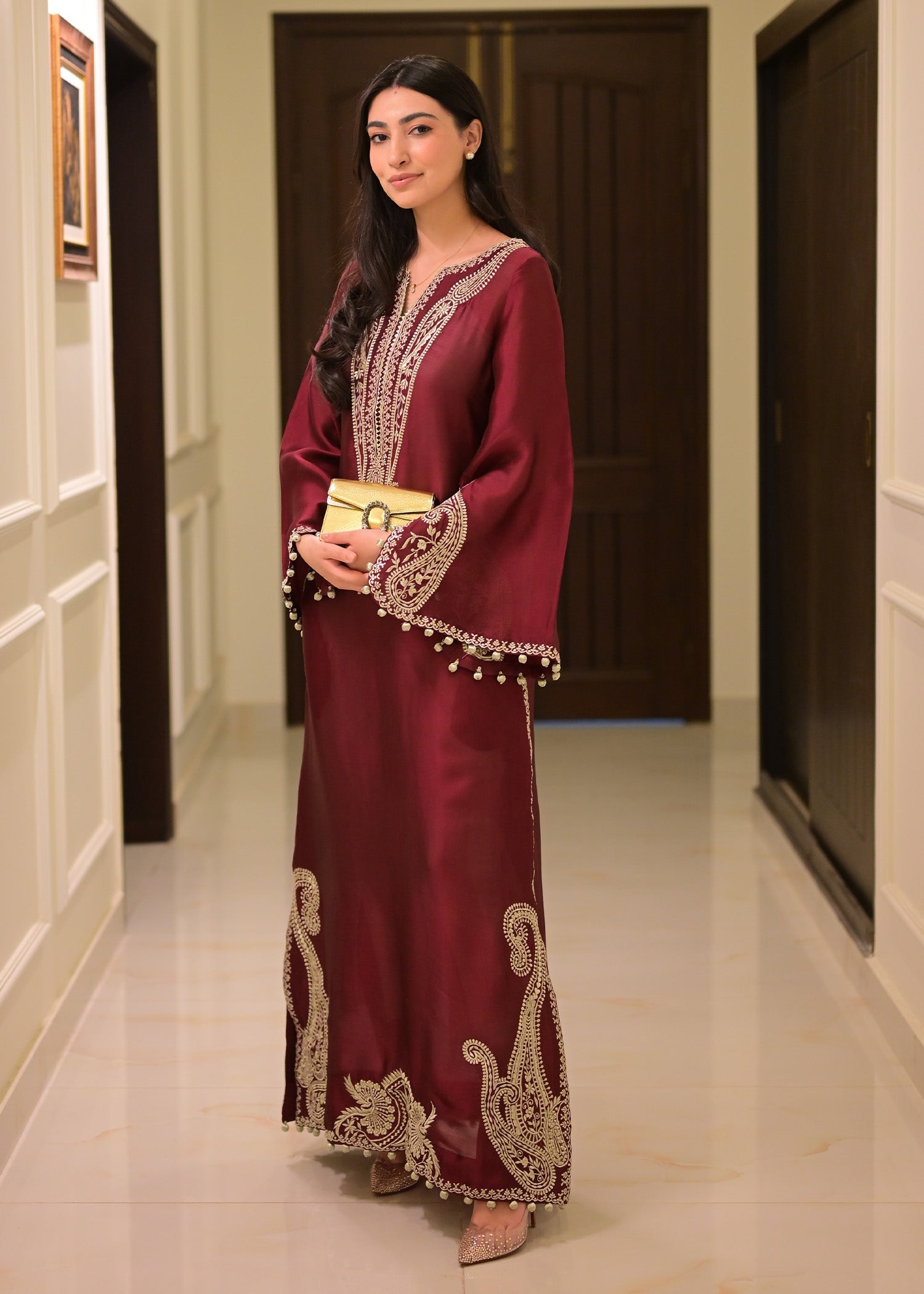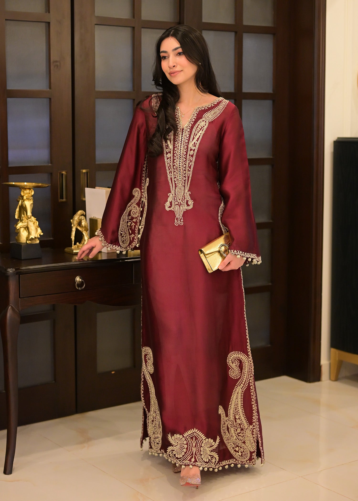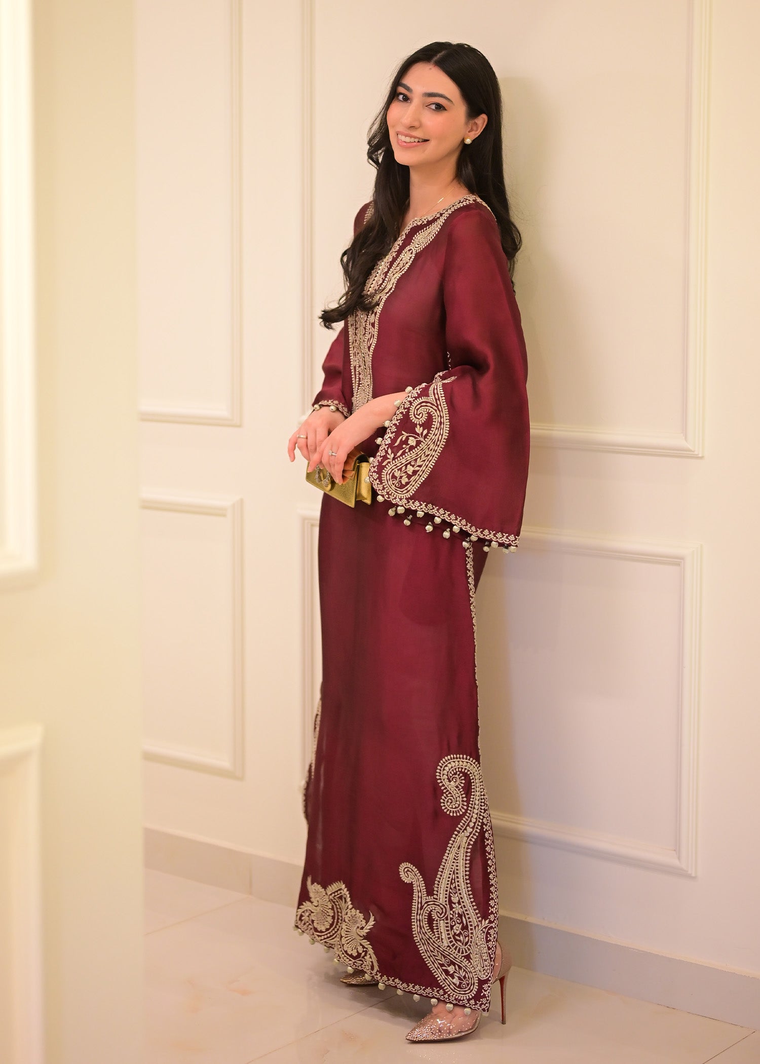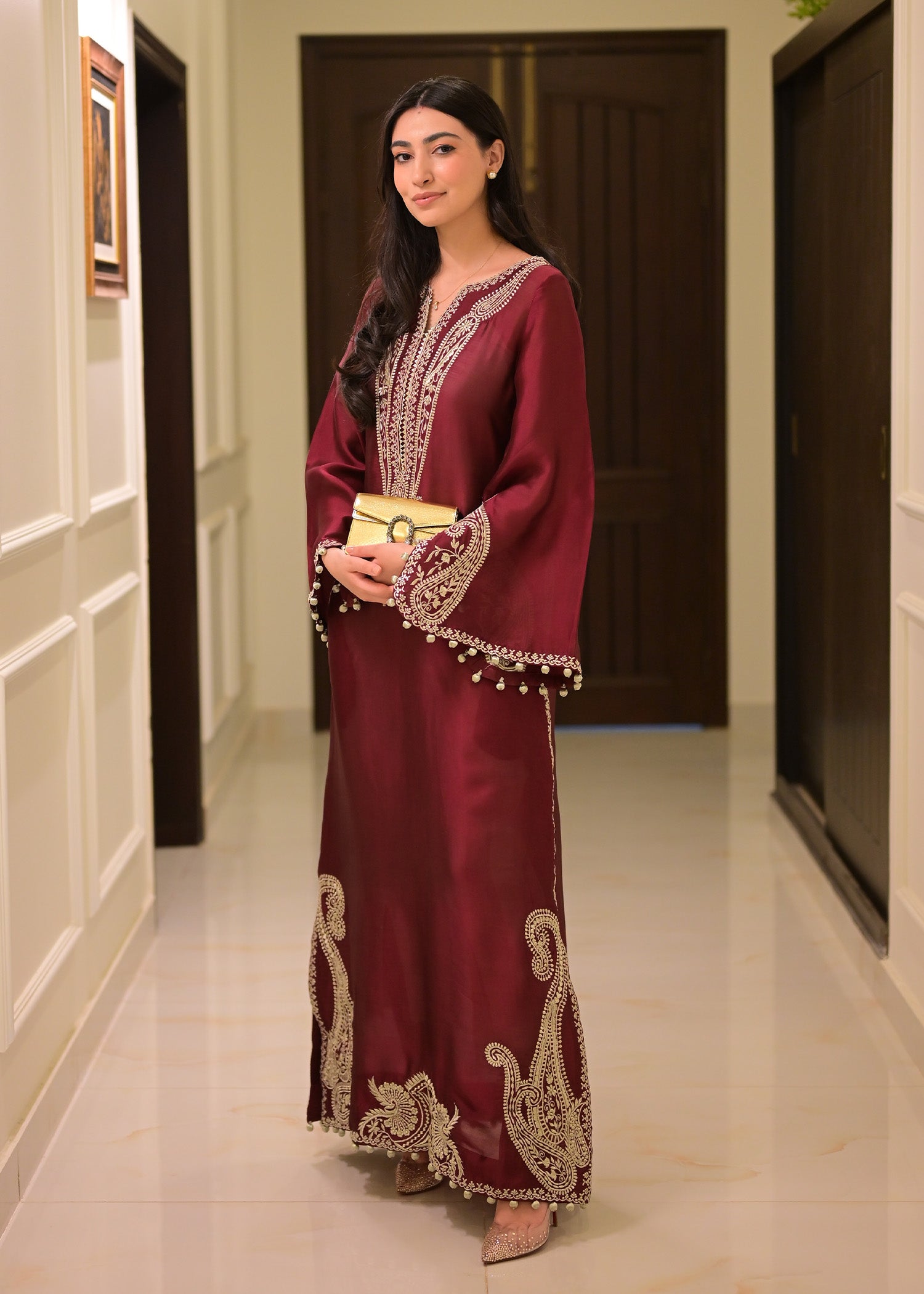 Ce somptueux caftan bordeaux est un chef-d'œuvre d'élégance, confectionné dans la plus fine soie pure. Les broderies réalisées à la main témoignent du savoir-faire et de l'expertise de l'artisan, conférant à l'ensemble une touche de sophistication et de raffinement. La coupe des manches apporte une touche de modernité au caftan traditionnel, créant une silhouette unique et captivante. Les perles de zari, délicatement disposées, ajoutent une note luxueuse et poétique, captant la lumière et scintillant au moindre mouvement.