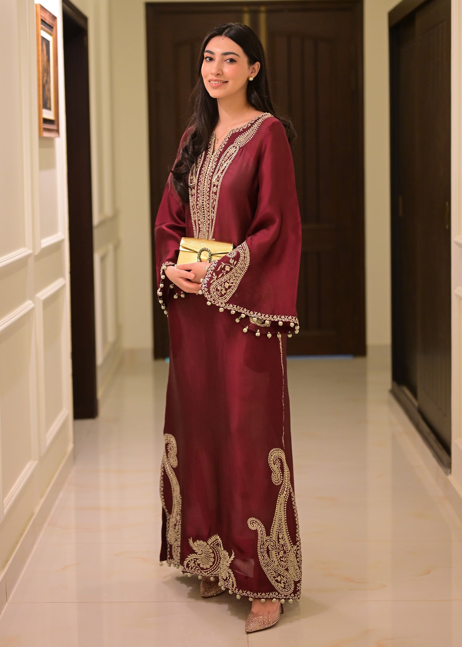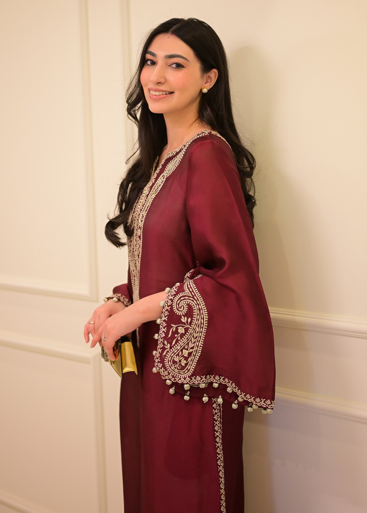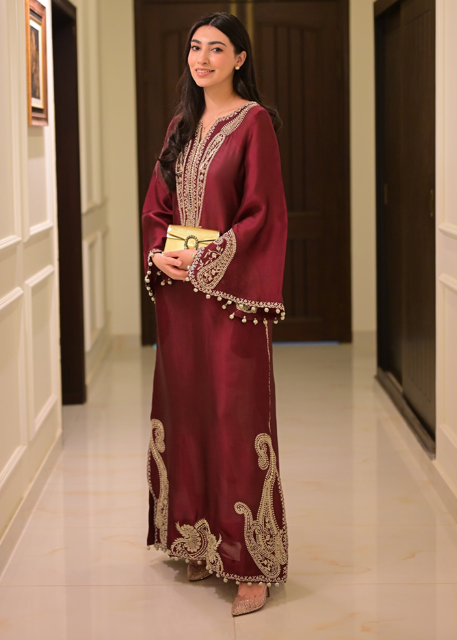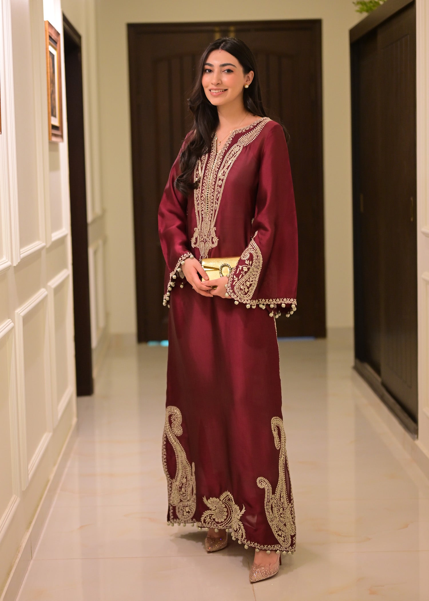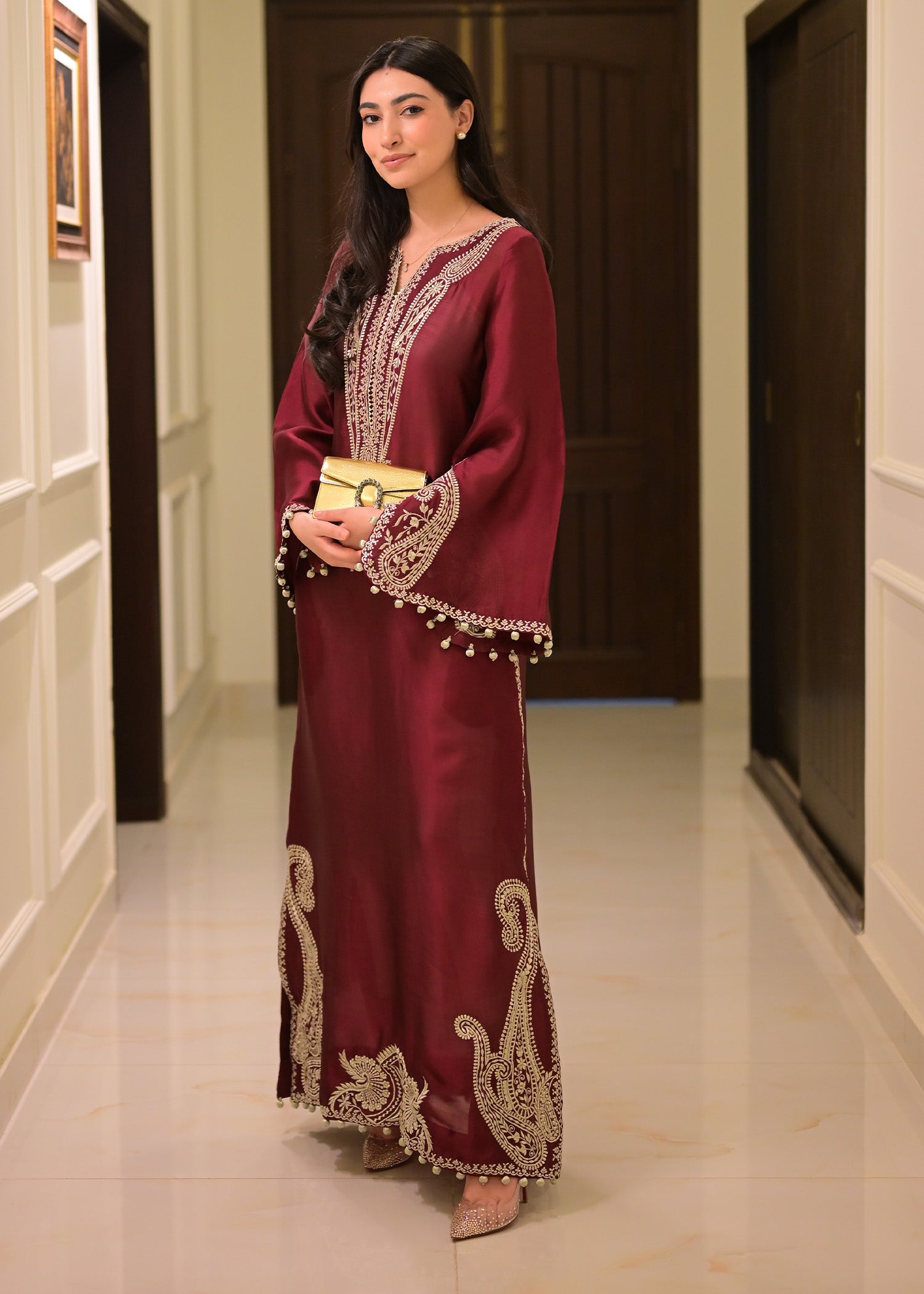 Ce somptueux caftan bordeaux est un chef-d'œuvre d'élégance, confectionné dans la plus fine soie pure. Les broderies réalisées à la main témoignent du savoir-faire et de l'expertise de l'artisan, conférant à l'ensemble une touche de sophistication et de raffinement. La coupe des manches apporte une touche de modernité au caftan traditionnel, créant une silhouette unique et captivante. Les perles de zari, délicatement disposées, ajoutent une note luxueuse et poétique, captant la lumière et scintillant au moindre mouvement.