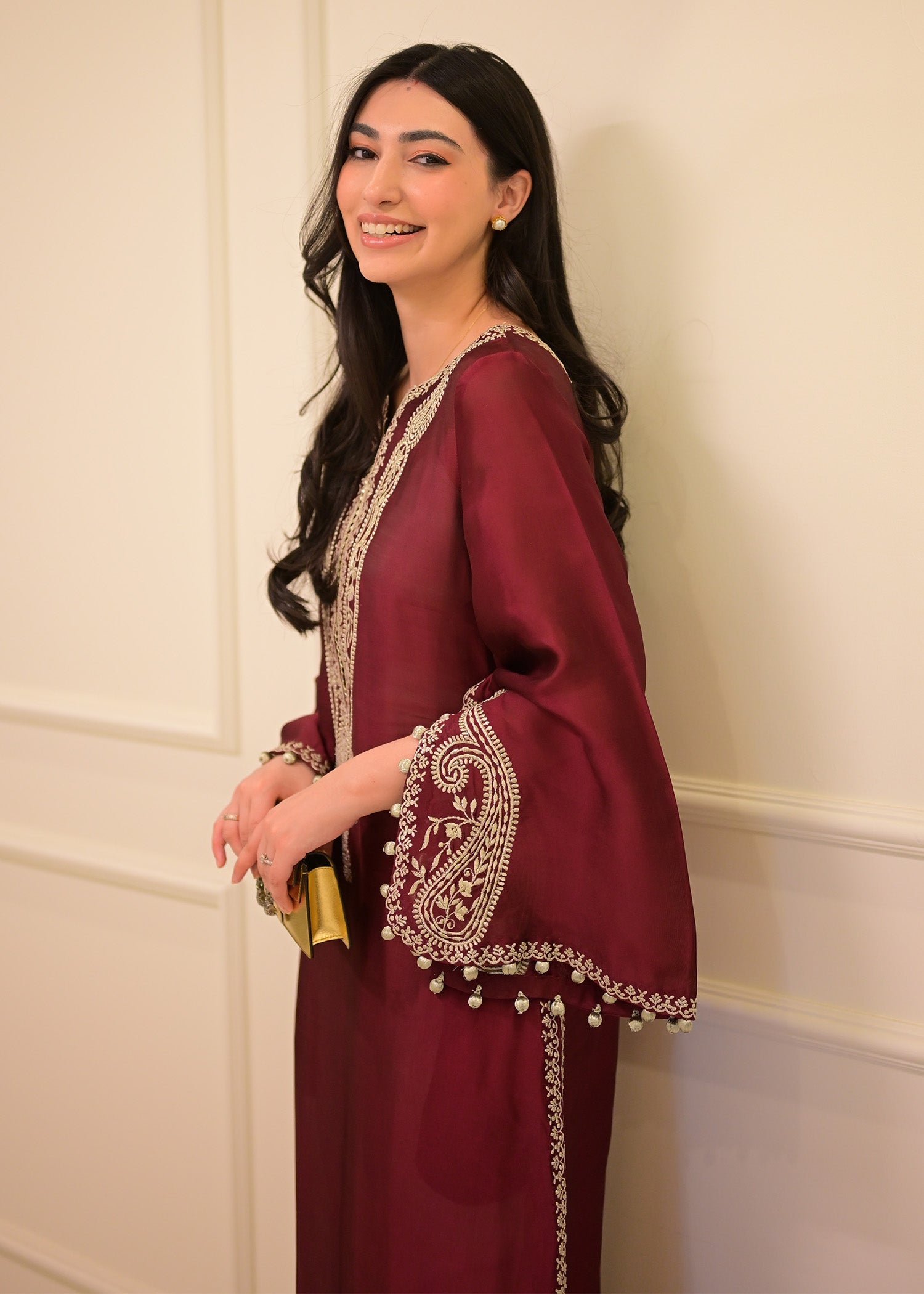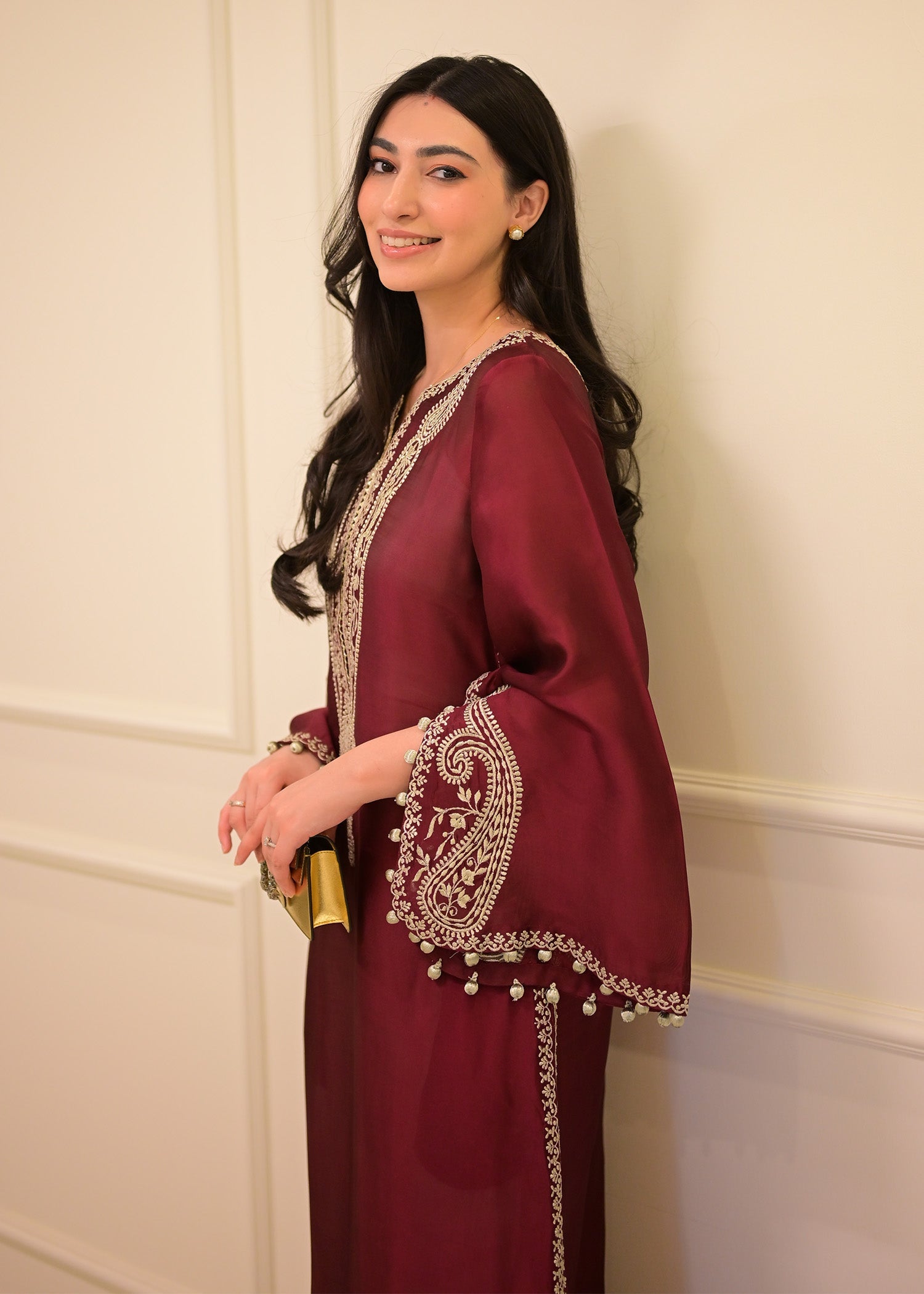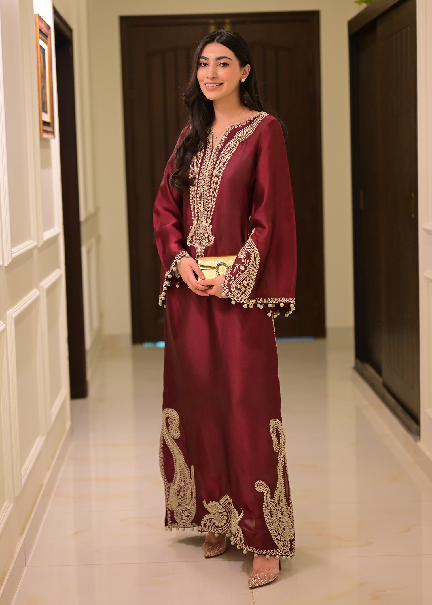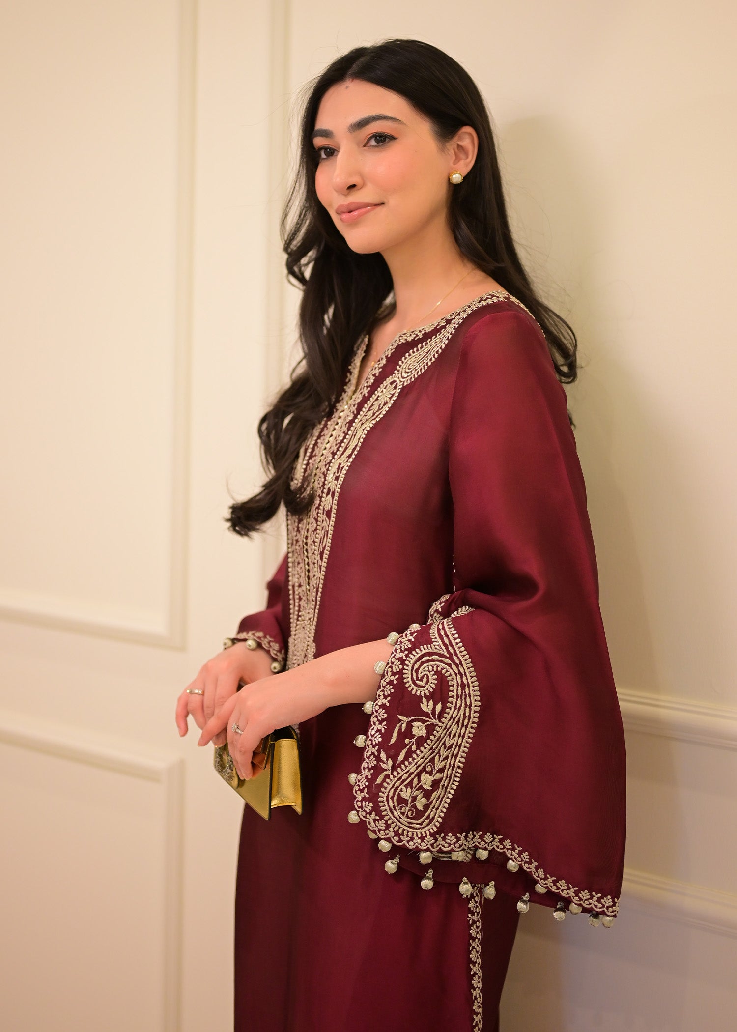 Ce somptueux caftan bordeaux est un chef-d'œuvre d'élégance, confectionné dans la plus fine soie pure. Les broderies réalisées à la main témoignent du savoir-faire et de l'expertise de l'artisan, conférant à l'ensemble une touche de sophistication et de raffinement. La coupe des manches apporte une touche de modernité au caftan traditionnel, créant une silhouette unique et captivante. Les perles de zari, délicatement disposées, ajoutent une note luxueuse et poétique, captant la lumière et scintillant au moindre mouvement.