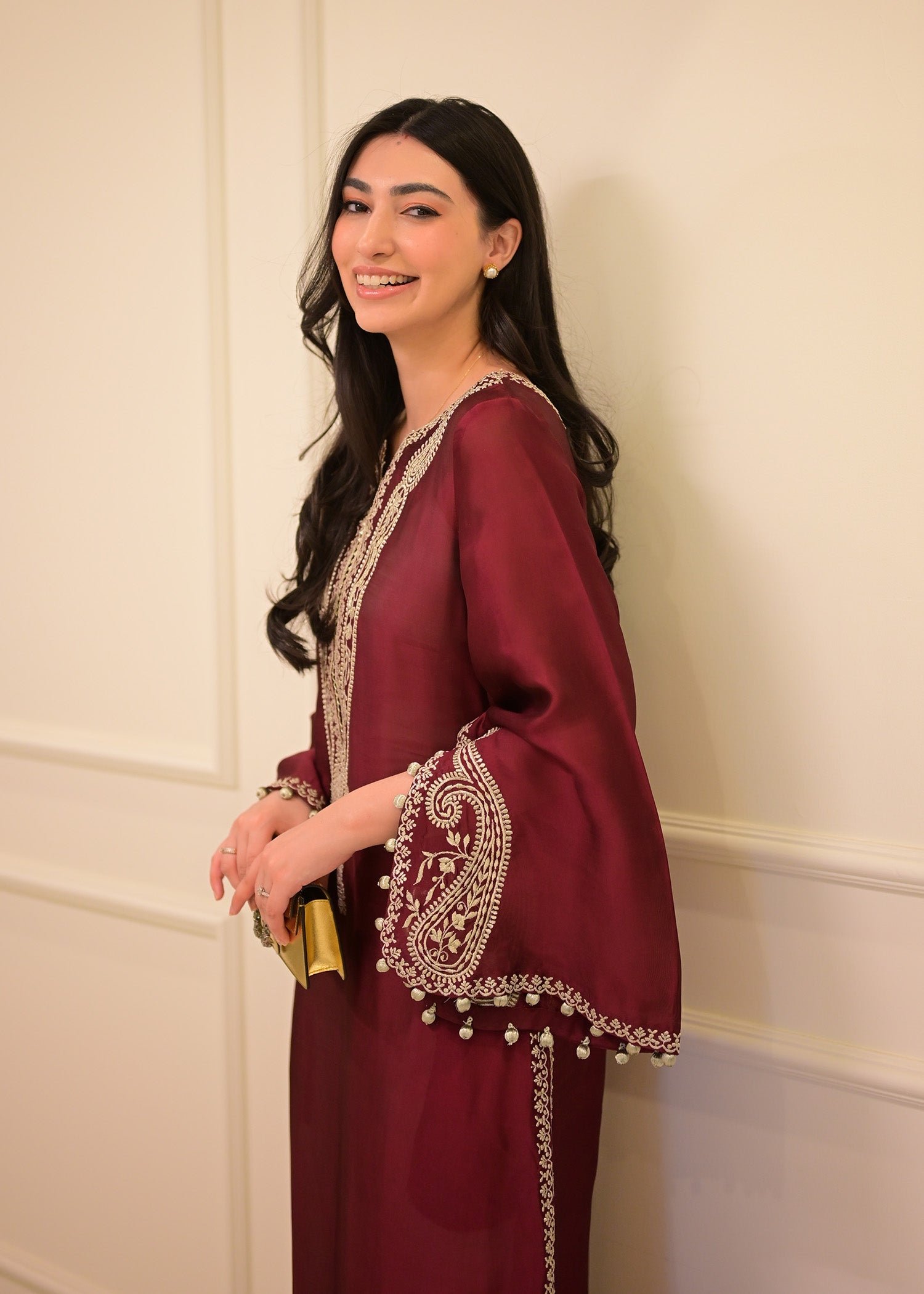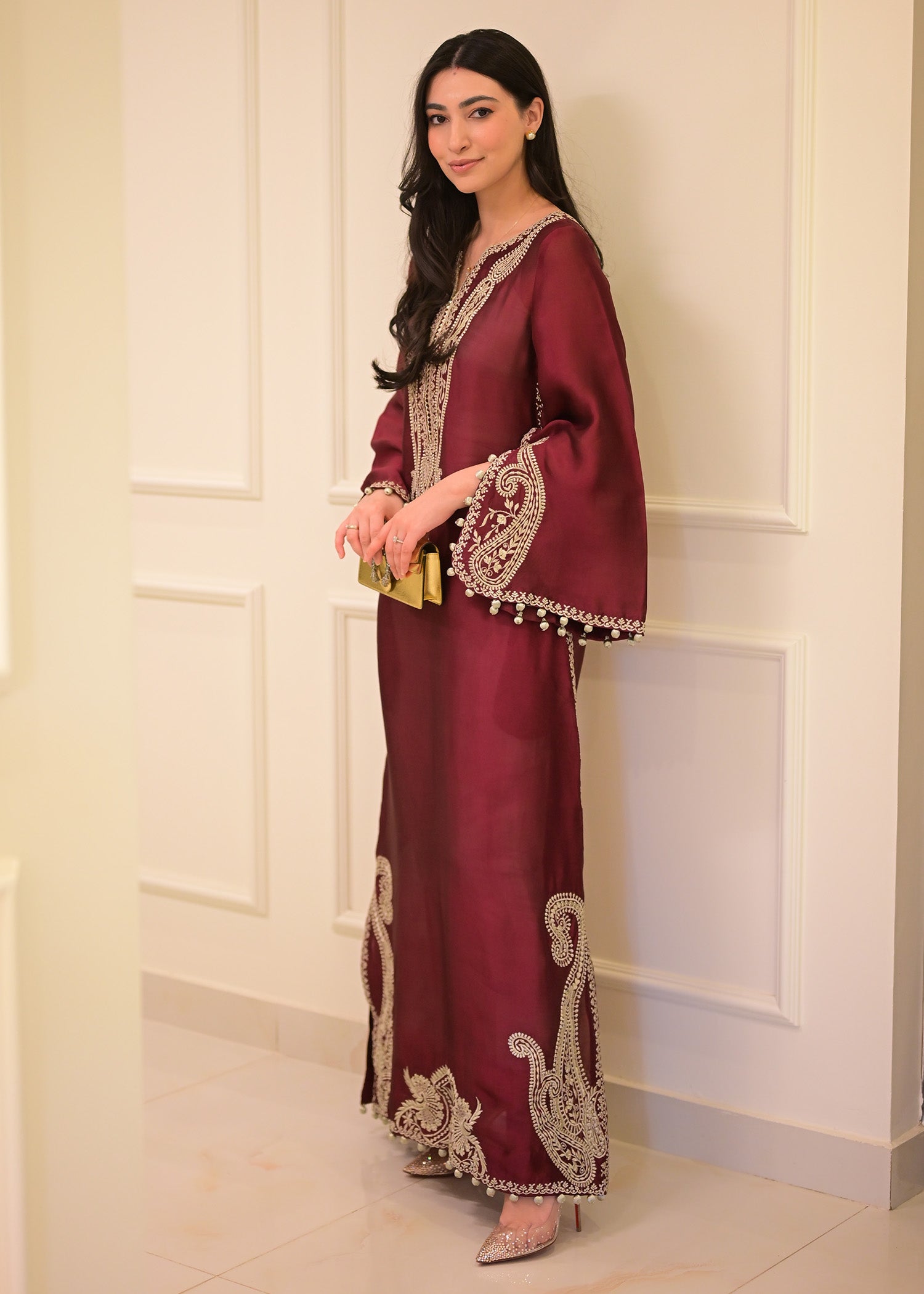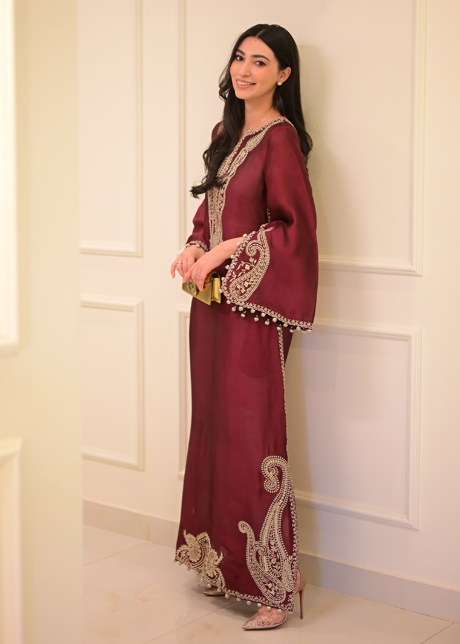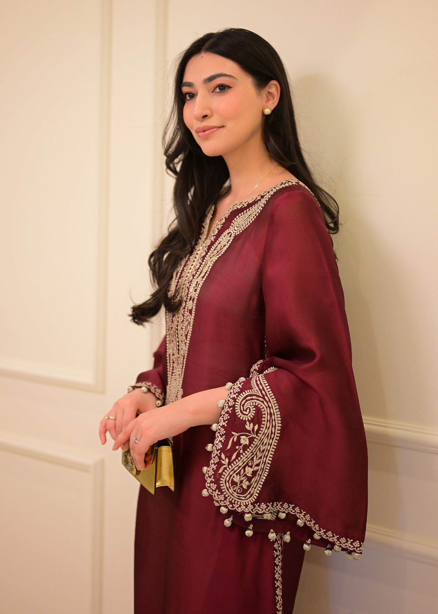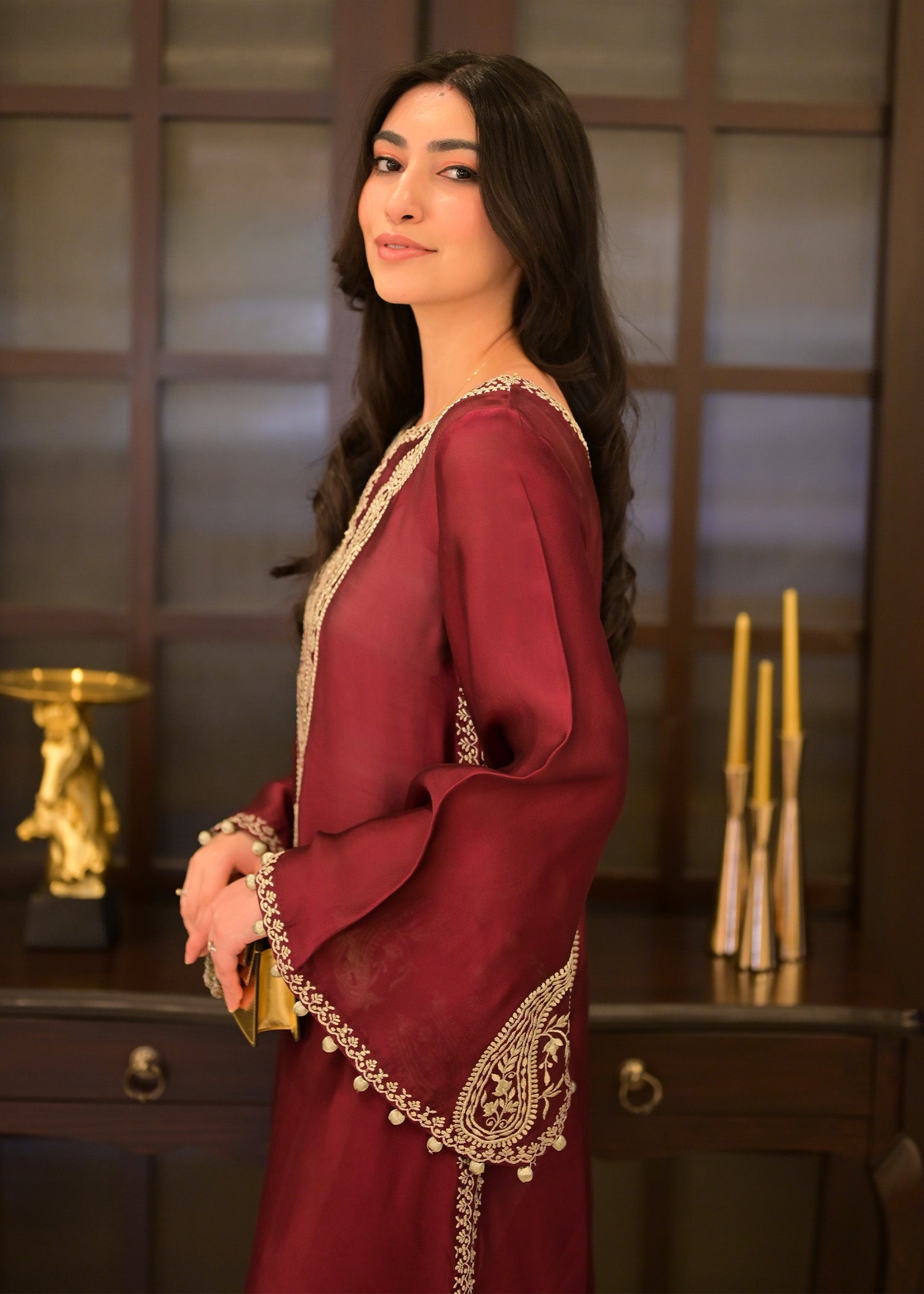 Ce somptueux caftan bordeaux est un chef-d'œuvre d'élégance, confectionné dans la plus fine soie pure. Les broderies réalisées à la main témoignent du savoir-faire et de l'expertise de l'artisan, conférant à l'ensemble une touche de sophistication et de raffinement. La coupe des manches apporte une touche de modernité au caftan traditionnel, créant une silhouette unique et captivante. Les perles de zari, délicatement disposées, ajoutent une note luxueuse et poétique, captant la lumière et scintillant au moindre mouvement.