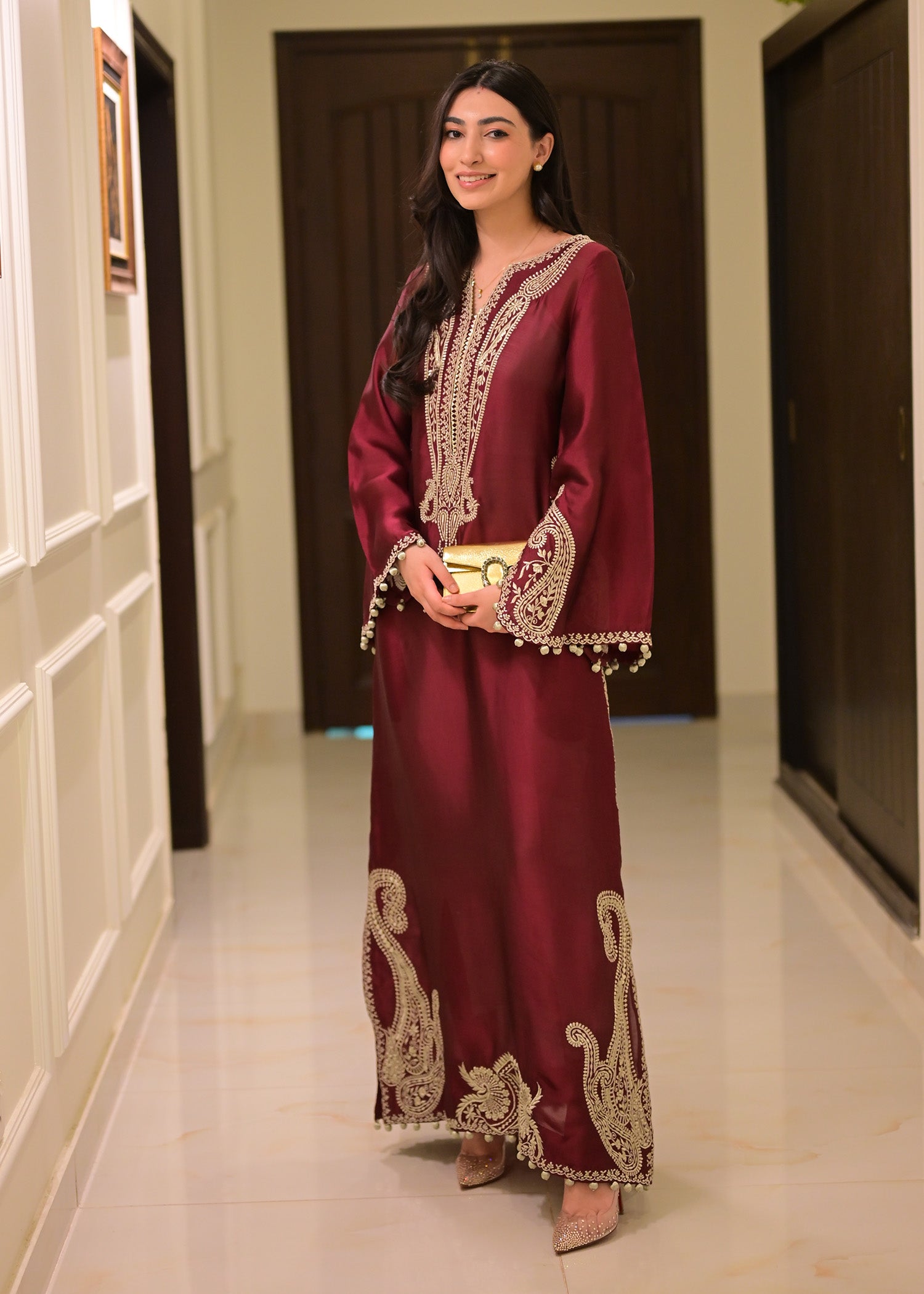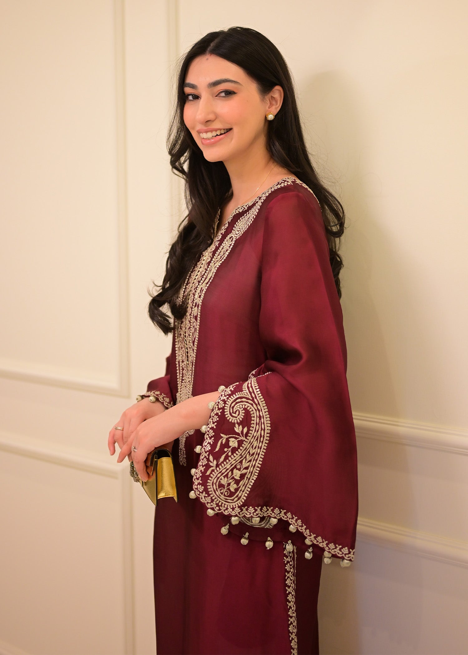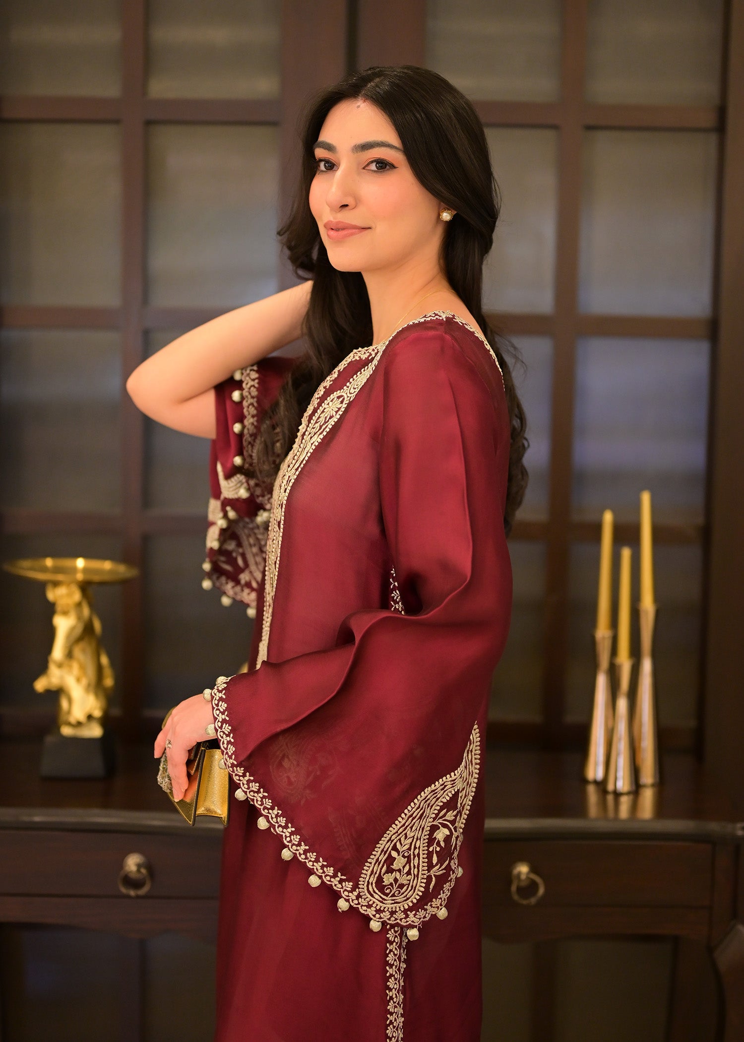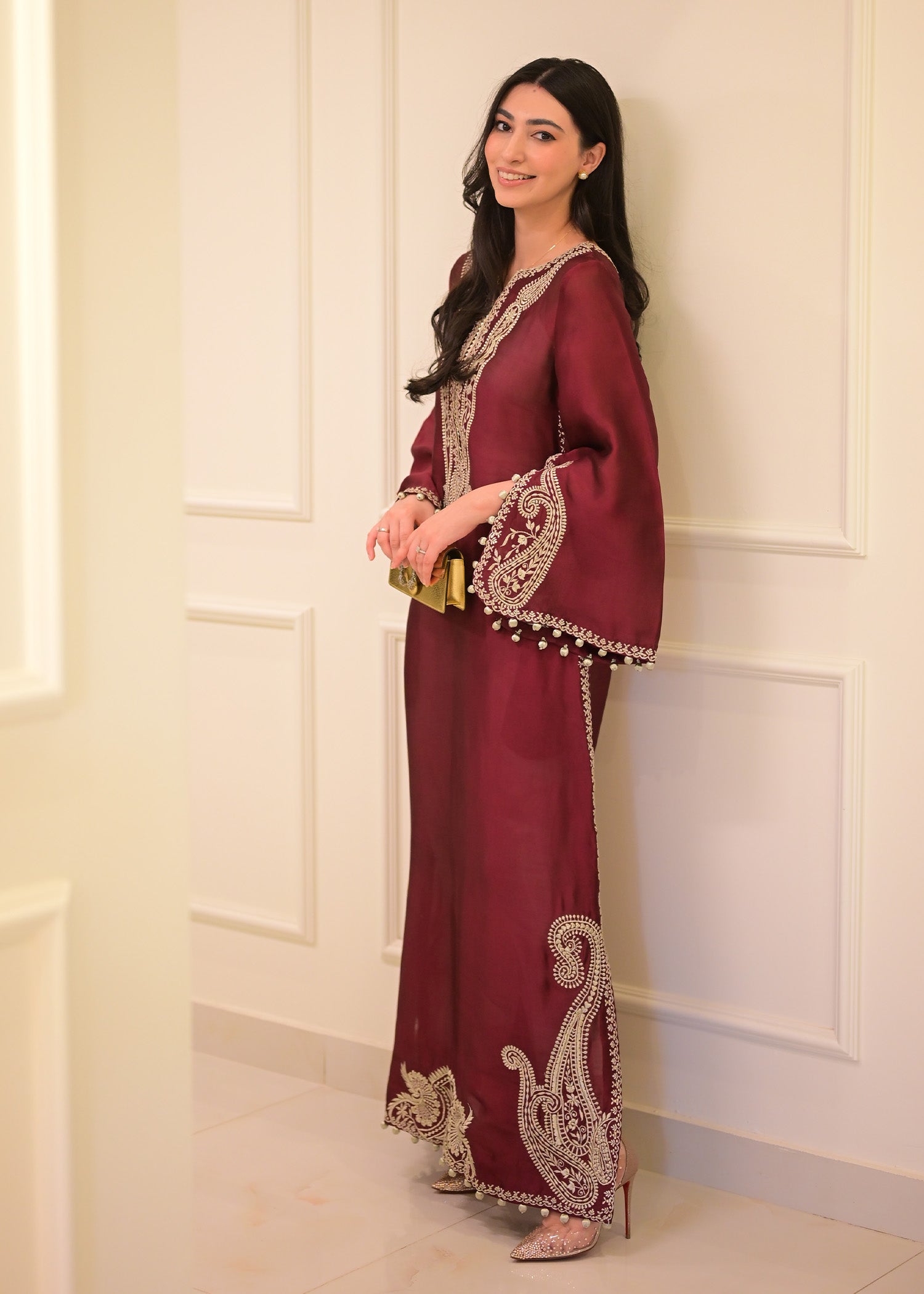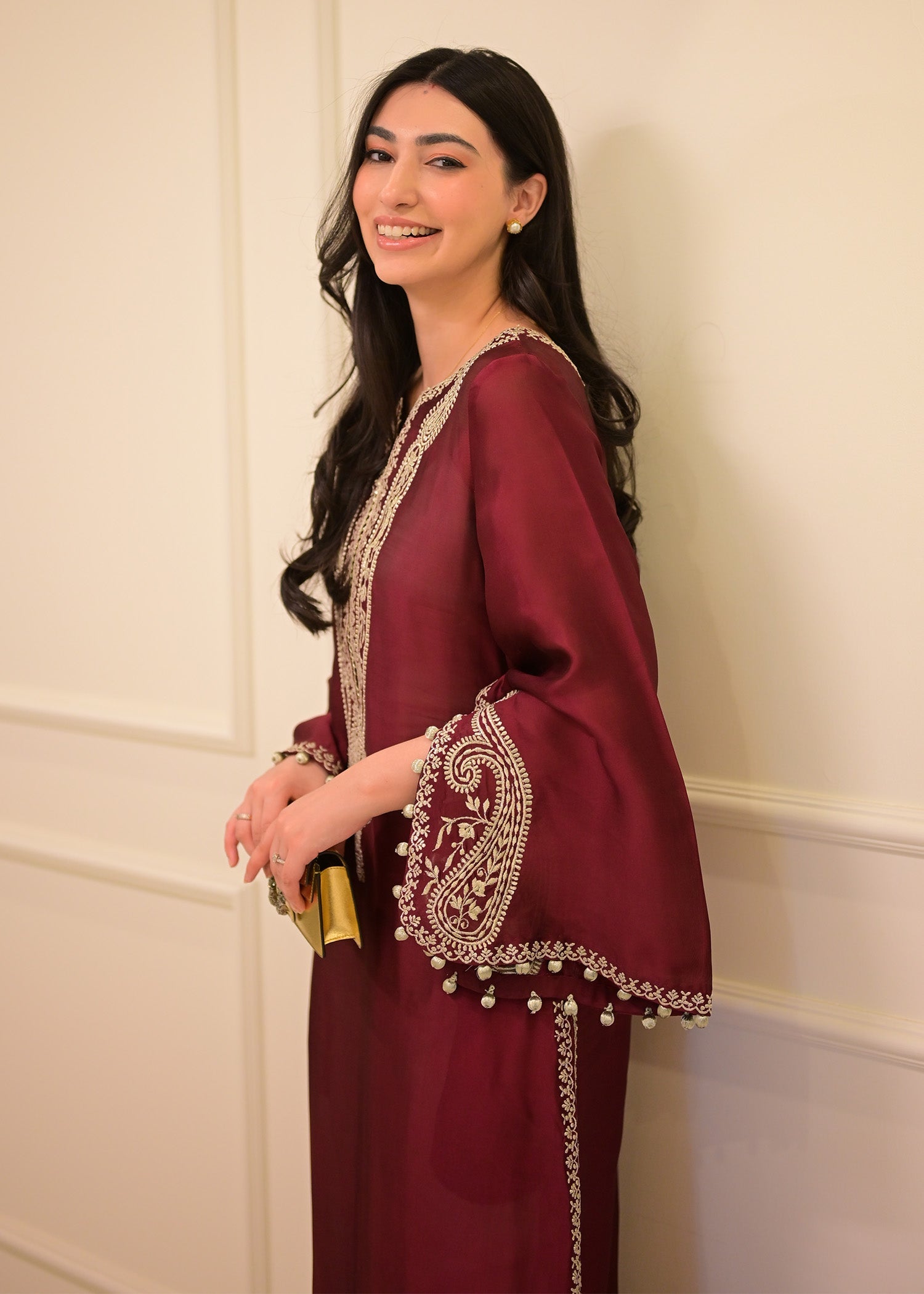 Ce somptueux caftan bordeaux est un chef-d'œuvre d'élégance, confectionné dans la plus fine soie pure. Les broderies réalisées à la main témoignent du savoir-faire et de l'expertise de l'artisan, conférant à l'ensemble une touche de sophistication et de raffinement. La coupe des manches apporte une touche de modernité au caftan traditionnel, créant une silhouette unique et captivante. Les perles de zari, délicatement disposées, ajoutent une note luxueuse et poétique, captant la lumière et scintillant au moindre mouvement.