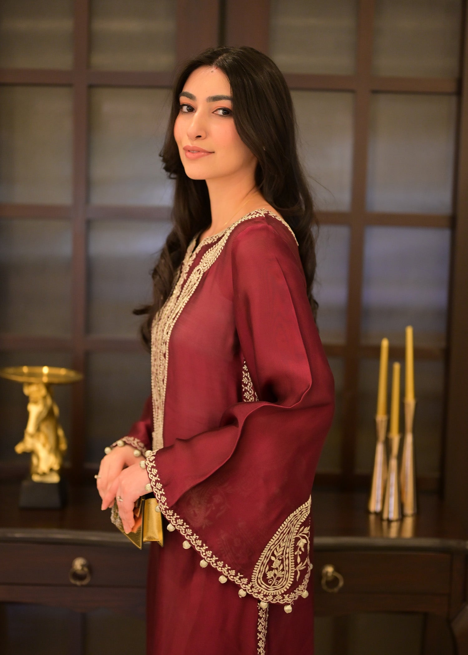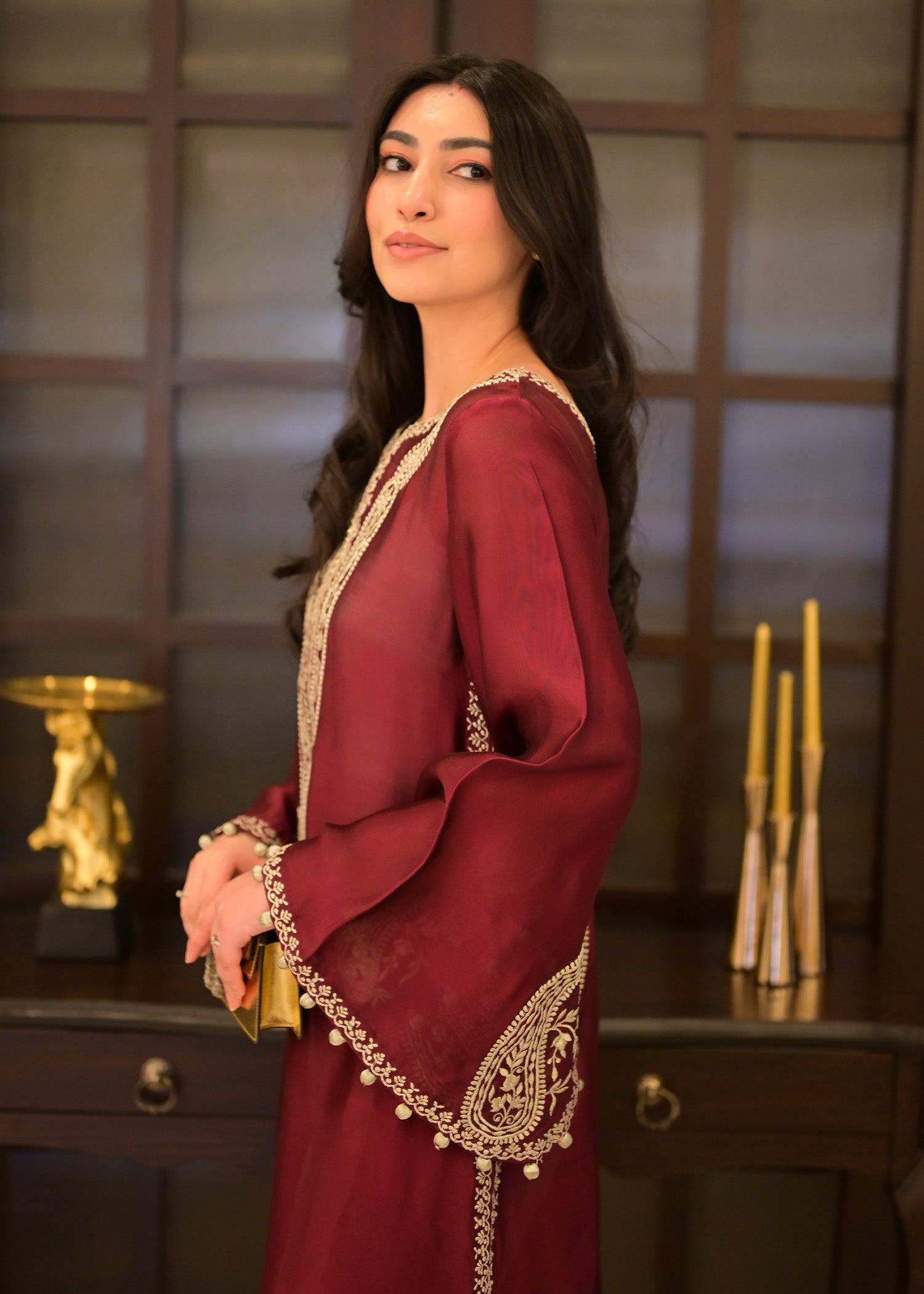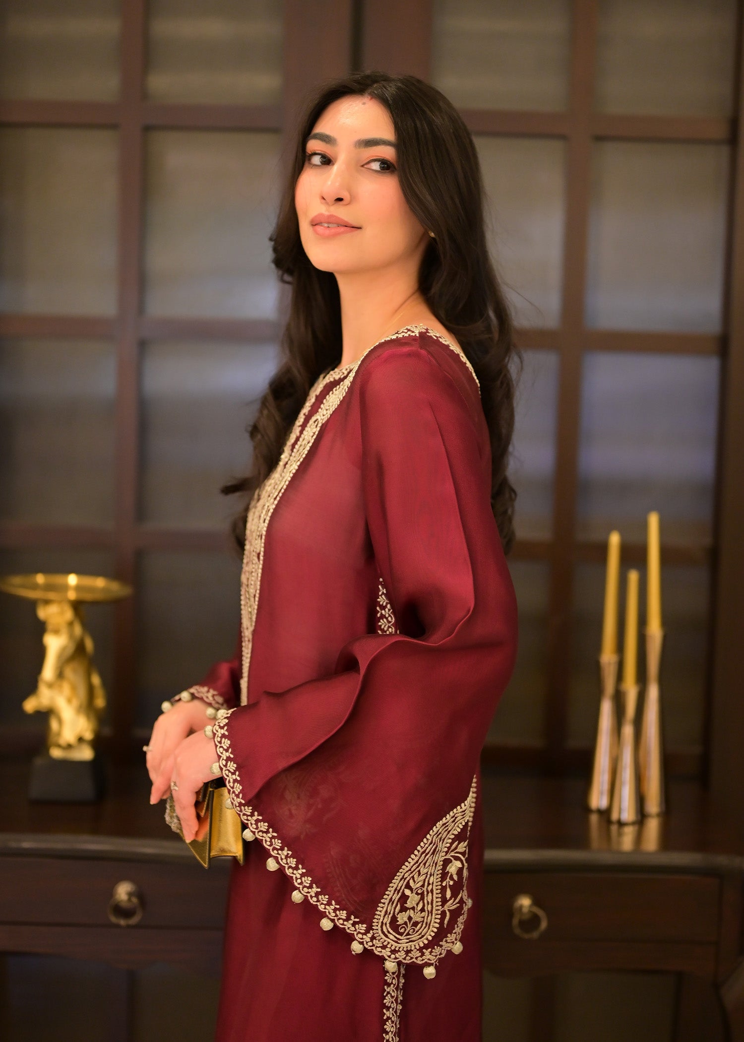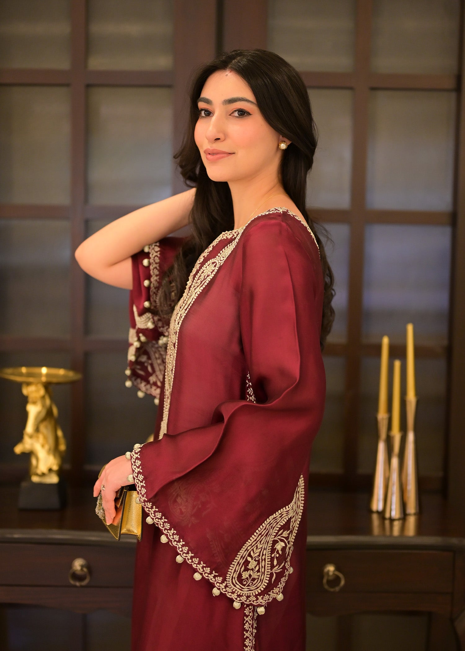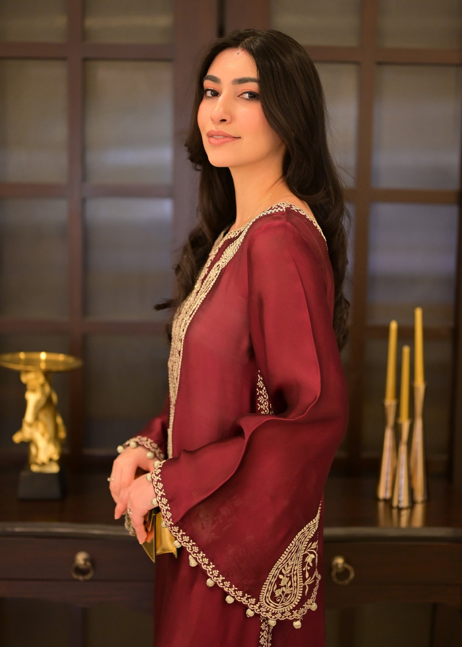 Ce somptueux caftan bordeaux est un chef-d'œuvre d'élégance, confectionné dans la plus fine soie pure. Les broderies réalisées à la main témoignent du savoir-faire et de l'expertise de l'artisan, conférant à l'ensemble une touche de sophistication et de raffinement. La coupe des manches apporte une touche de modernité au caftan traditionnel, créant une silhouette unique et captivante. Les perles de zari, délicatement disposées, ajoutent une note luxueuse et poétique, captant la lumière et scintillant au moindre mouvement.