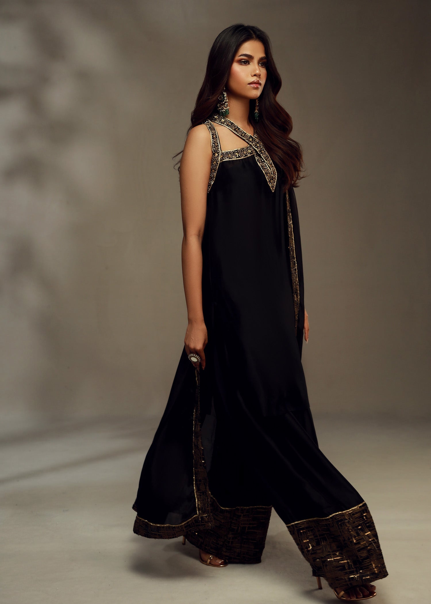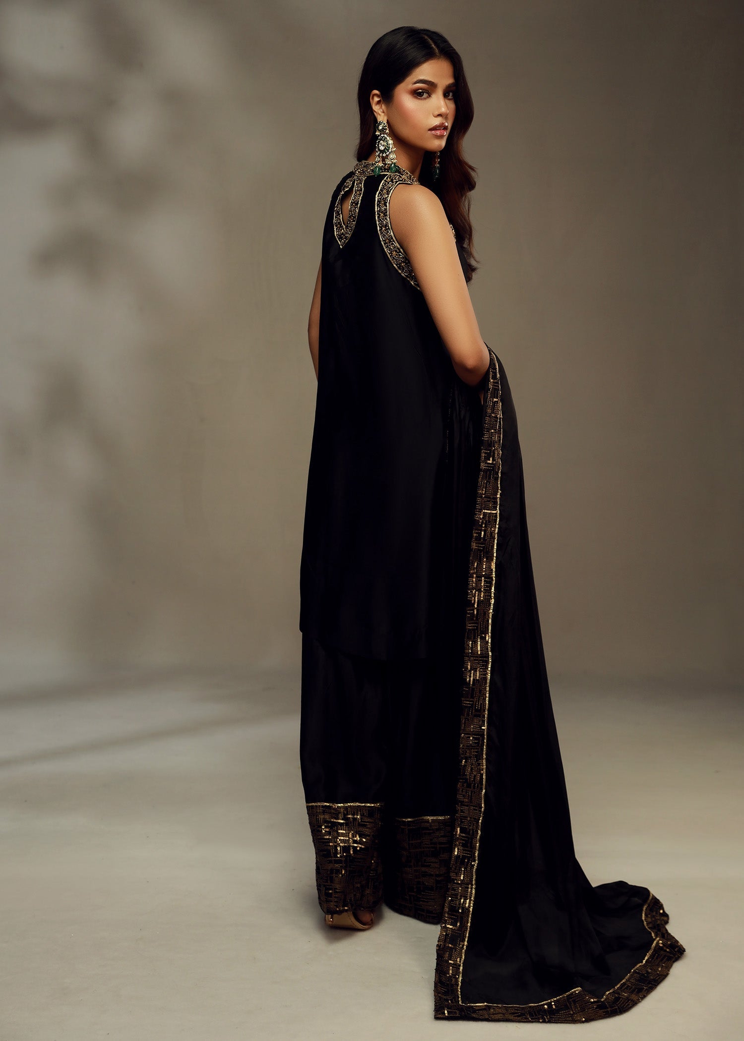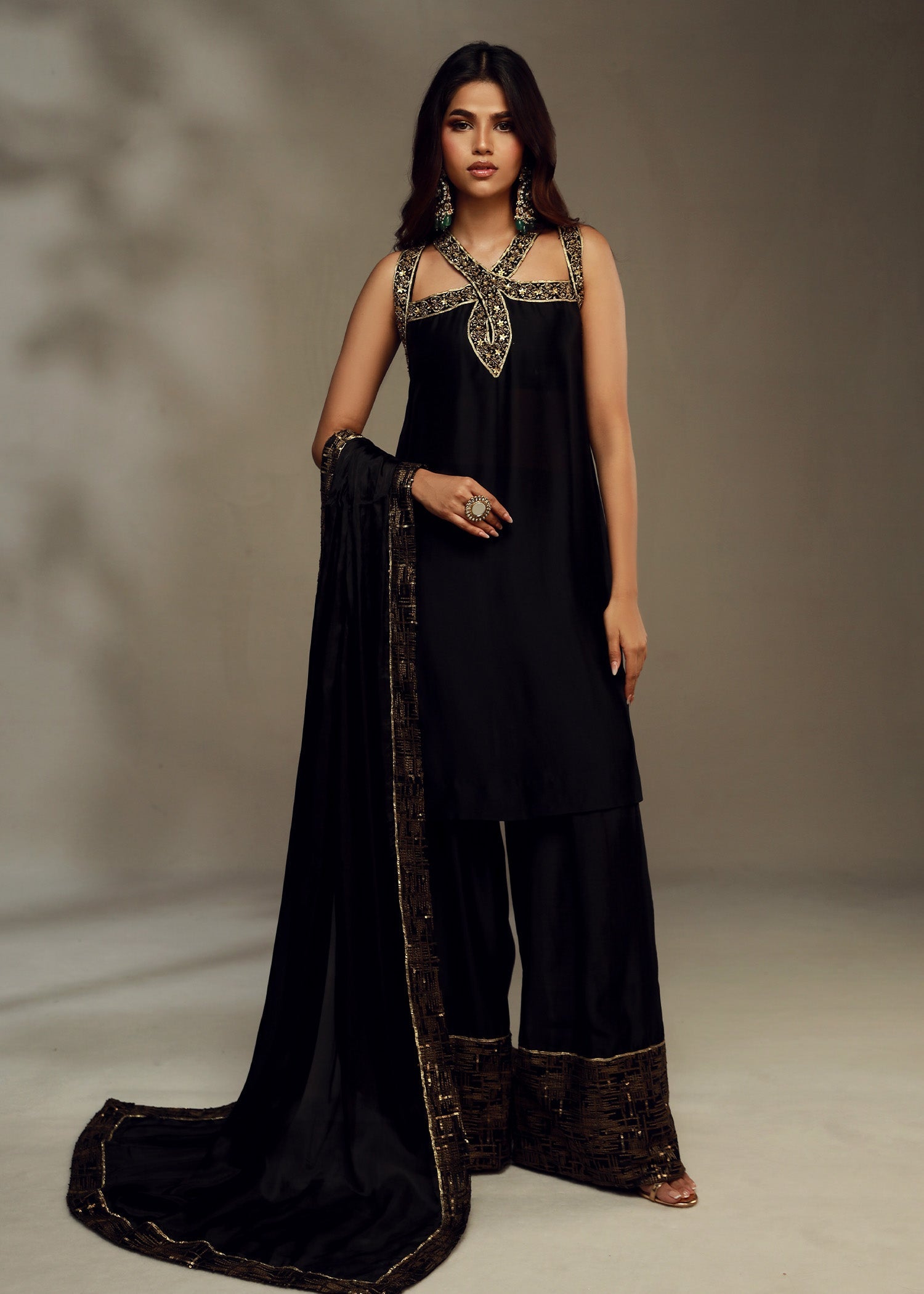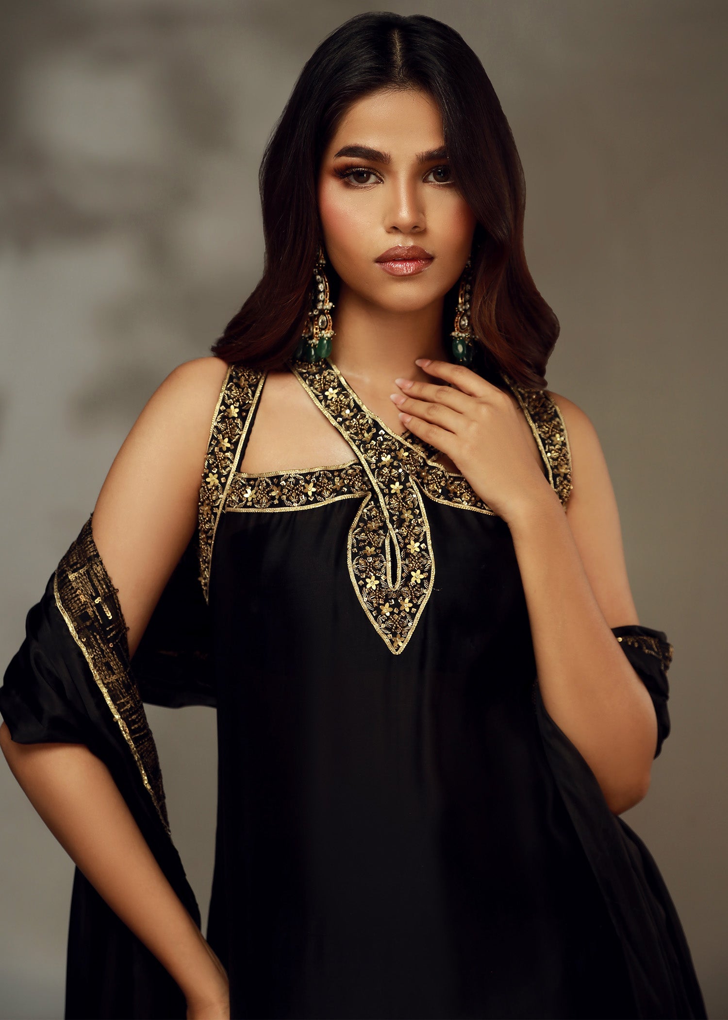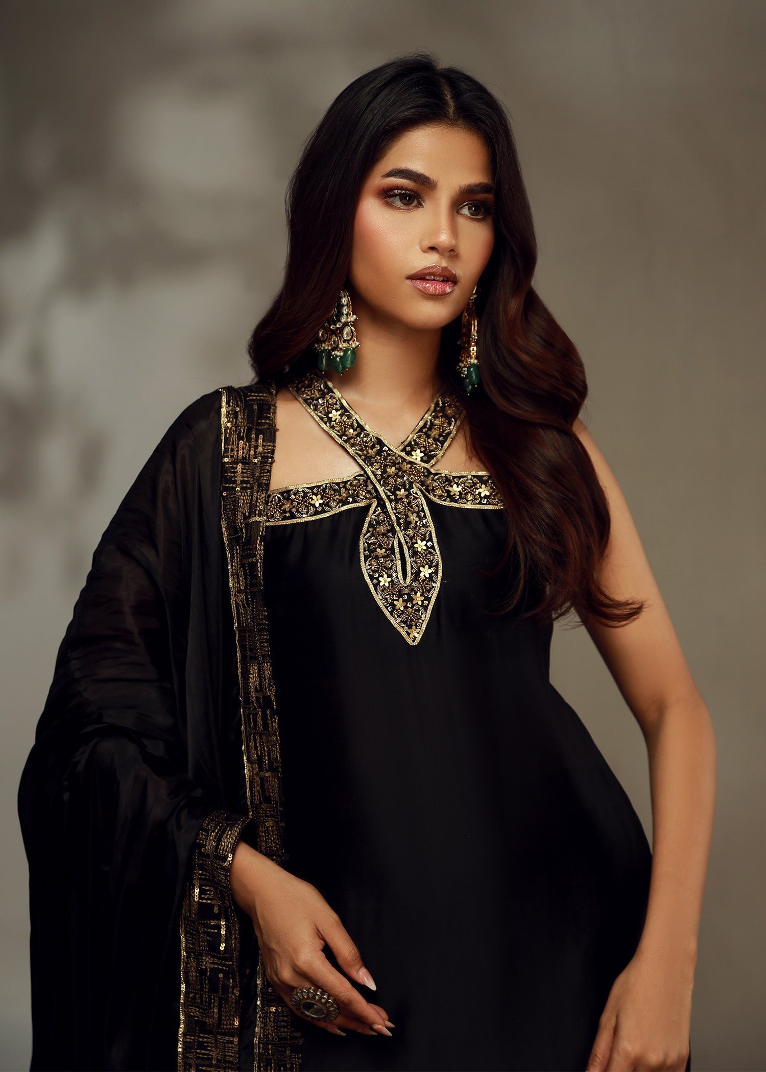 This exquisite outfit features a classic black pure silk shirt, often paired with a matching shalwar, and a stunning silk dupatta that adds a touch of elegance to the overall ensemble. The shirt is typically adorned with intricate zardozi work, adding a touch of sophistication and glamour. The beautiful cut neckline is fully embellished, making it a perfect choice for formal occasions.